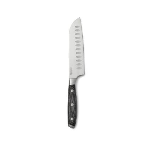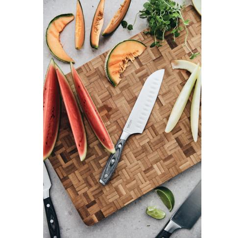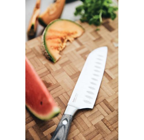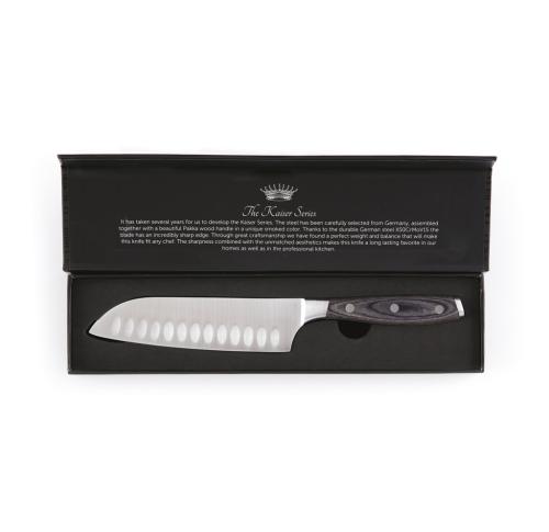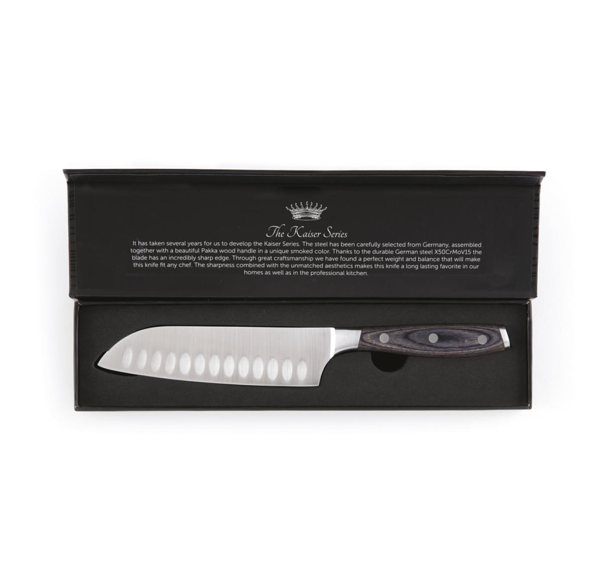 Santoku knife made of X50CrMoV15 German steel with a Pakkawood handle. The easy-grip handle and superb balance in the blade makes the knife comfortable and easy to work with. Size: 14 cm blade.