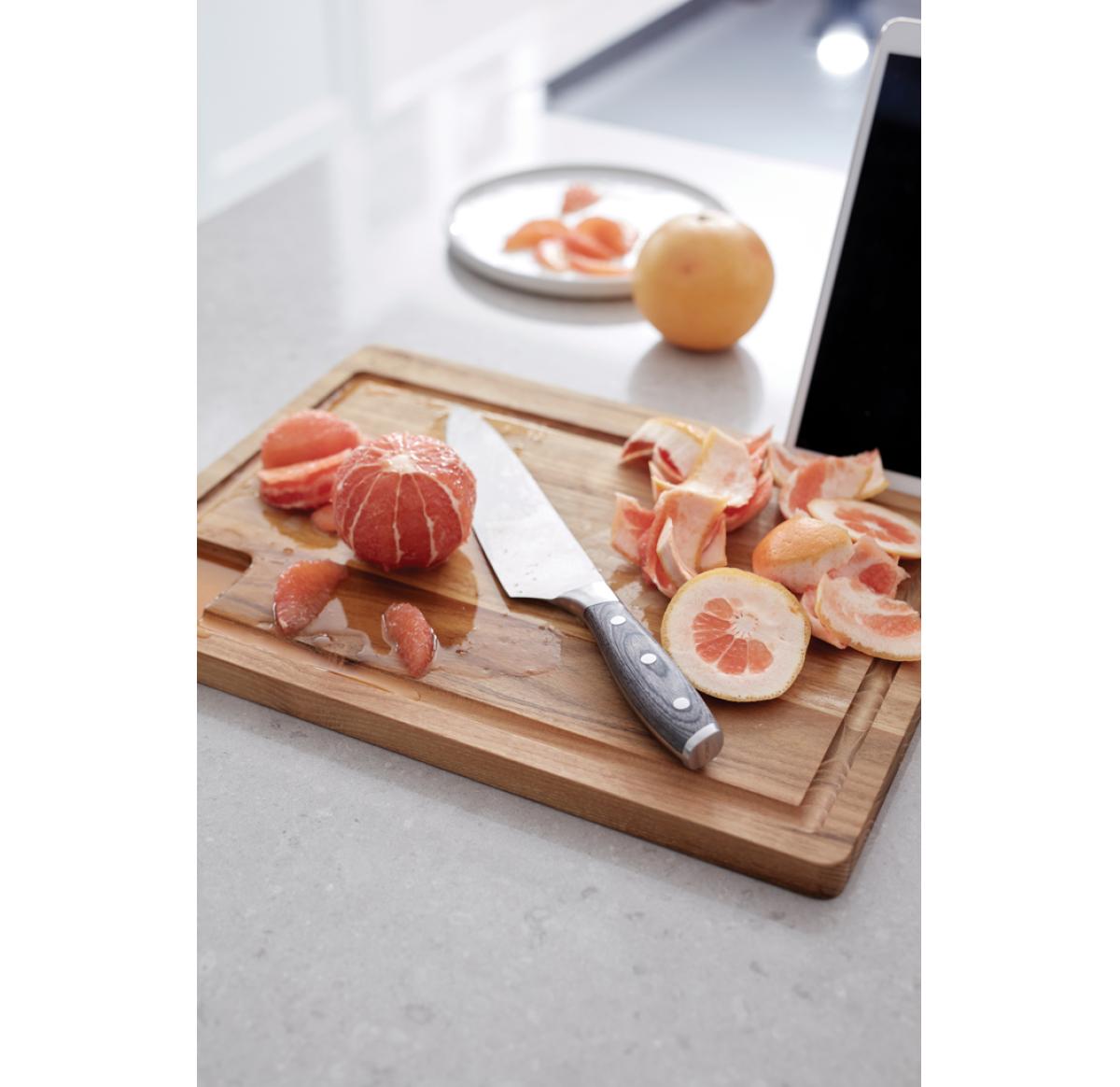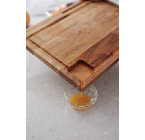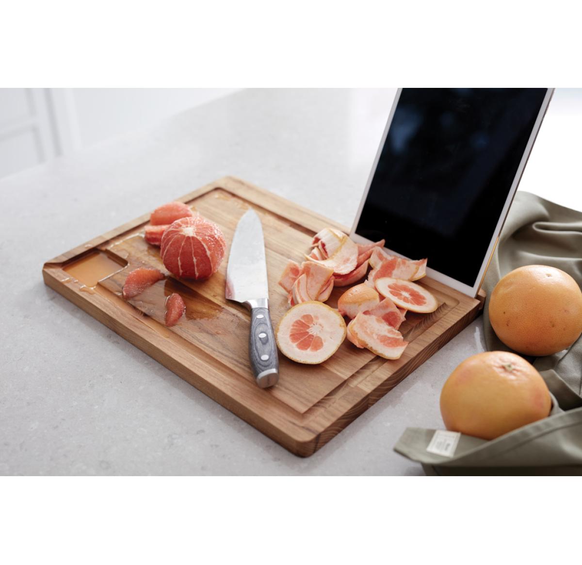 Cutting/serving board large enough for both cutting, preparing and serving. The board is provided with a handy holder for tablet or mobile phone, so you can easily use it while following your favourite recipes online. There is also a deep juice groove that runs along the whole board with a pouring spout avoiding unnecessary spillage. Made of FSC-certified teak.
