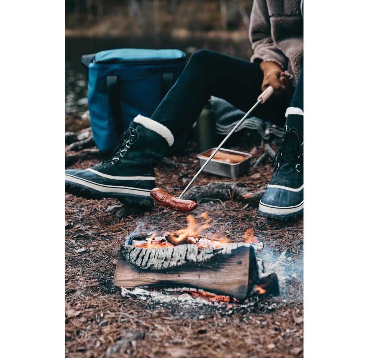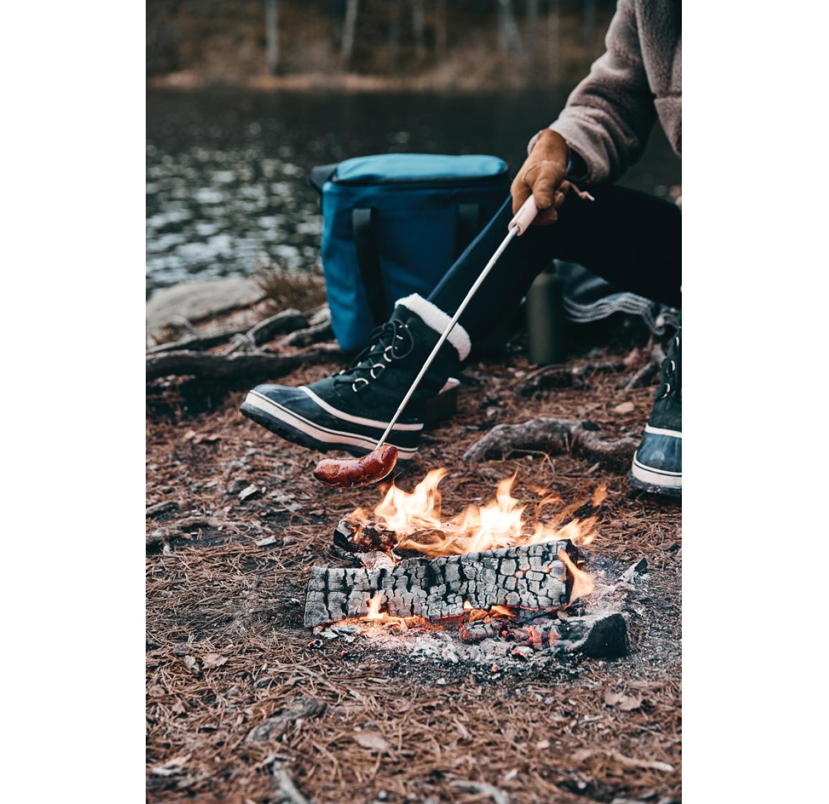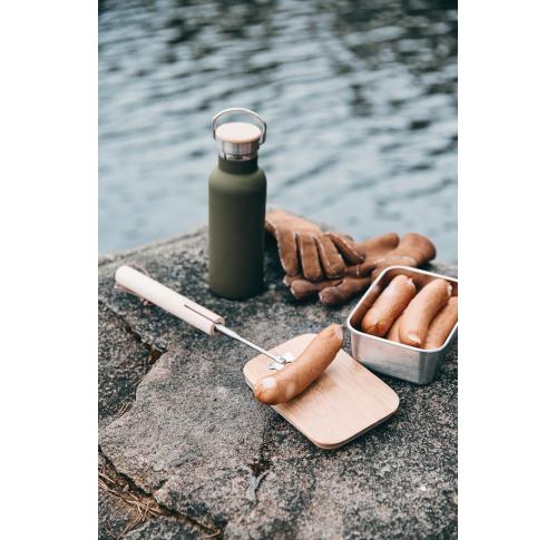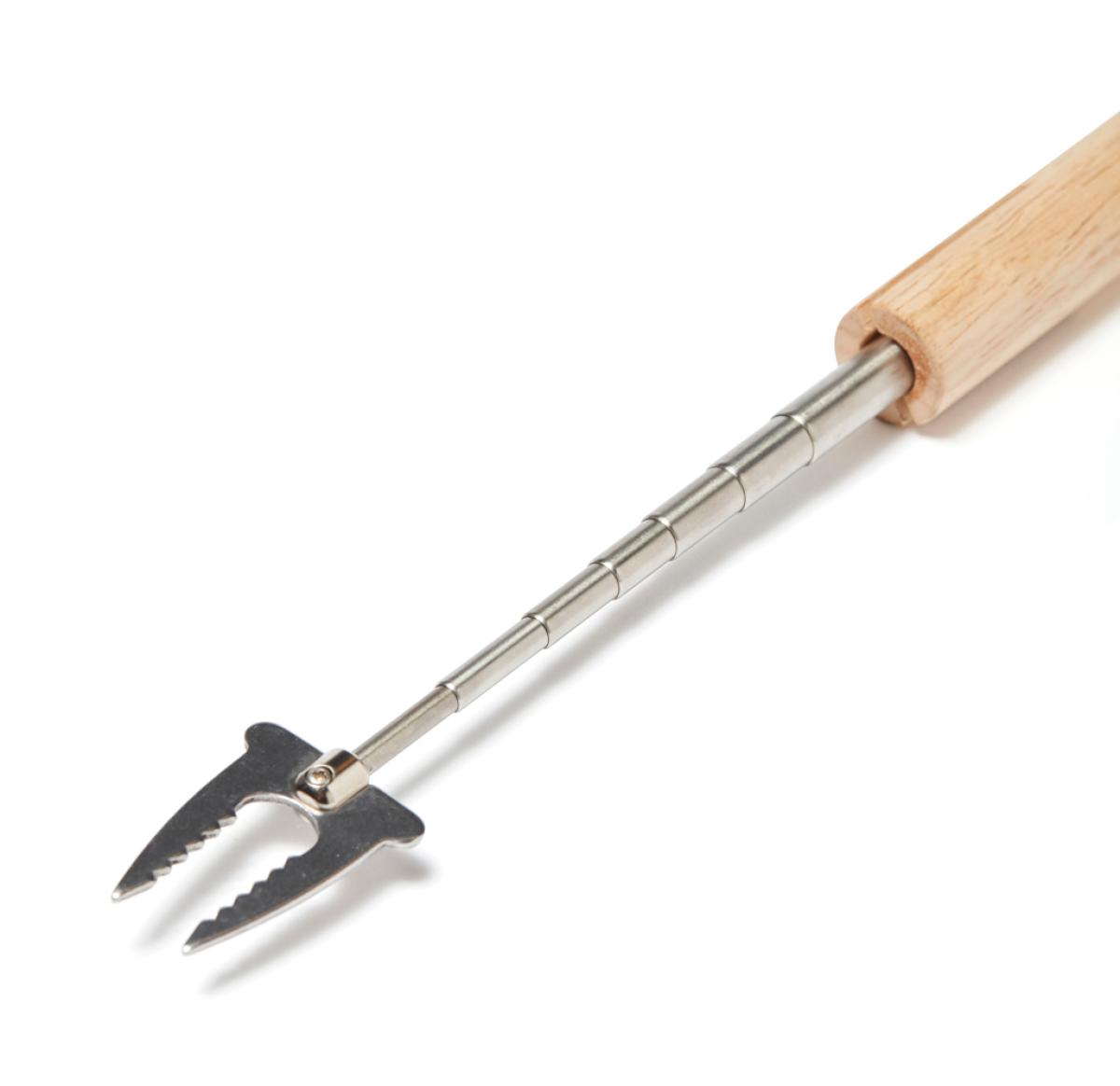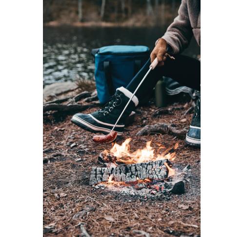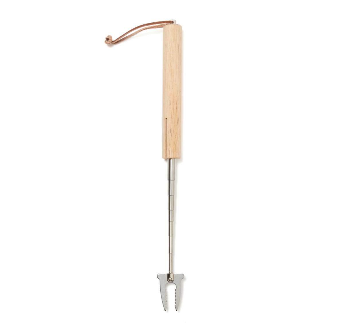 The grill stick is perfect for use over an open fire. The grill stick can be extended by means of a telescopic handle. Barbed fork and wooden handle. The barbs of the fork are designed so that what you are grilling is firmly attached to the stick, preventing food from getting into the grill or fire. Practical leather cord for hanging up. Extended length: approx. 70 cm.