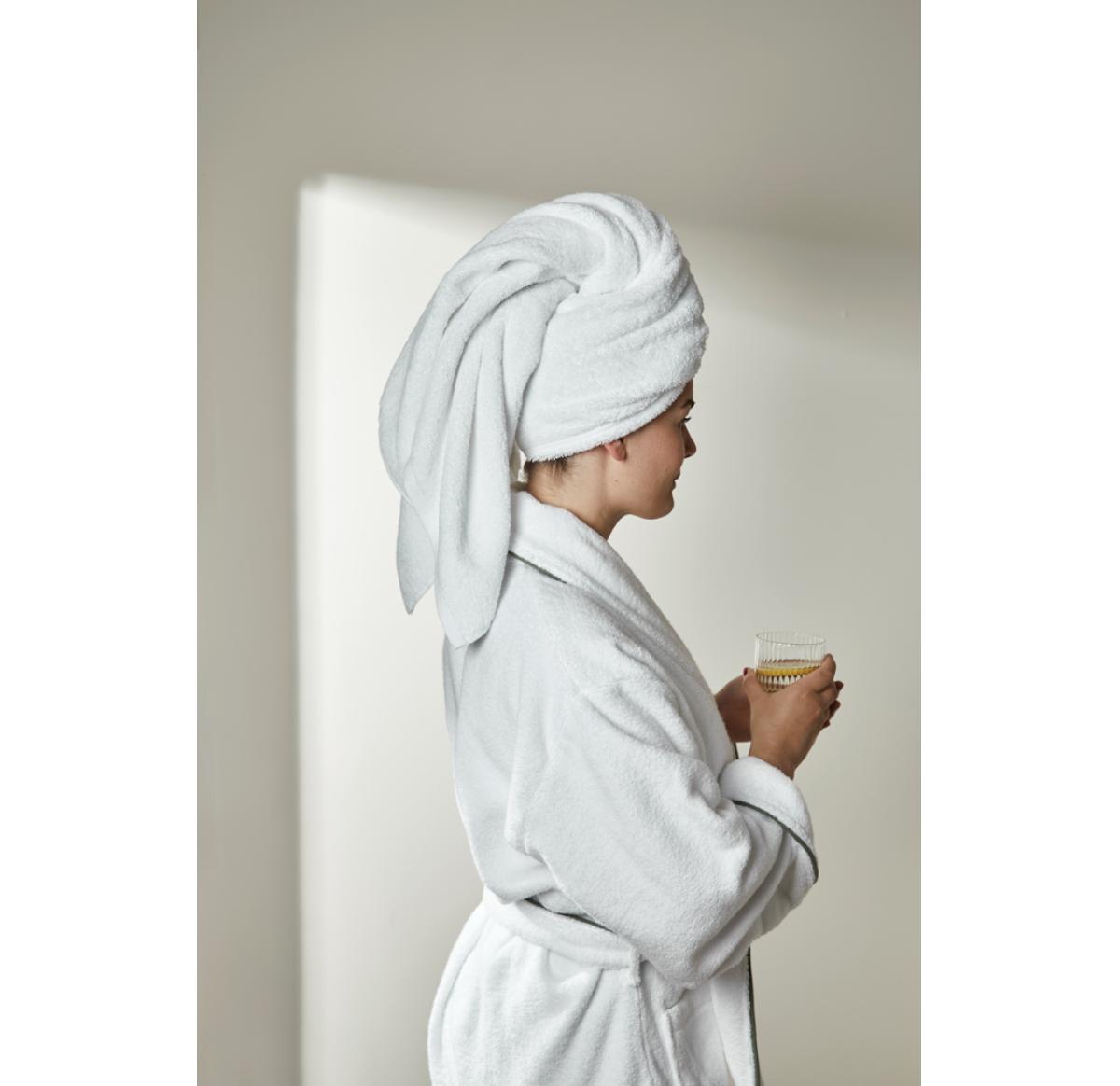 Luxurious robe in 100% cotton. The robe is a classic model with an extra wide collar and belt at the waist. It also has several nice details, such as enclosed seams and contrasting piping on the collar. Made of a long cotton fibre with untwisted threads. The result is an incredibly soft robe that you'll never want to take off.