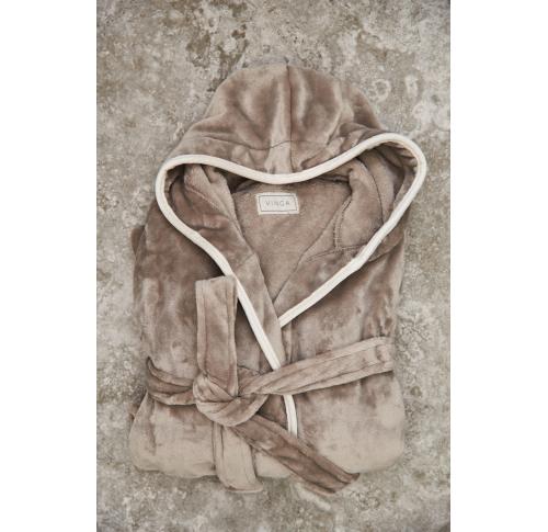 Soft, cosy robe in luxury plush with a large hood and decorative piping. Two front pockets and a waist belt. The robe is made from 70% recycled material from PET bottles. We don't like to transport air, so we've chosen to vacuum-pack this robe to reduce our carbon footprint. OEKO-TEX Standard 100 means that the robe's material meets multiple product safety criteria.