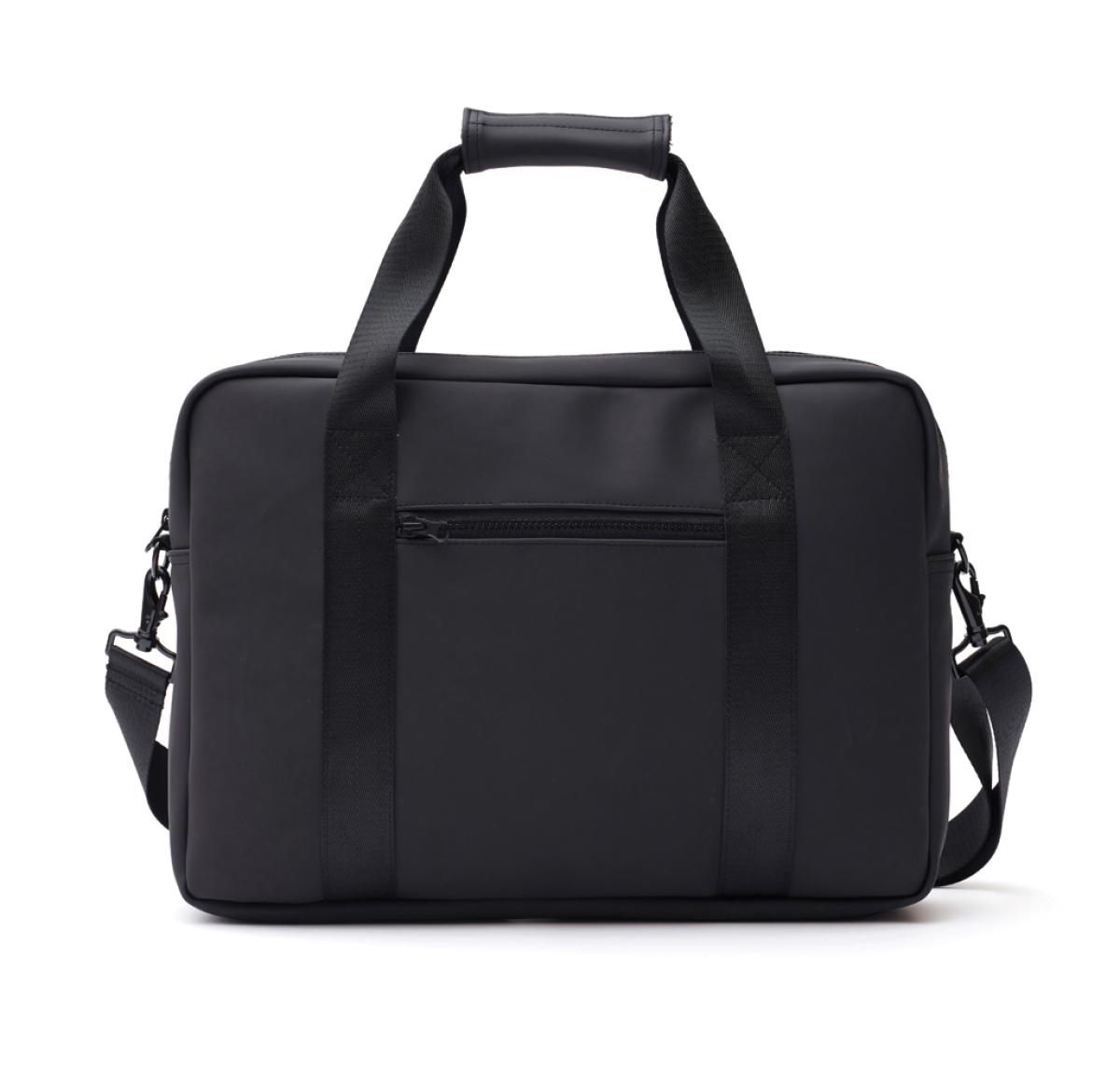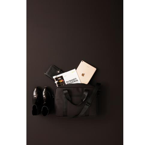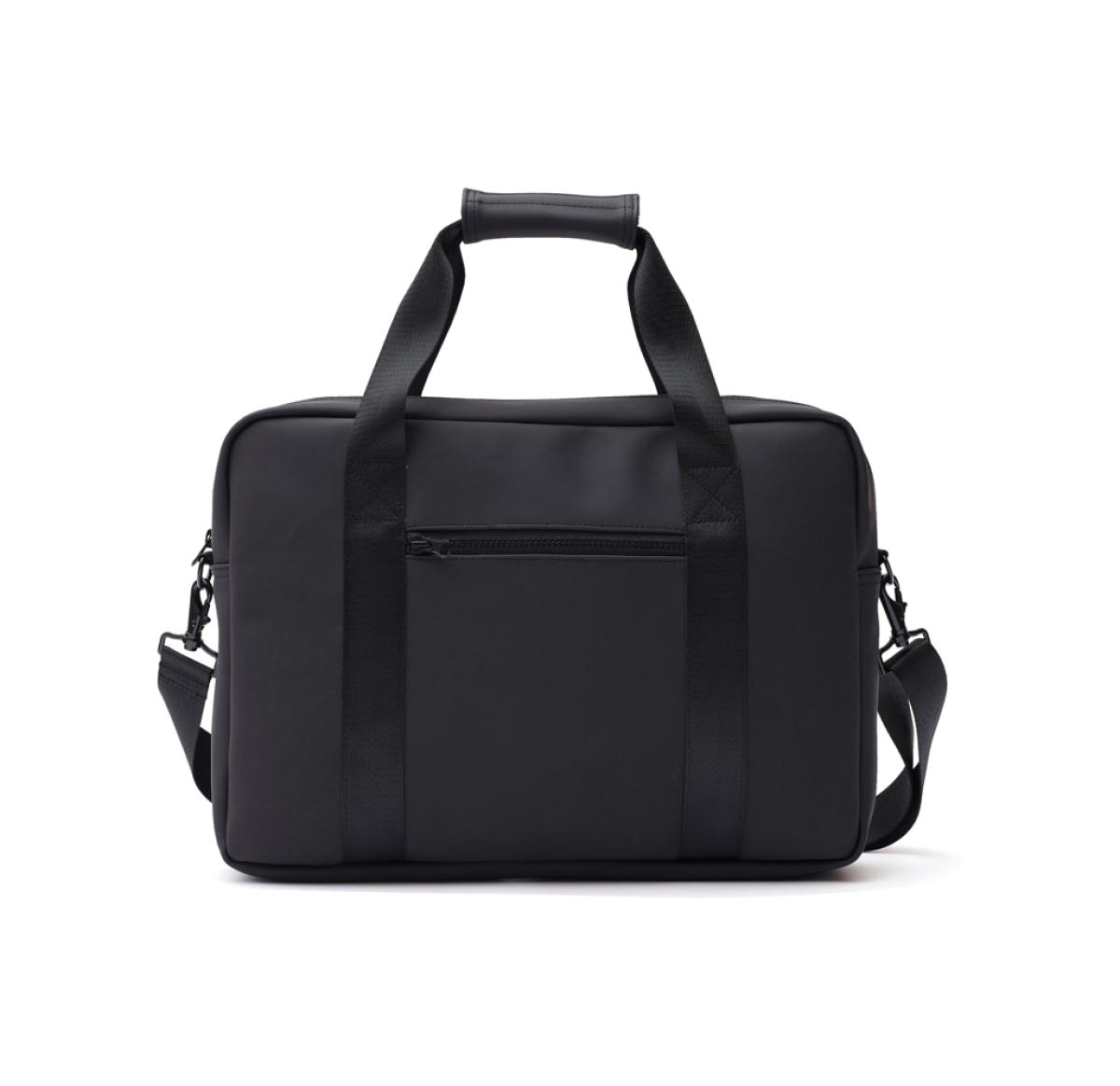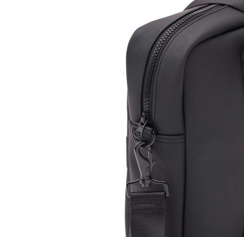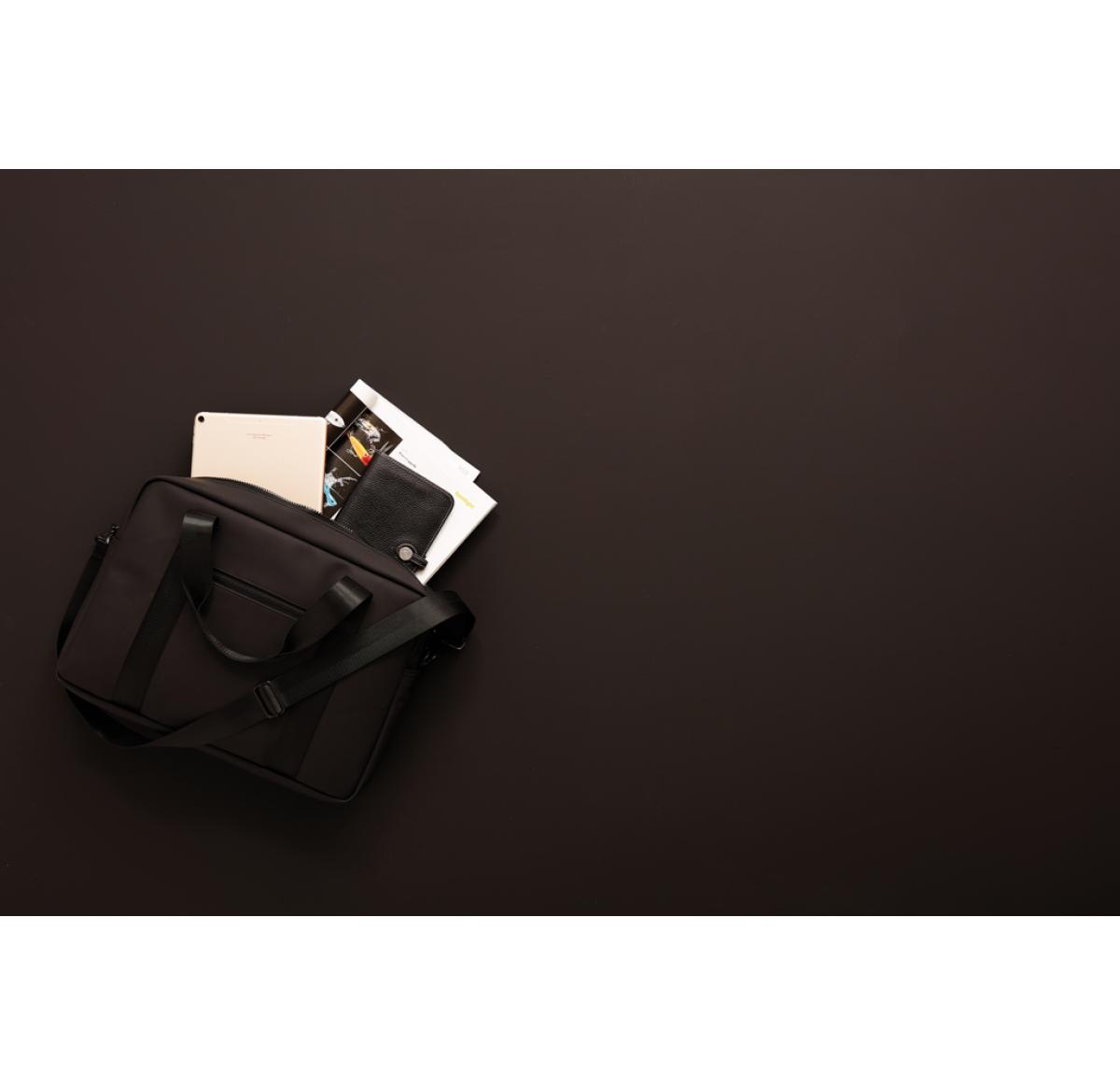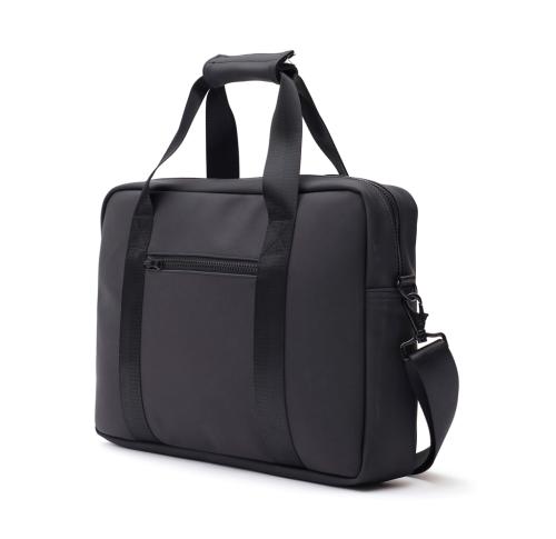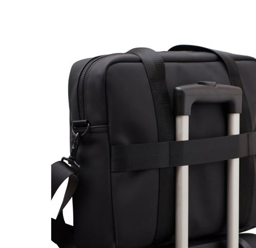 Modern and clean design computerbag. Function and form come together, besides the ordinary computer pocket this bag also has place for pens, documents and other belongings. The bag is produced in a water repellent material, with both shoulder strap and carry handles. It also includes an attached band on the reverse, so it fits your trolley when travelling.