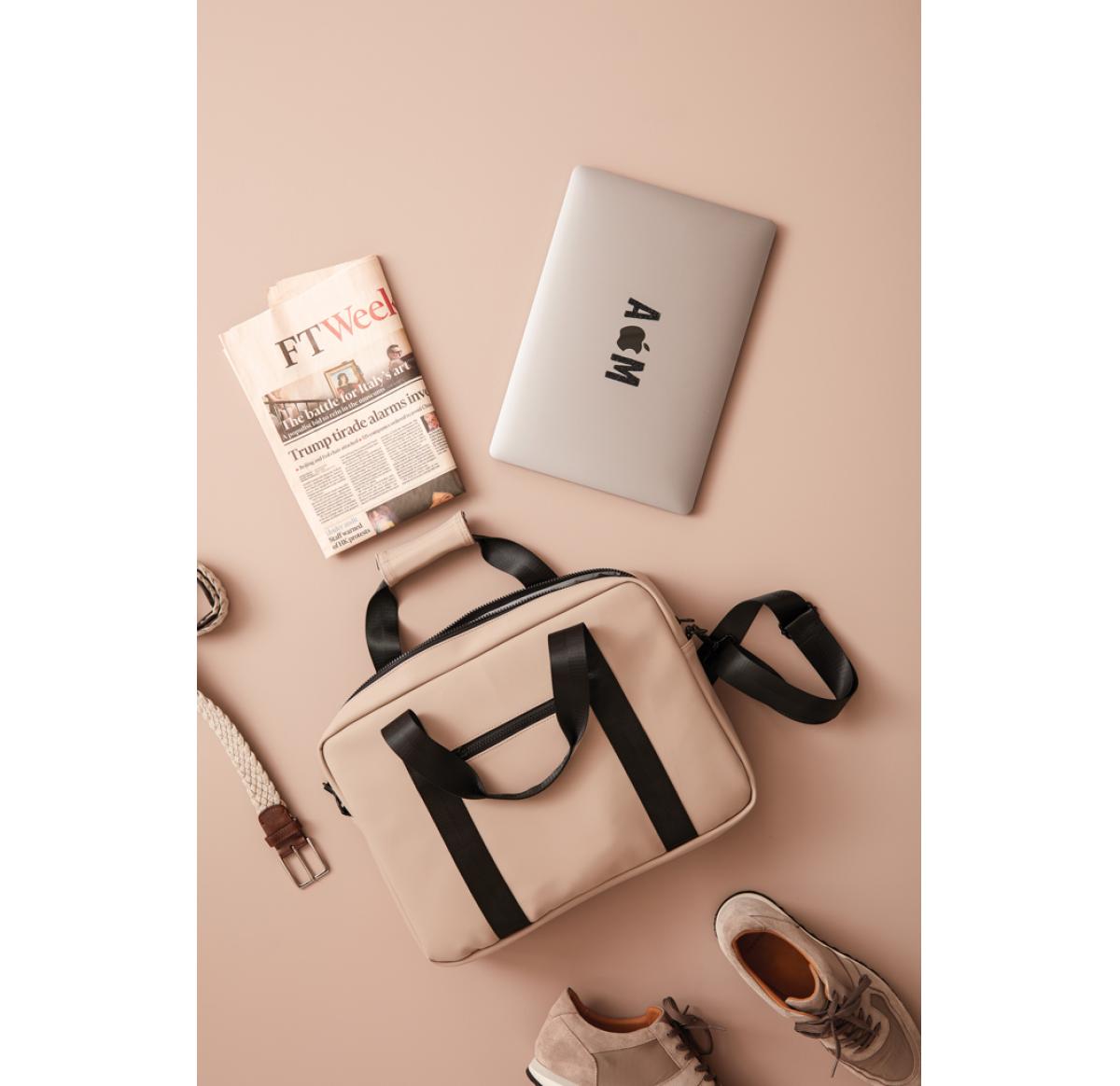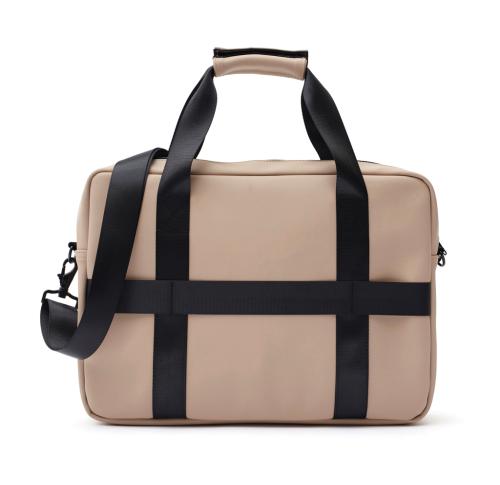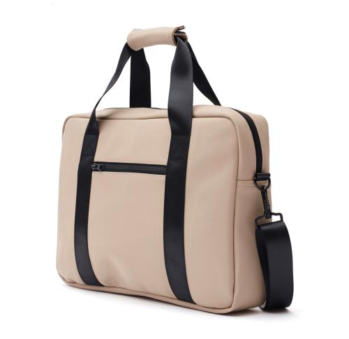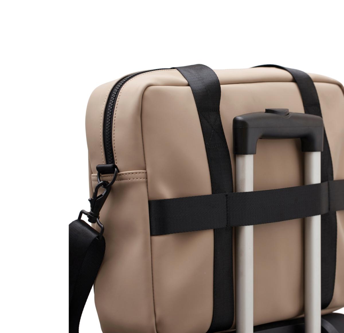 Modern and clean design computerbag. Function and form come together, besides the ordinary computer pocket this bag also has place for pens, documents and other belongings. The bag is produced in a water repellent material, with both shoulder strap and carry handles. It also includes an attached band on the reverse, so it fits your trolley when travelling.