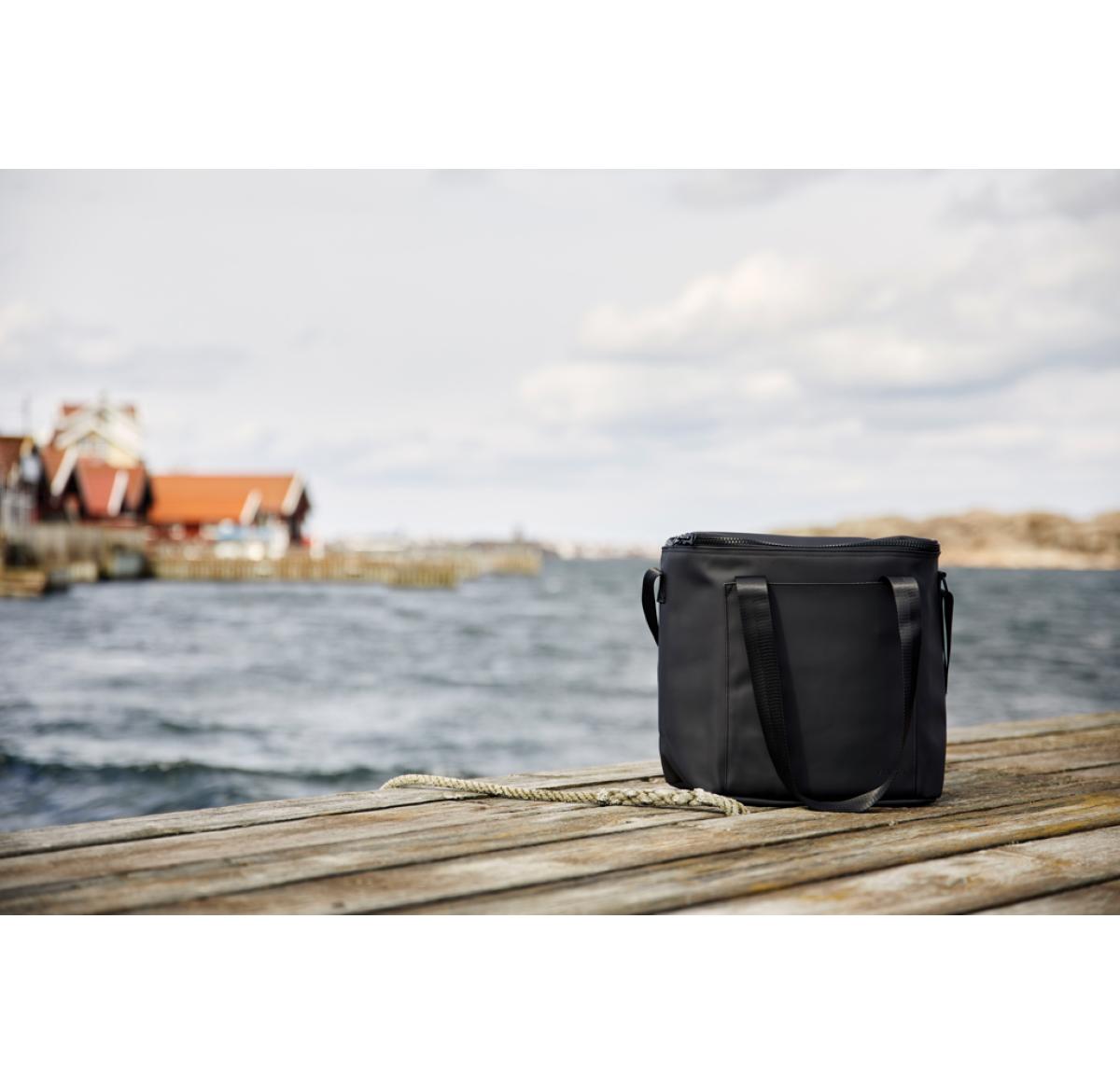Minimalist cooler bag, made of water-repellent PU nubuck. Long handles and adjustable shoulder strap for optimal comfort. The cooler bag is insulated with extra thick foam. The lining of the bag is made of so-called PEVA which is easy to keep clean and fresh. A cooler bag perfect for both the beach and a wilderness adventure.