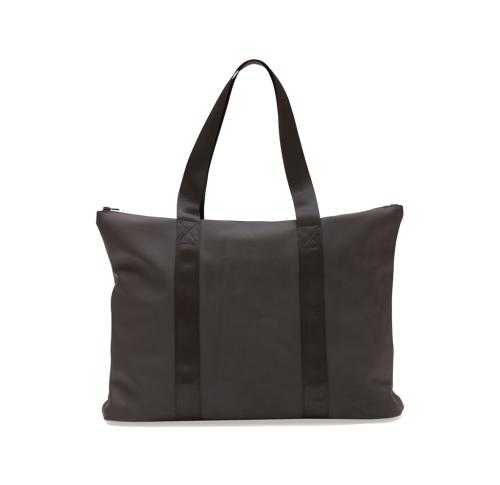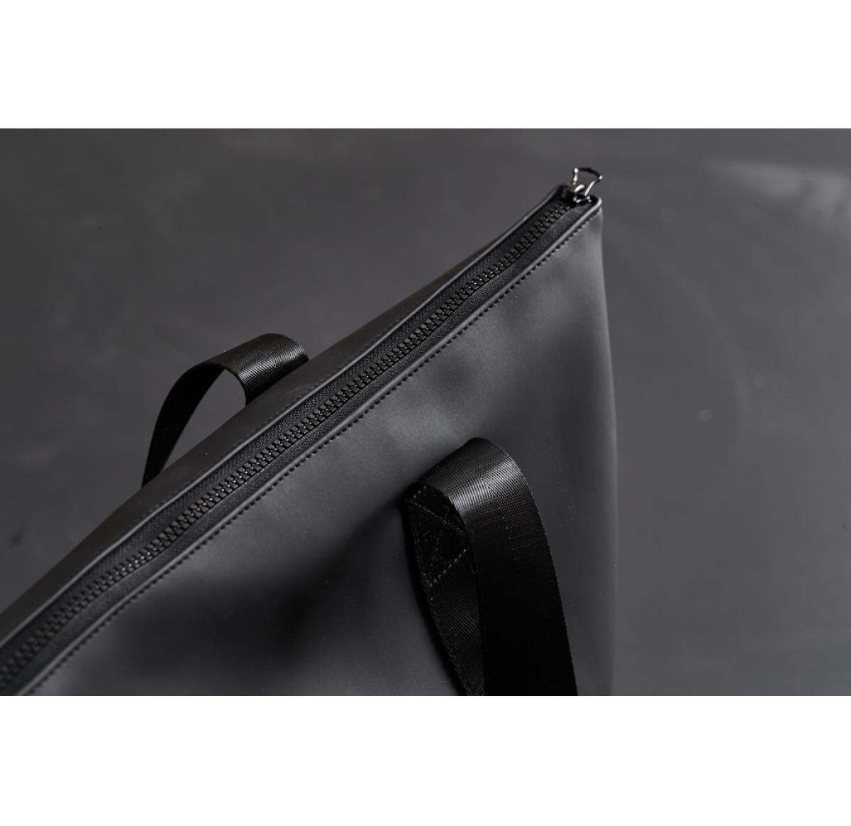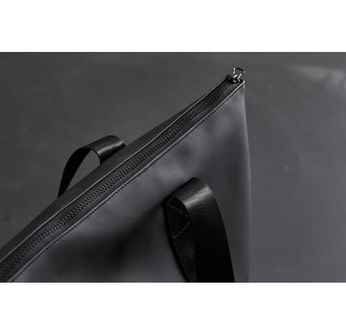 A small, sleek bag made of a lightweight, water-resistant nubuck PU fabric with a stylish matte exterior and a lightweight synthetic fabric interior. The main compartment closes with a zipper. Sturdy handles so you can fill the bag properly.