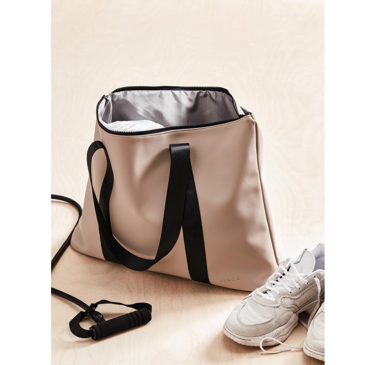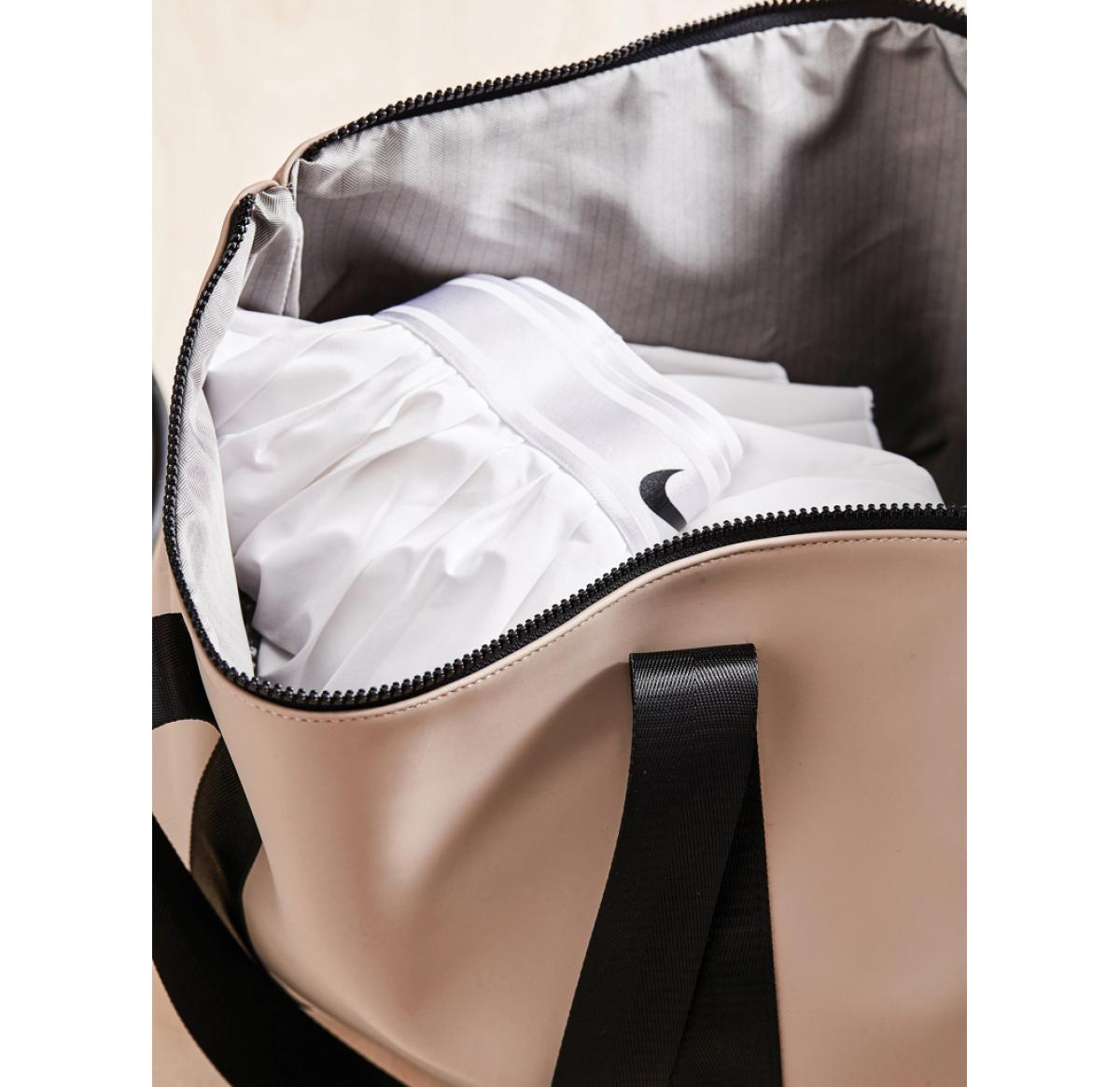 A small, sleek bag made of a lightweight, water-resistant nubuck PU fabric with a stylish matte exterior and a lightweight synthetic fabric interior. The main compartment closes with a zipper. Sturdy handles so you can fill the bag properly.