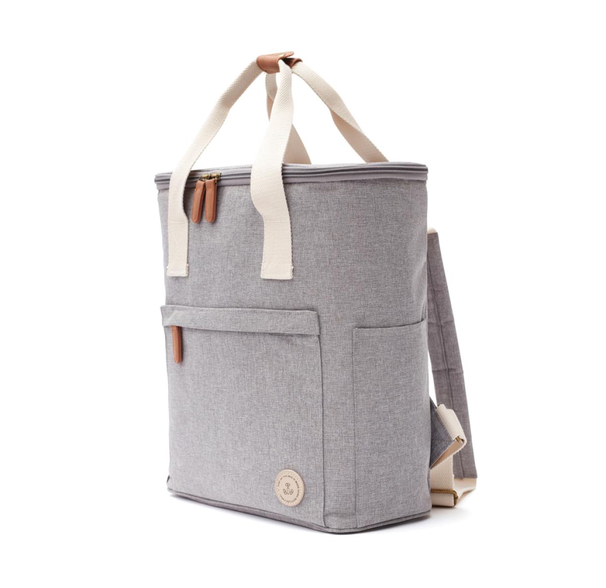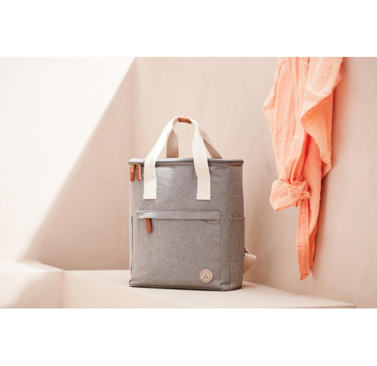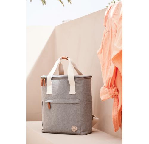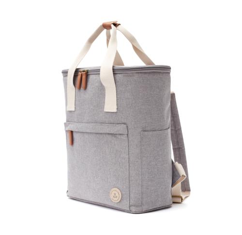 Cooler backpack that fits perfectly for both the smaller and larger get away. The cooler backpack has smaller pockets on both sides and one bigger pocket on the front. The main material is a recycled material made out of recycled PET bottles. It keeps cool well and is easy to clean with the larger opening.