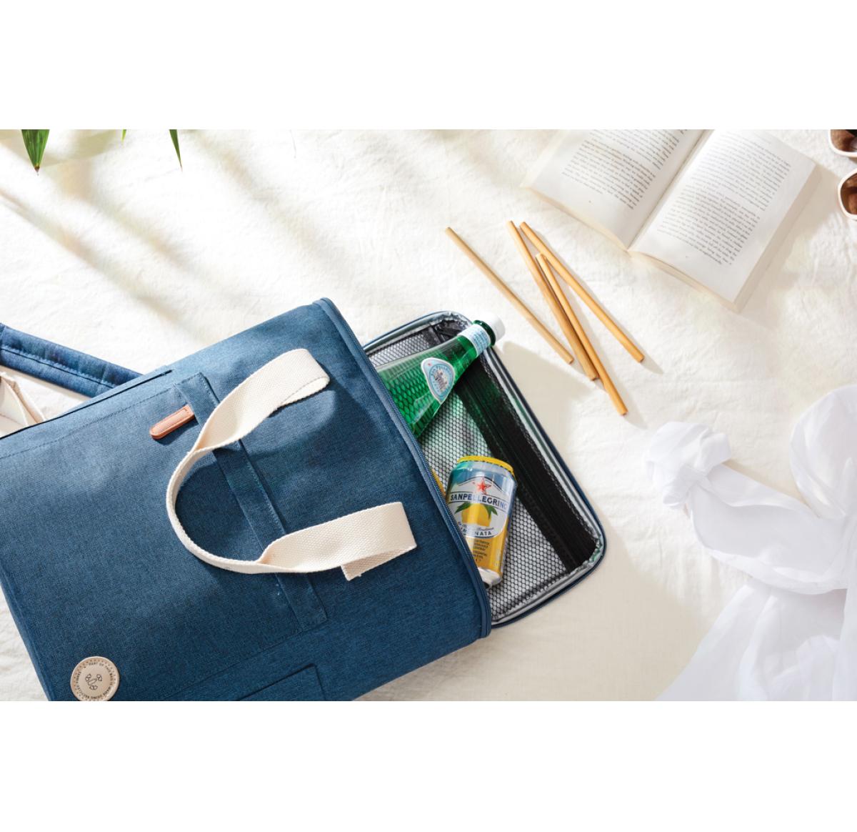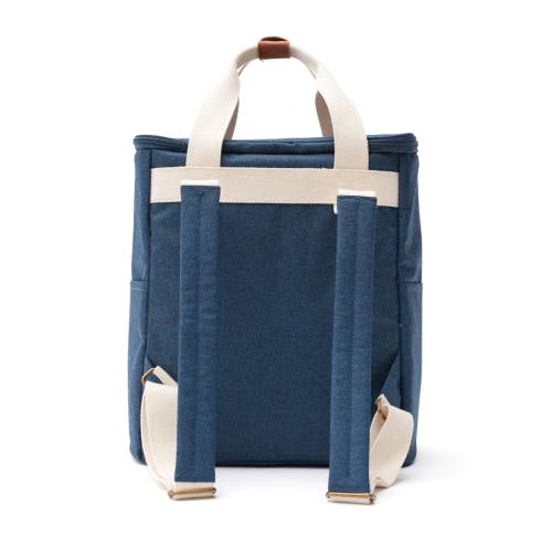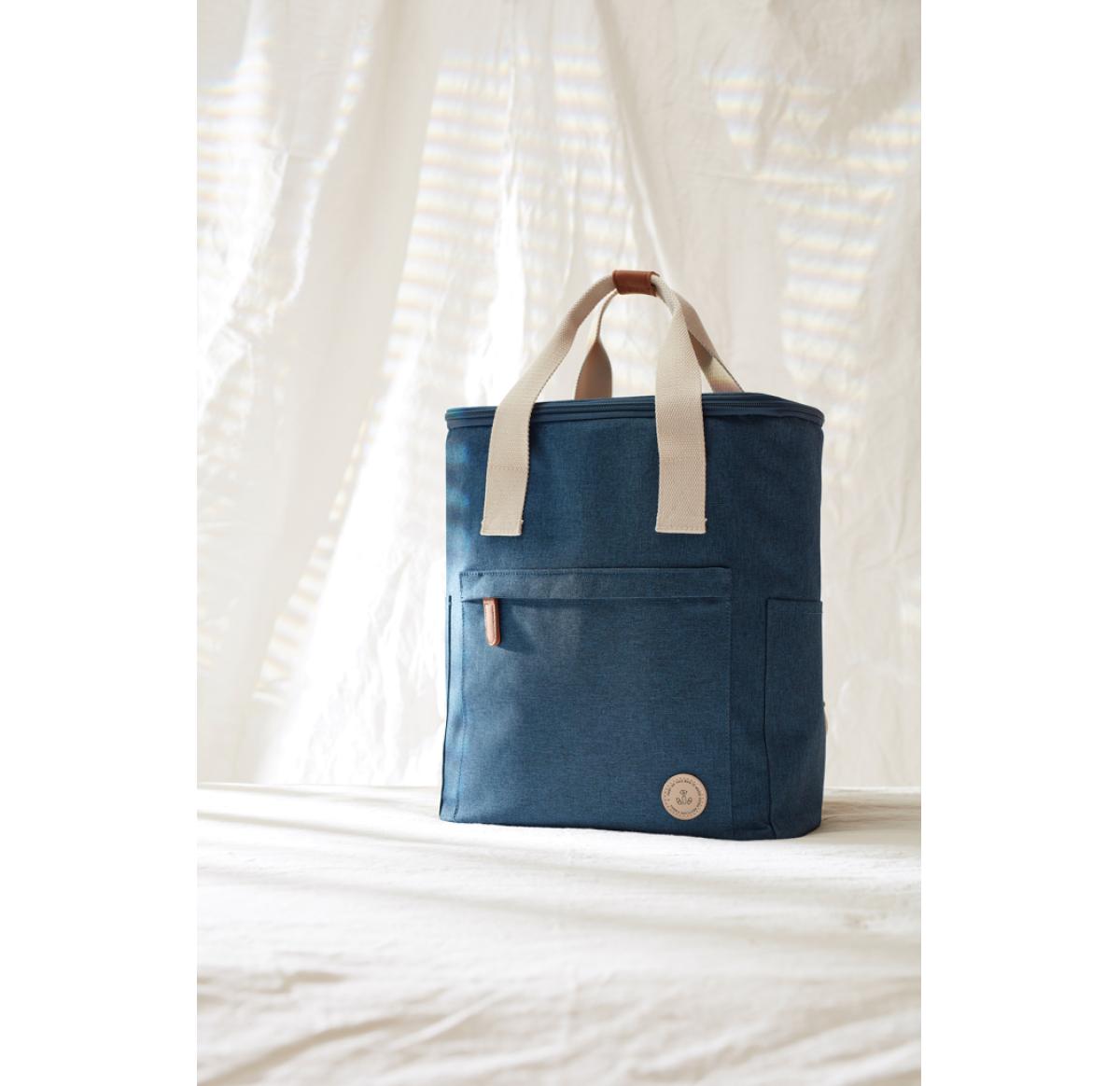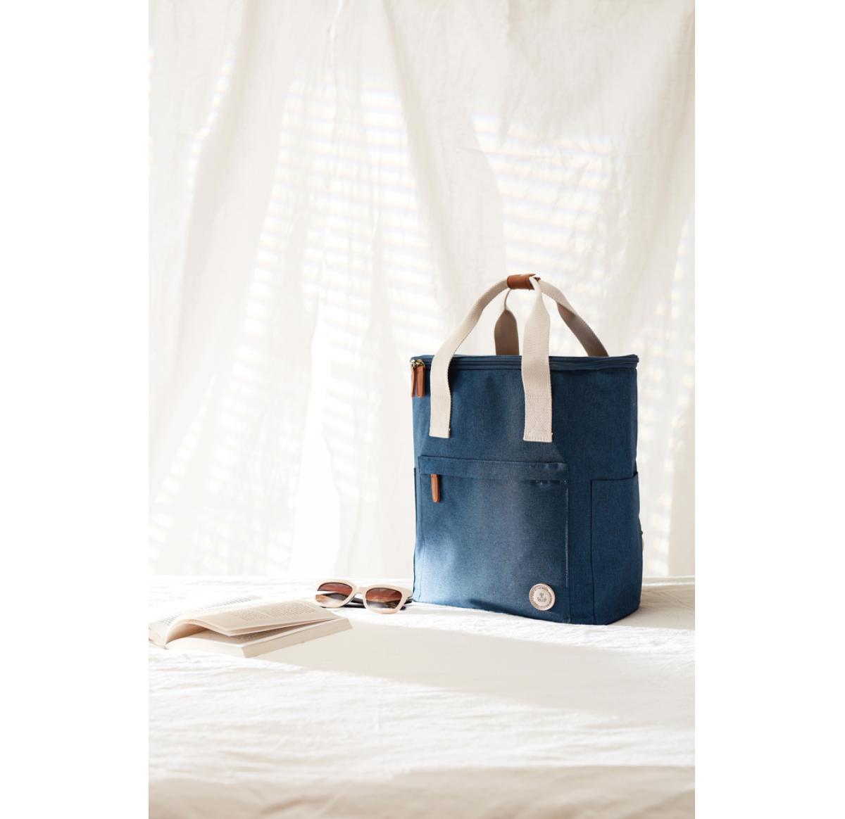 Cooler backpack that fits perfectly for both the smaller and larger get away. The cooler backpack has smaller pockets on both sides and one bigger pocket on the front. The main material is a recycled material made out of recycled PET bottles. It keeps cool well and is easy to clean with the larger opening.