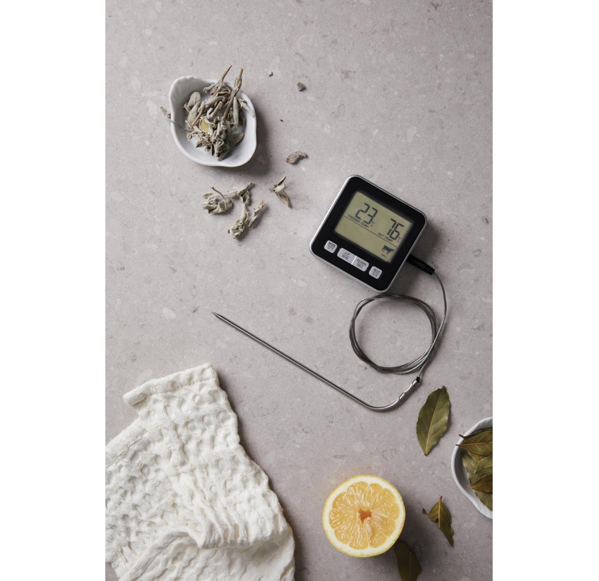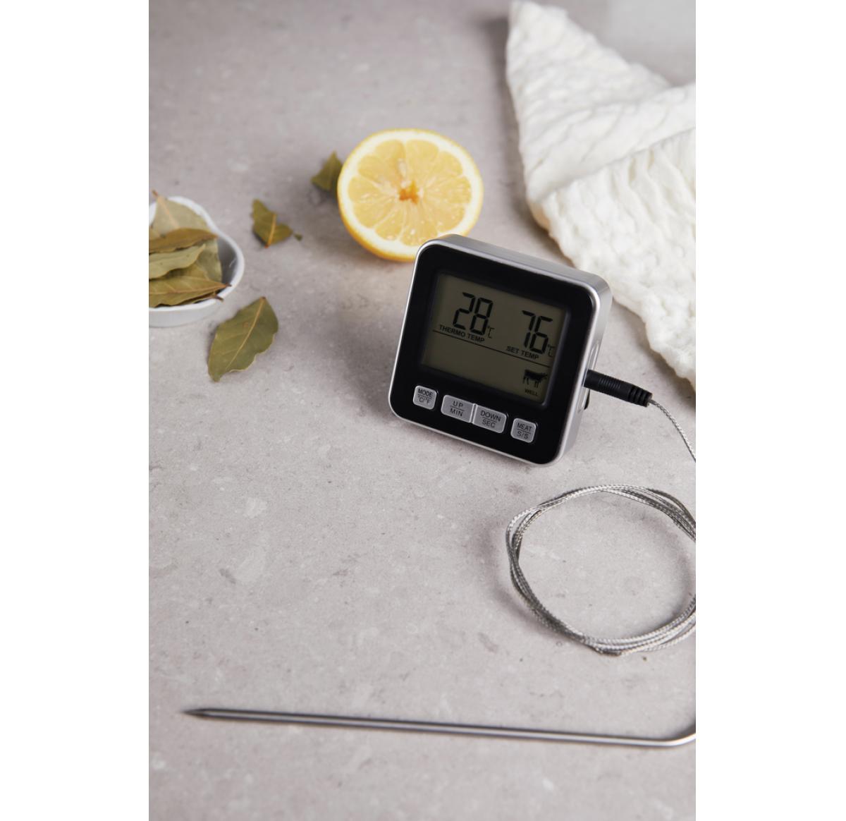 Serve the perfect meal with this handy cooking thermometer. Whether you're roasting succulent roast beef or baking a special cake, this feature-packed thermometer will prove invaluable in the kitchen, whether you are oven cooking, grilling or baking. Timer function and alarm function help you stay in control. The thermometer also displays Celcius and Farenheit so you can adjust it to suit your needs. No kitchen is complete without one.