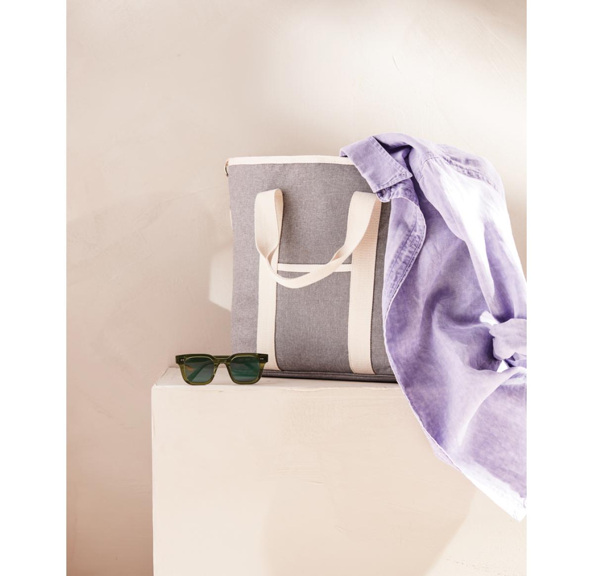 Cooler bag that is mottled tone by tone with details in imitation leather and cotton so that it is as beautiful as an ordinary bag and you can picnic in style. Made from 50% recycled material from PET bottles. There is also a small compartment on the outside of the cooler bag, providing space for other items as well. The thick PEVA padding ensures that the cold is retained for a long time. It is also easy to clean and dry after use. With an adjustable shoulder strap and double handle, you have different ways to carry the cooler bag.