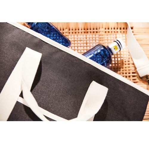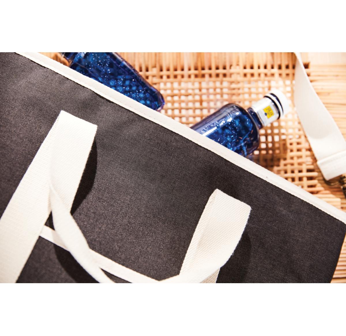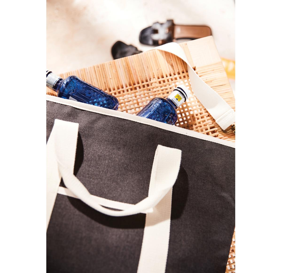 Cooler bag that is mottled tone by tone with details in imitation leather and cotton so that it is as beautiful as an ordinary bag and you can picnic in style. Made from 50% recycled material from PET bottles. There is also a small compartment on the outside of the cooler bag, providing space for other items as well. The thick PEVA padding ensures that the cold is retained for a long time. It is also easy to clean and dry after use. With an adjustable shoulder strap and double handle, you have different ways to carry the cooler bag.