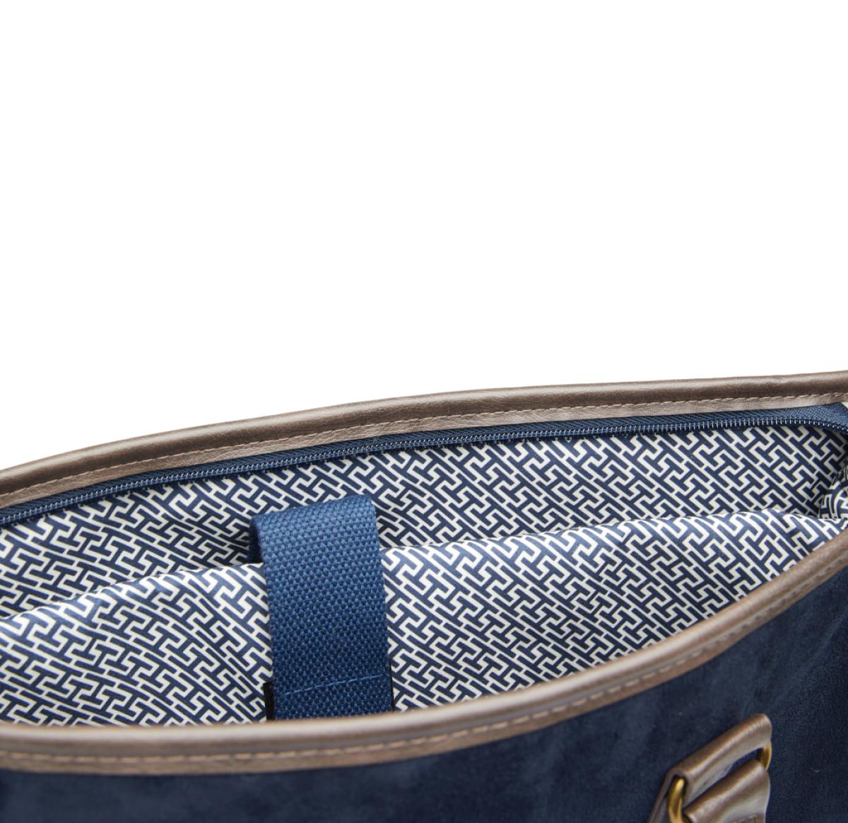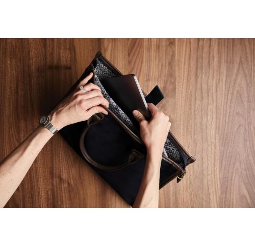 A smart padded computer case suitable for a 15" laptop. Look stylish and feel comfortable with this high quality vegan leather design, completed with an adjustable shoulder strap and fine metal details in a brass finish. This slim and elegant case will blend seamlessly with your outfit - business has never looked more chic!