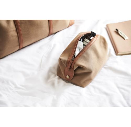 Stylish washbag from the Sloane series. Sloane is made from recycled polyester, woven to mimic a durable twill canvas. The exterior fabric is 100% recycled polyester from PET bottles. Exclusive details made of faux leather in so-called waterborne PU. It is a more gentle faux leather that primarily uses water to replace strong solvents in the manufacturing process. This process is better for both nature and, above all, for the workers in the factory. A stylish wash bag completes the well-dressed image when travelling, hopefully becoming a good companion for many years.