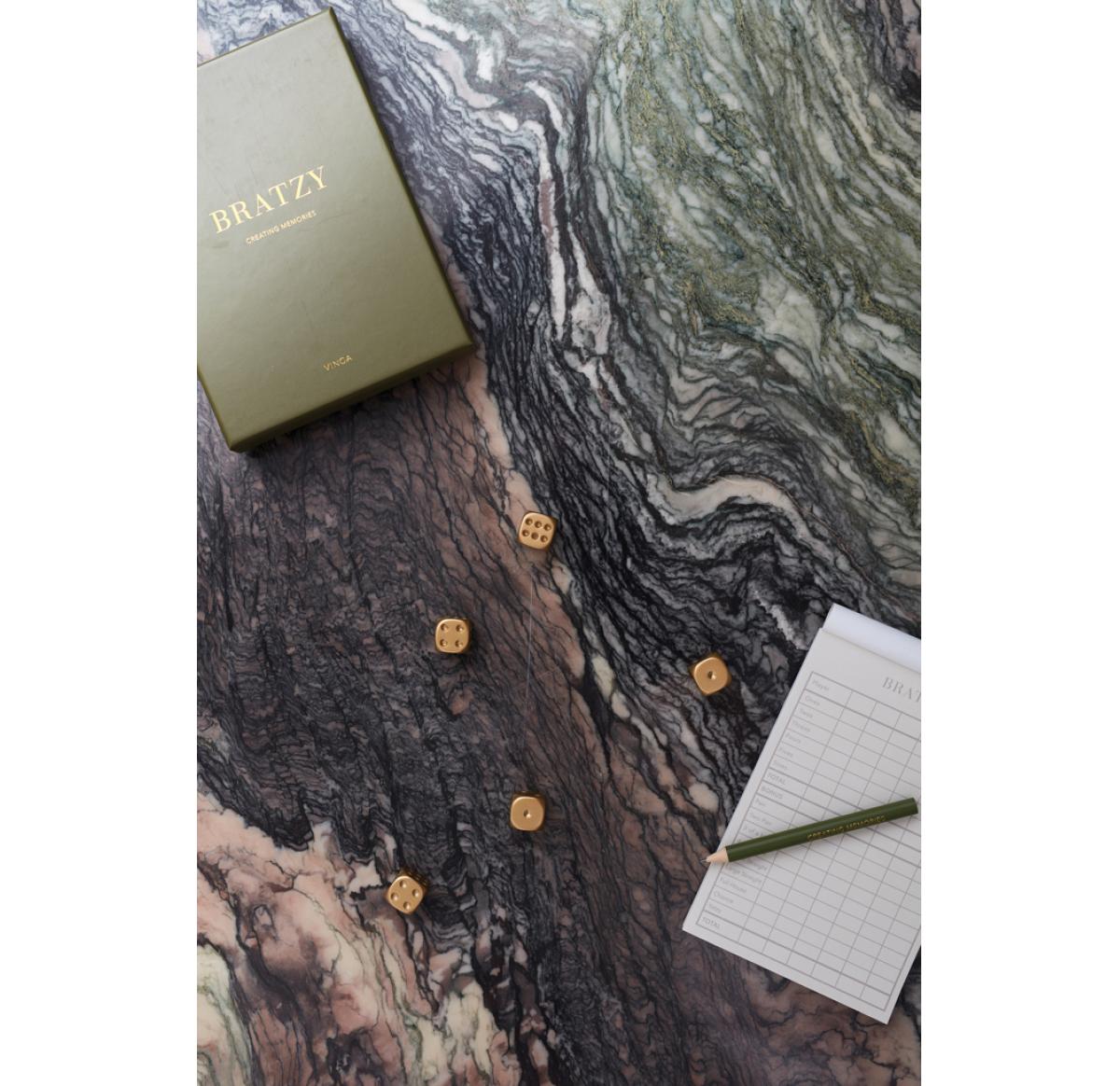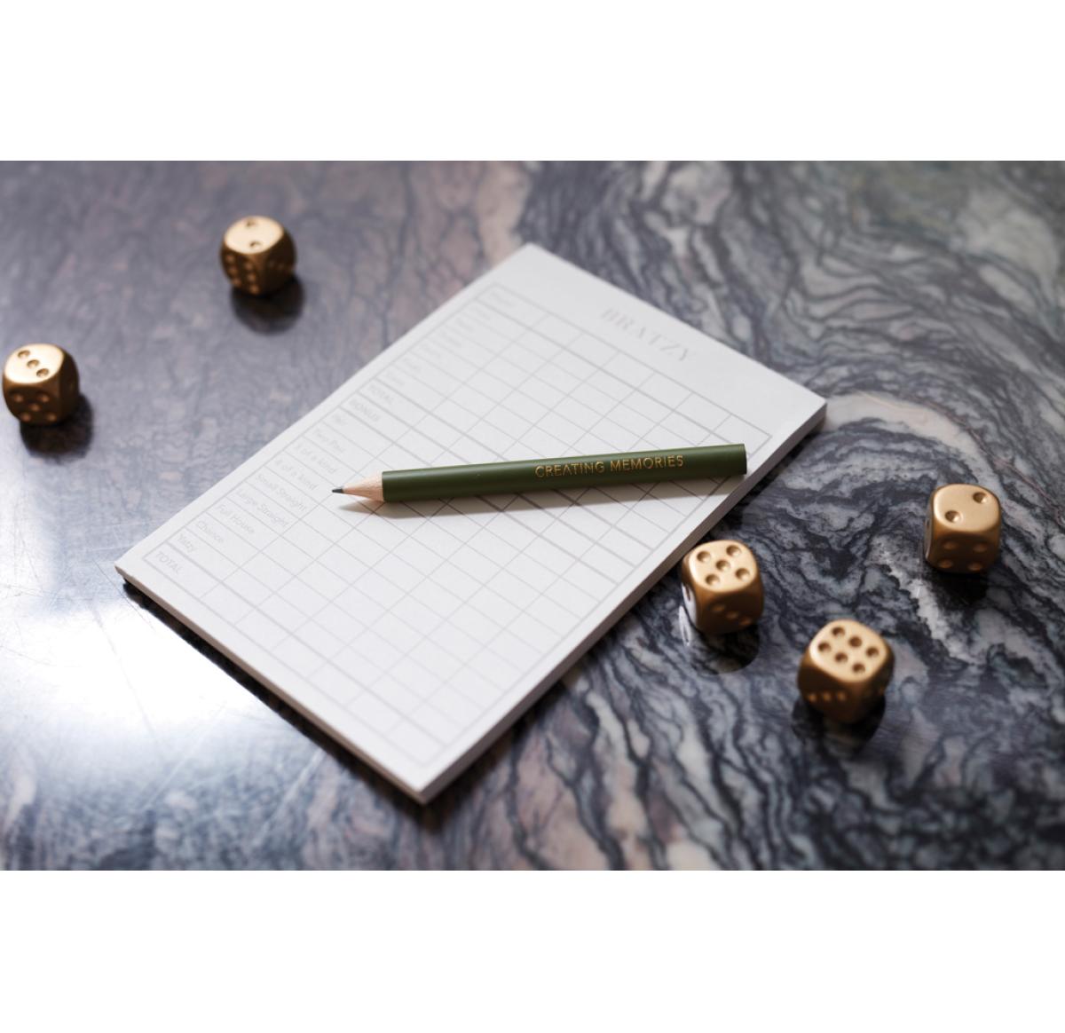 This is Yatzy in a luxurious packaging! With golden dices, and an equally exclusive pencil, we jack up Yatzy to Bratzy. This game is delivered in a stylish box, with a golden text printed on it, which makes it both fun to give away, and to use as a nice detail on the coffee table.