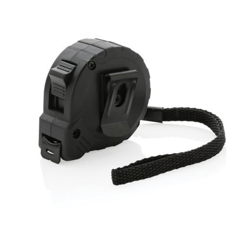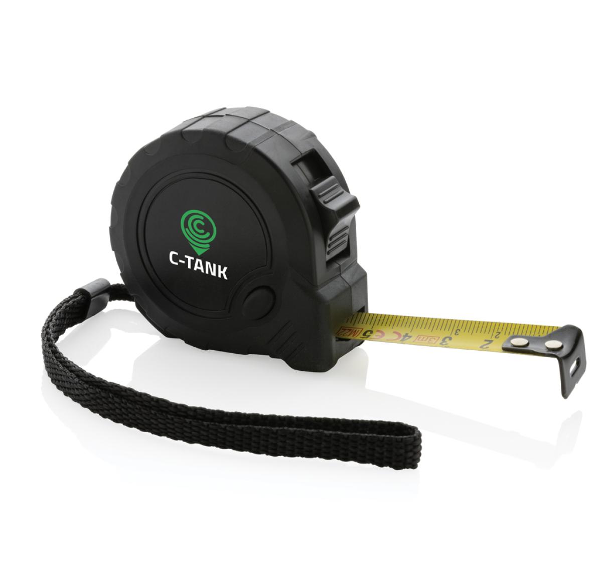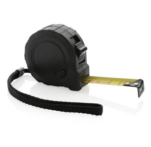 3 metre tape made with RCS (Recycled Claim Standard) certified recycled ABS. Total recycled content: 17% based on total item weight. RCS certification ensures a completely certified supply chain of the recycled materials. With deluxe TRP rubber grip for smooth grip. With release/lock button and extra hold button on the side. With 16mm single sided tape, yellow with black carbon steel hook. With polyester wrist strap. Packed in FSC?? mix kraft packaging