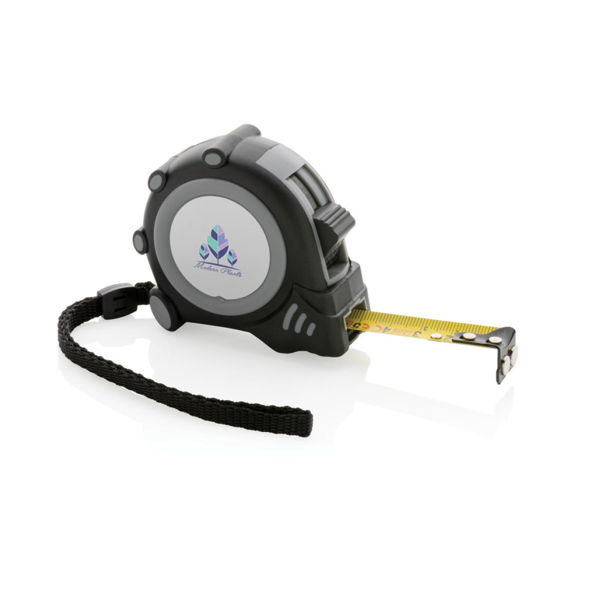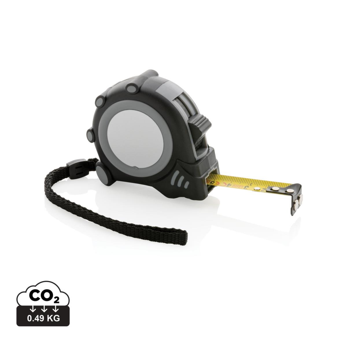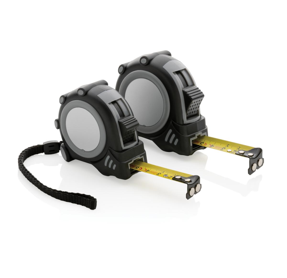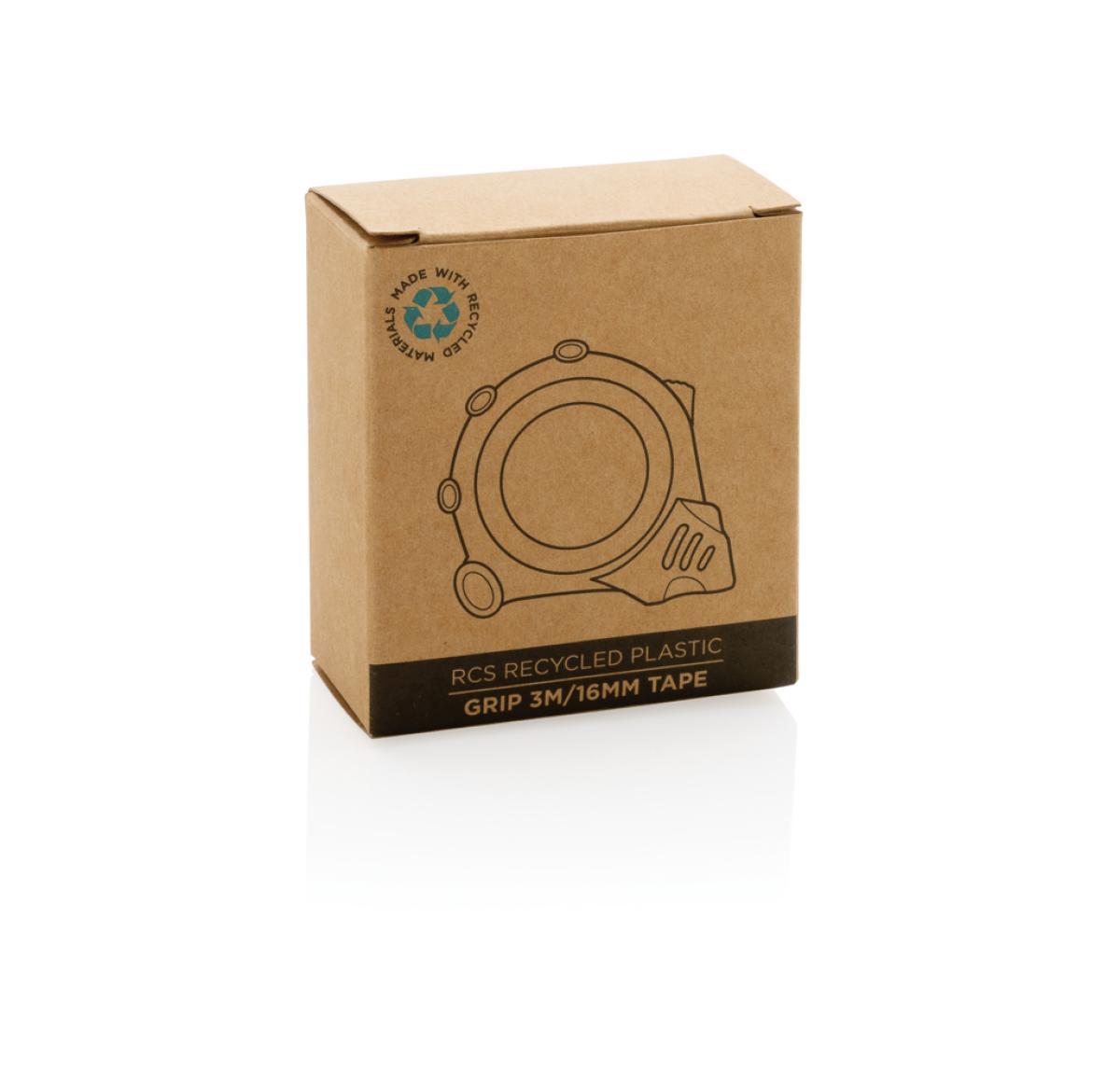 3 metre tape made with RCS (Recycled Claim Standard) certified recycled ABS. Total recycled content: 15% based on total item weight. RCS certification ensures a completely certified supply chain of the recycled materials. With deluxe TRP rubber grip for extra control. With release/hold button. With 16mm single sided tape, yellow with black carbon steel hook with two integrated magnets. With polyester wrist strap. Packed in FSC?? mix kraft packaging