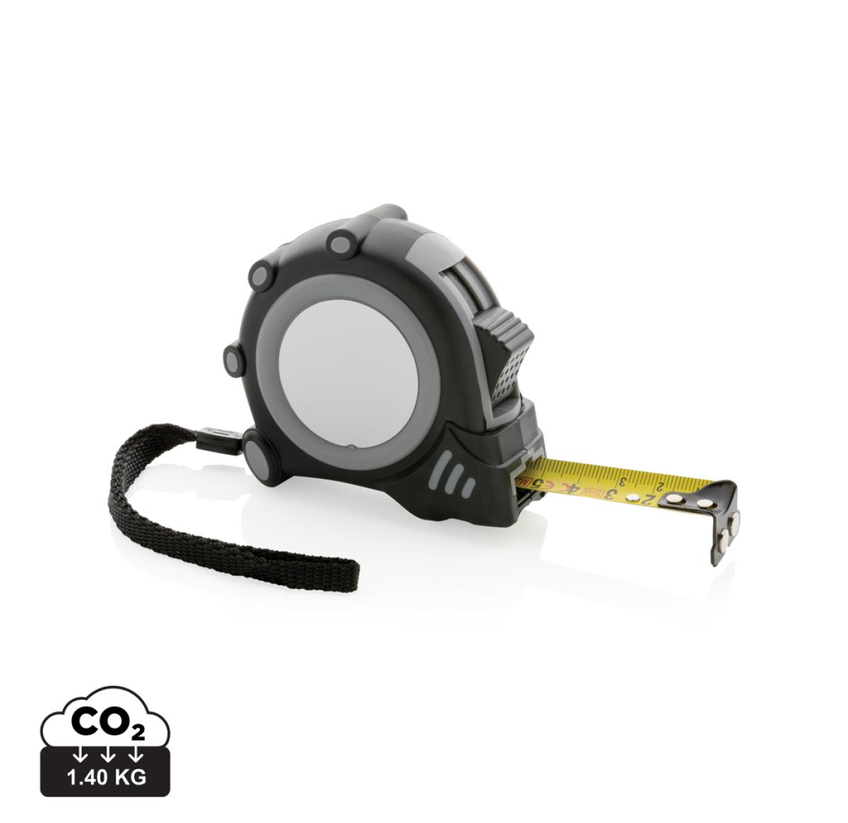 5 metre tape made with RCS (Recycled Claim Standard) certified recycled ABS. Total recycled content: 15% based on total item weight. RCS certification ensures a completely certified supply chain of the recycled materials. With deluxe TRP rubber grip for extra control. With release/hold button. With 19mm single sided tape, yellow with black carbon steel hook with two integrated magnets. With polyester wrist strap. Packed in FSC?? mix kraft packaging