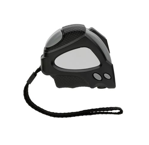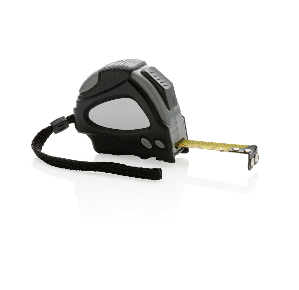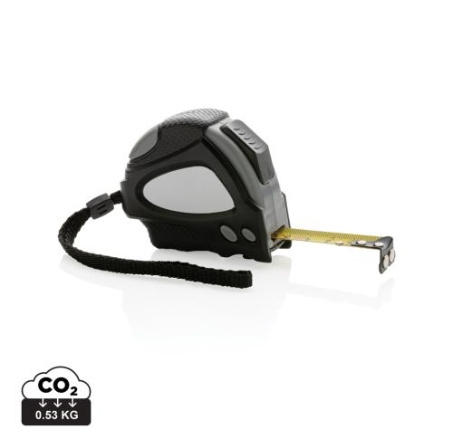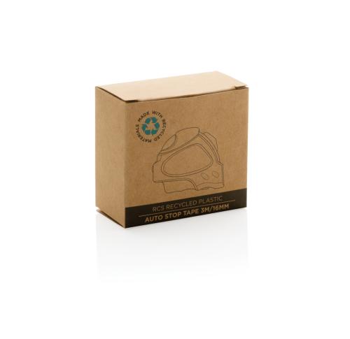 Compact 3 metre auto stop tape made with RCS (Recycled Claim Standard) certified recycled ABS. Total recycled content: 18% based on total item weight. RCS certification ensures a completely certified supply chain of the recycled materials. With deluxe rubber grip for extra control. With release button on top and bottom which can be used to own preference. With 16 mm single sided tape, yellow with black carbon steel hook with two integrated magnets. With polyester wrist strap. Packed in FSC?? mix kraft packaging