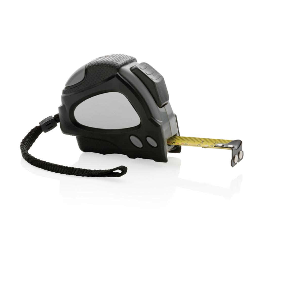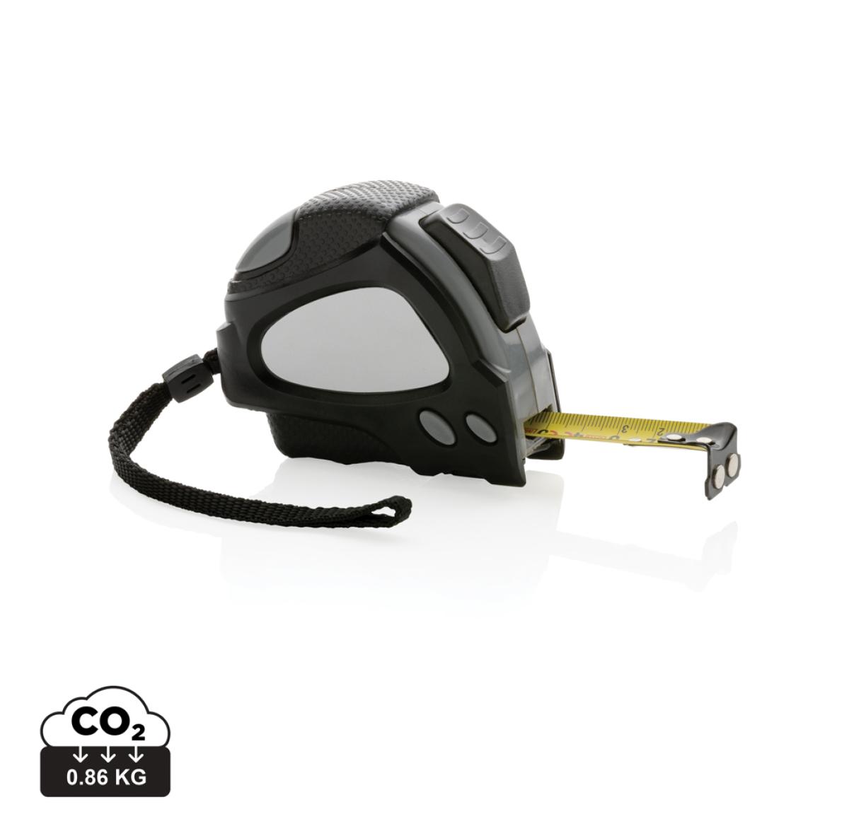 5 metre auto stop tape made with RCS (Recycled Claim Standard) certified recycled ABS. Total recycled content: 14% based on total item weight. RCS certification ensures a completely certified supply chain of the recycled materials. With deluxe rubber grip for extra control. With release button on top and bottom which can be used to own preference. With 19mm single sided tape, yellow with black carbon steel hook with two integrated magnets. With polyester wrist strap. Packed in FSC?? mix kraft packaging
