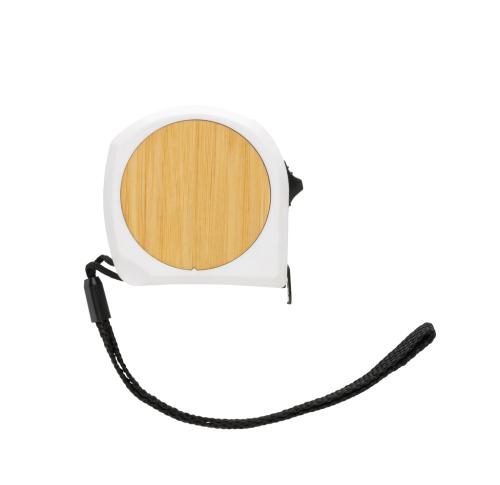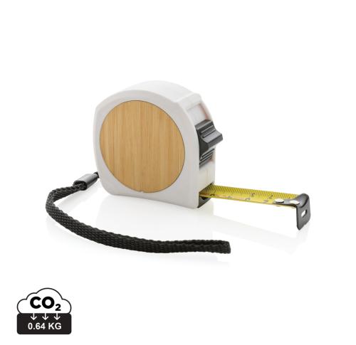 5 metre tape made with RCS (Recycled Claim Standard) certified recycled ABS. Total recycled content: 11% based on total item weight. RCS certification ensures a completely certified supply chain of the recycled materials. The bamboo plate is made from 100% FSC bamboo. Casing with luxury soft touch finish. With release/lock button. With 19mm single sided tape, yellow with black carbon steel hook. With polyester wrist strap. Packed in FSC?? mix kraft packaging