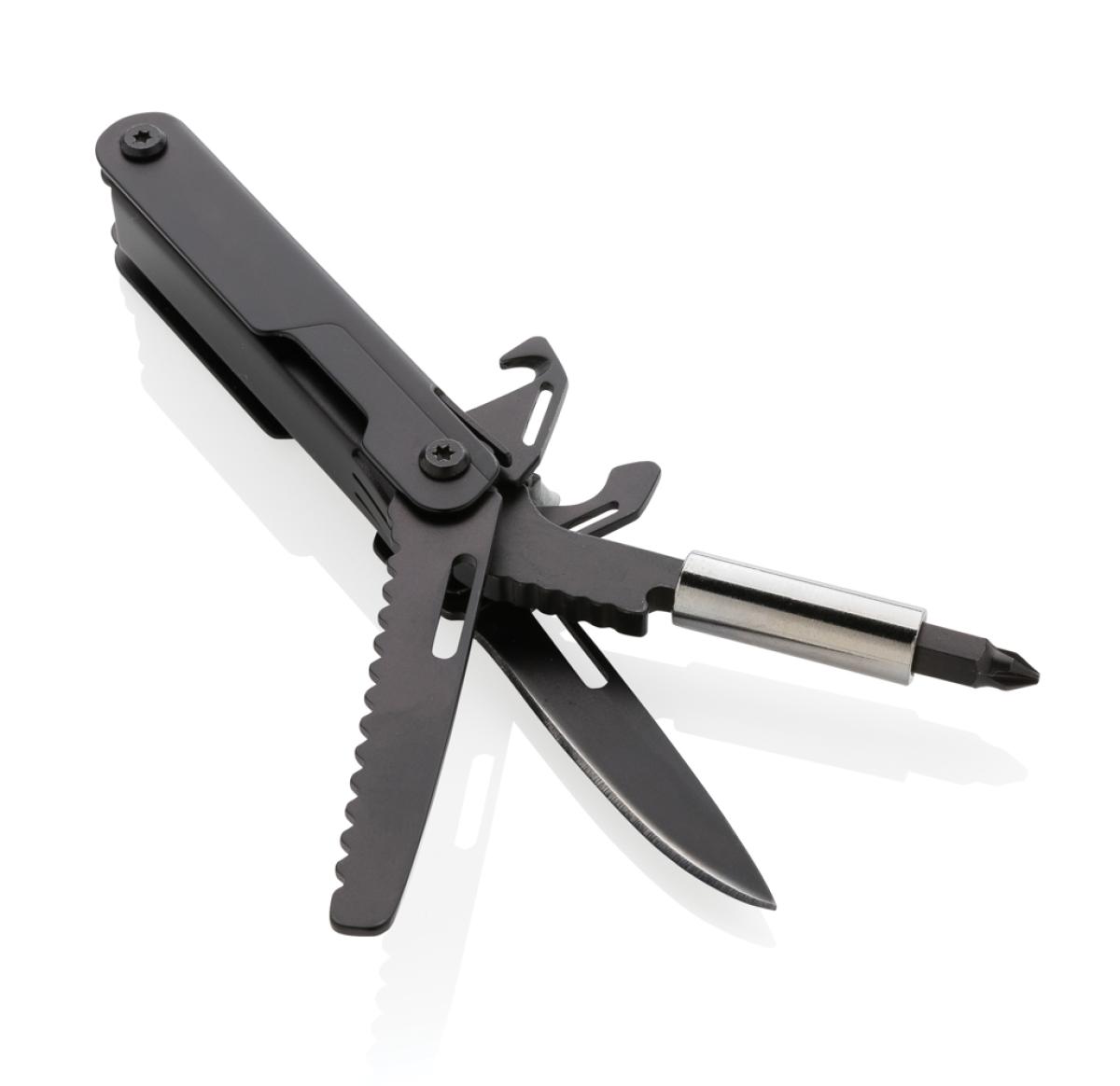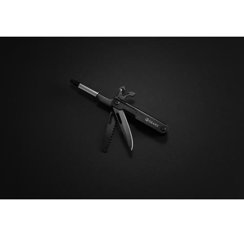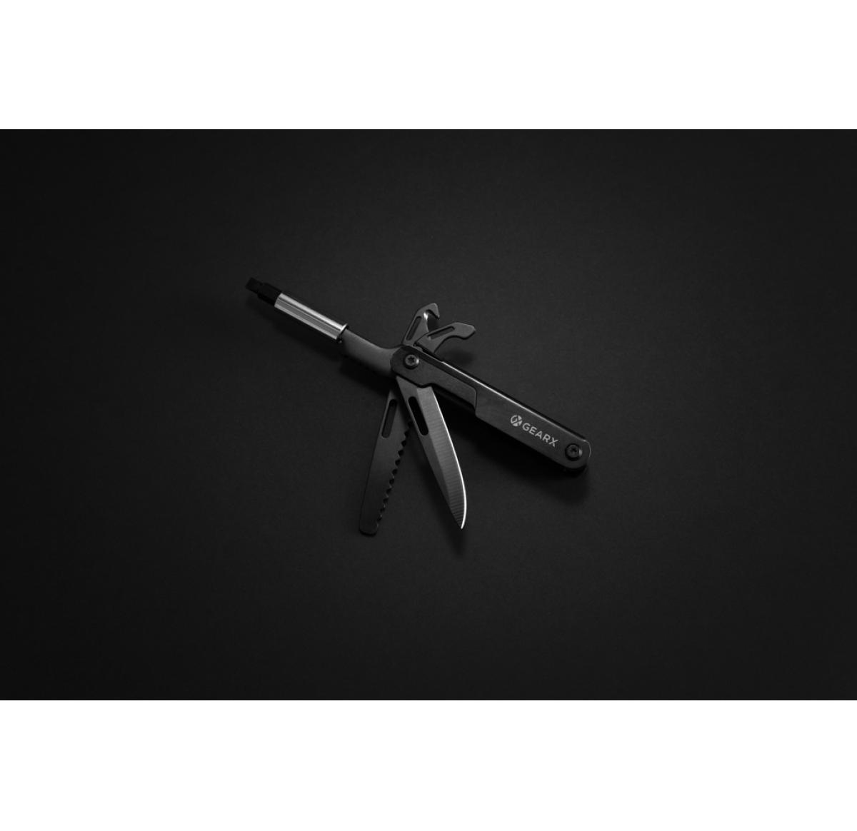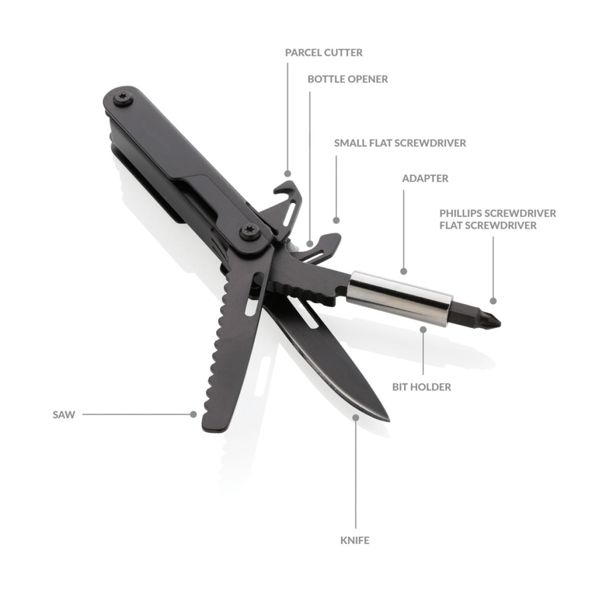 Minimal design but highly functional pocket tool. The body is made from from luxury black aluminum and the tools are made from premium grade 420 stainless steel. The long lasting tool includes: Knife, bottle opener, Box cutter, screwdriver with double bit set ( S2 5, S2 PH2) , saw and slotted screwdriver. Packed in luxury gift box. Hardness level of tools 40-45 HRC. Hardness level of bit 60-62 HR.
