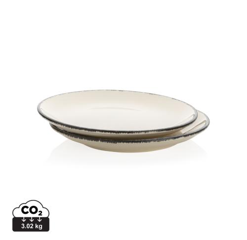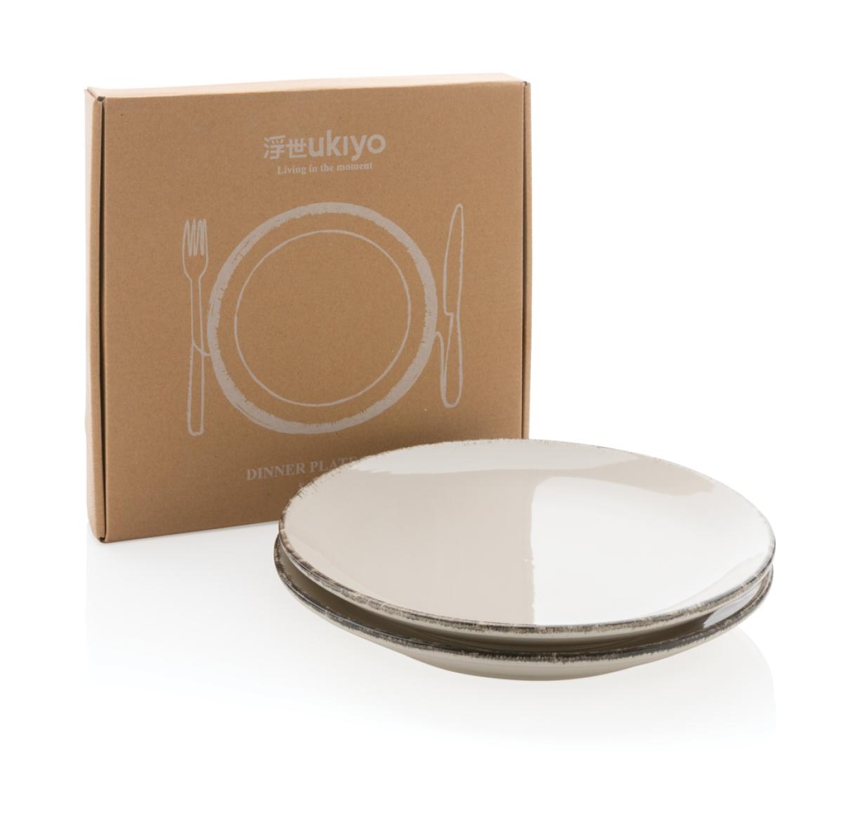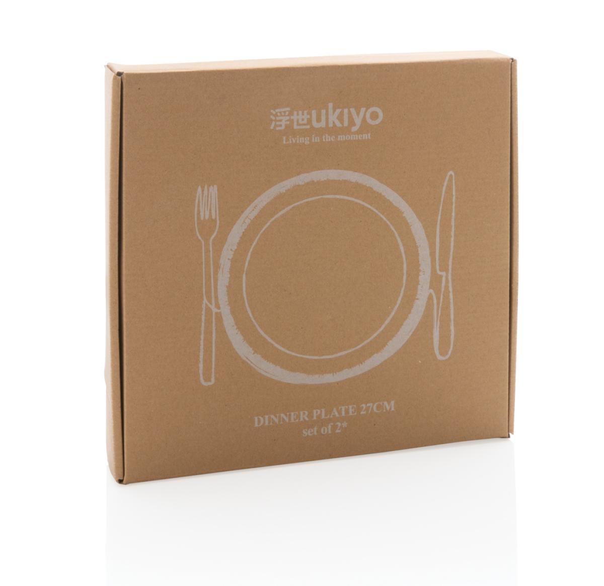 Set a beautiful and welcoming table with these gorgeous ceramic plates! The Ukiyo dinner plates are ideal to beautifully present your dishes. The plate has a beautiful neutral colour with black detailed edges and will suit most homes. Combine the dinner plate with other plates and bowls from Ukiyo to create a unique and personal table setting. The product is microwave and dishwasher safe and comes in a 2pc giftbox. Dimensions: dia.: 27 cm.