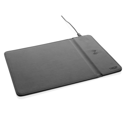 Luxury mouse pad with integrated 10W wireless charger. The charging area can also be used as a phone stand in the upright position. Made with RCS (Recycled Claim Standard) certified recycled materials. RCS certification ensures a completely certified supply chain of the recycled materials. The smooth and luxury surface upgrades any desk to a great work environment. Size: 29x 19x 2 cm. Extra thick for a perfect work experience. Outer material made with GRS certified recycled PU. Total recycled content: 27,9 % based on total item weight. Supplied with 150 cm PVC free TPE material cable. Item and accessories PVC free. Wireless charging compatible with Android latest generations, iPhone 8 and up Input: 9V/2A Wireless Output: 9V/1.1A.