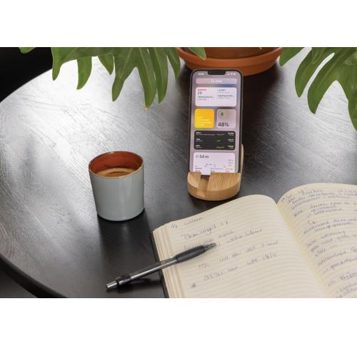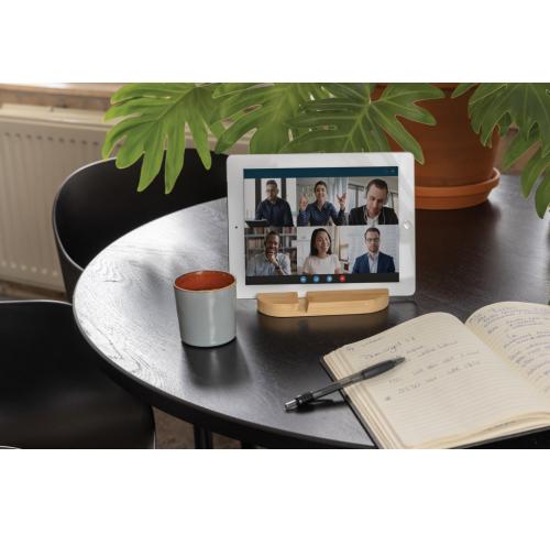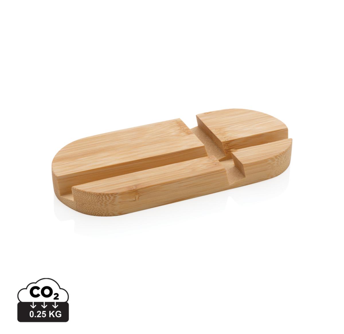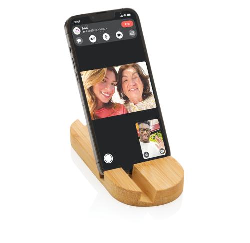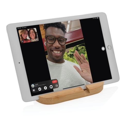 Phone stand made from completely natural bamboo. Perfect on your desk or when you are working from home. The stand can hold most mobile devices and tablets. The shorter groove is optimized for mobile phones and the longer one for tablets.