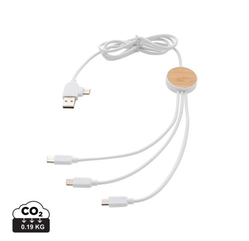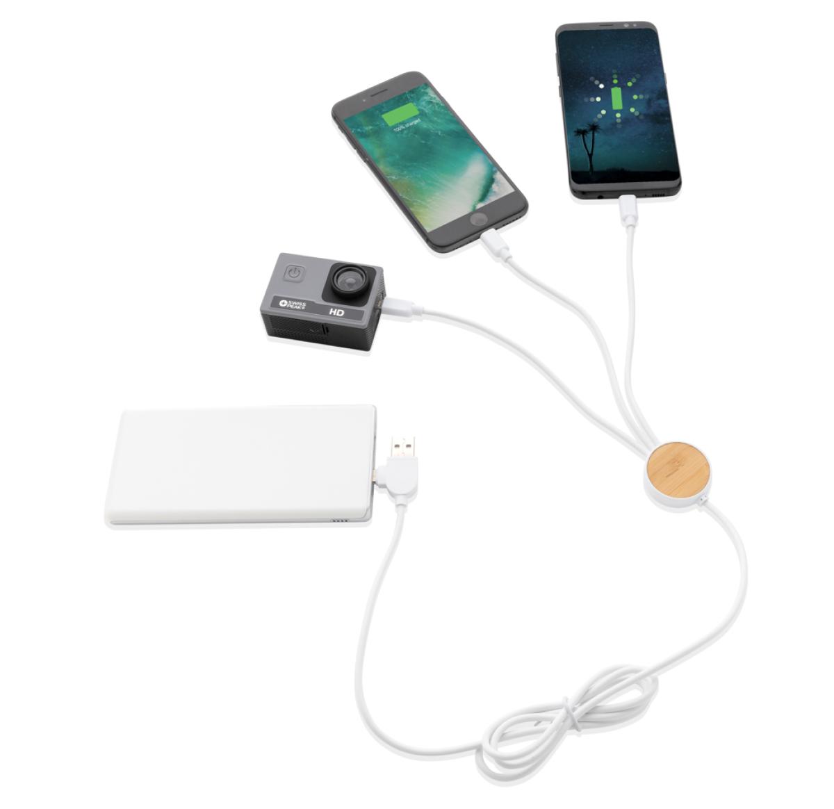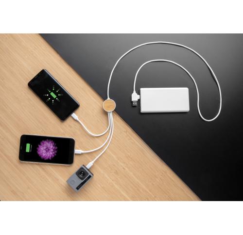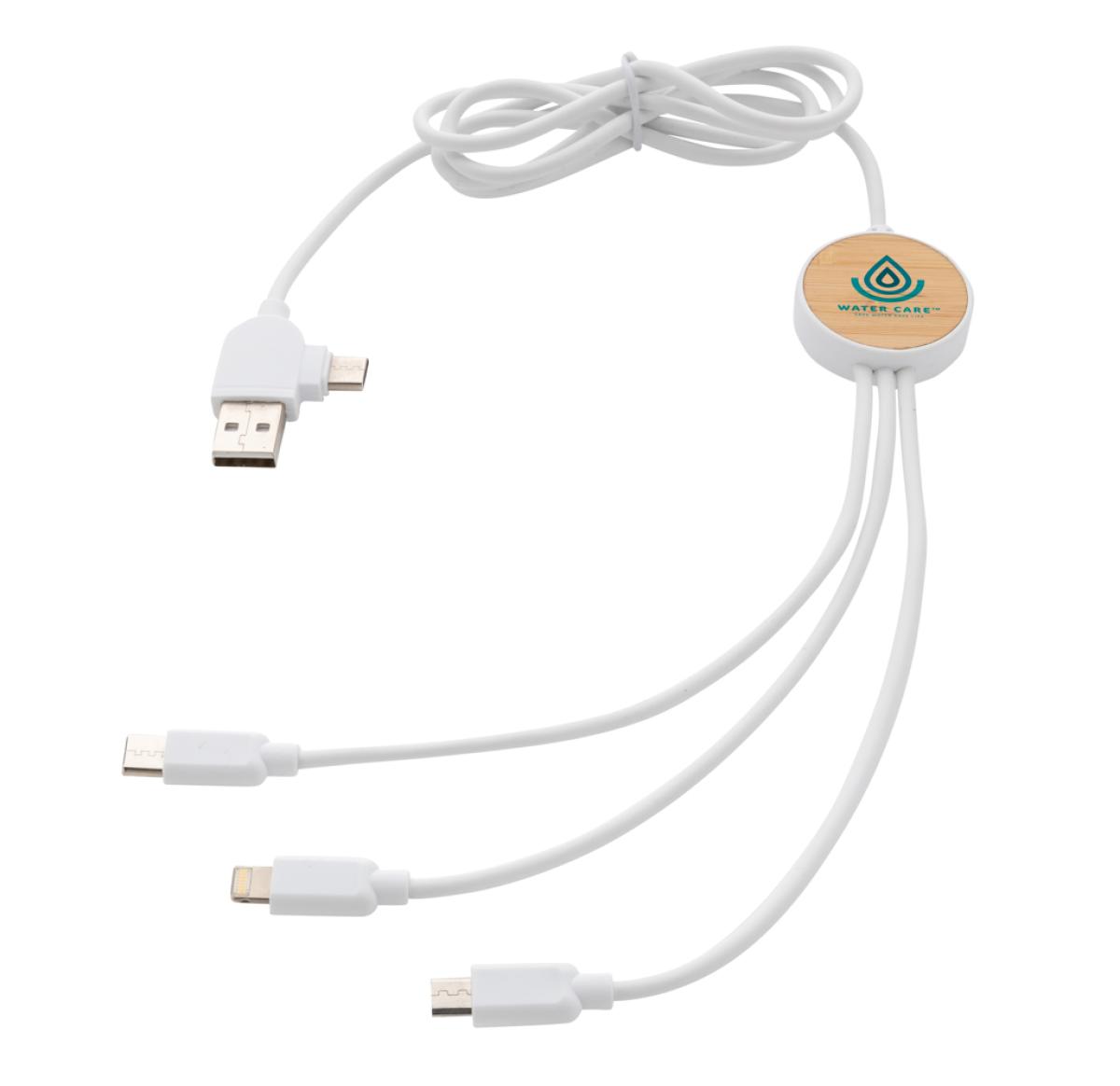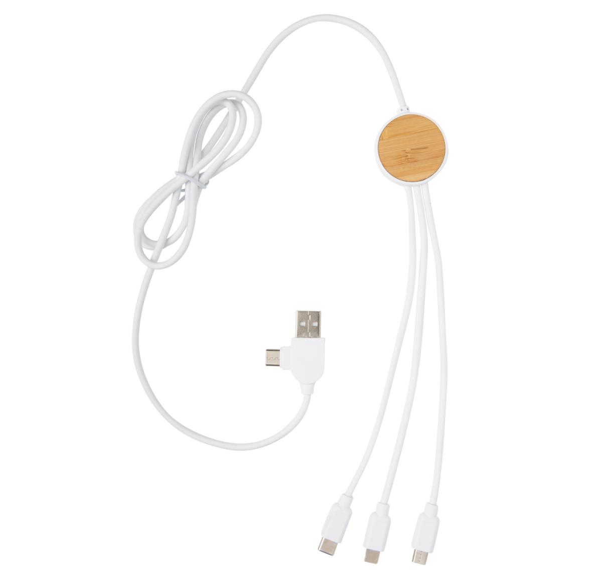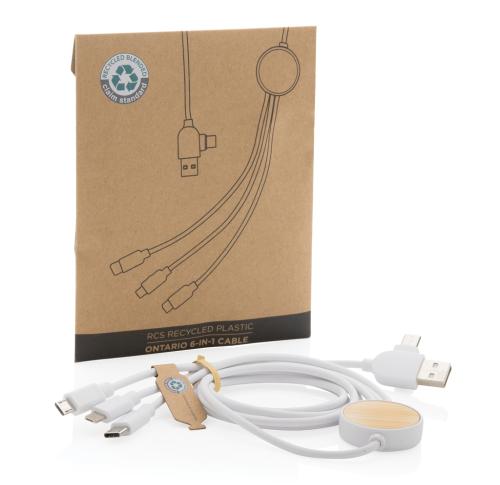 120 cm long multi cable made with certified recycled materials. Comes with 5 different connectors: USB C in, USB A in, type C out, IOS out and micro USB out. This also allows you to use the cable with type C output devices that are included in the newer generation of phones and macbook computers. The cable also has a USB A output input option so it can charge any device from any output source. Casing made from FSC?? bamboo and 100% RCS certified recycled ABS cables made from 100% RCS certified RCS TPE material. Total recycled content: 62% based on total item weight. Max cable length: 120 cm. Packed in FSC??mixed kraft sleeve packaging. PVC free.