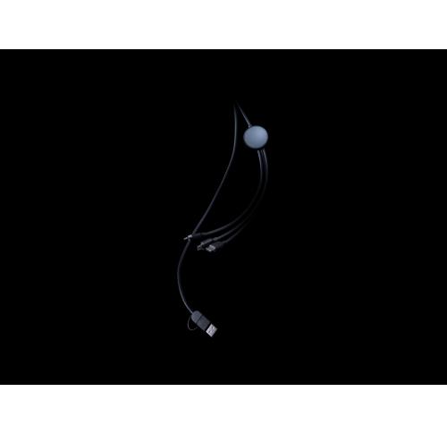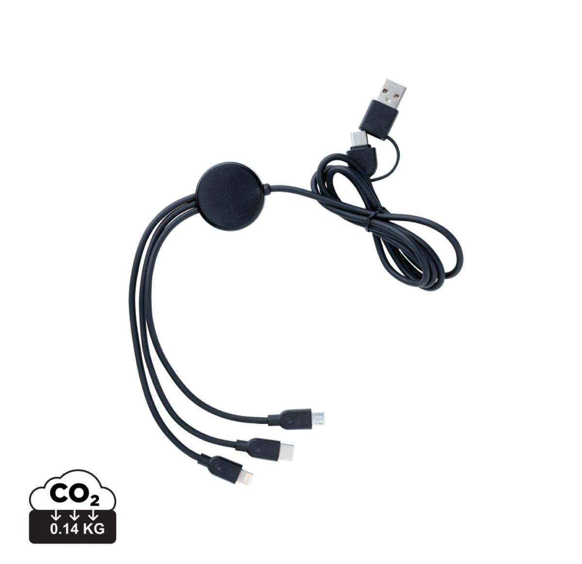 6 in 1 charging cable with casing made from 100% RCS standard recycled ABS plastic and 120 cm cable made from 100% recycled TPE. RCS (Recycled Claim Standard) is a standard to verify the recycled content of a product throughout the whole supply chain. Total recycled content: 57% based on total item weight.The cable comes with 5 different connectors: USB C in, USB A in, type C out, IOS out and micro USB out. This allows you to use the cable with type C output devices that are included in the newer generation of phones and macbook computers. The cable also has a USB A output input option so it can charge any device from any output source. 100% PVC free. Packed in FSC?? mix packaging.