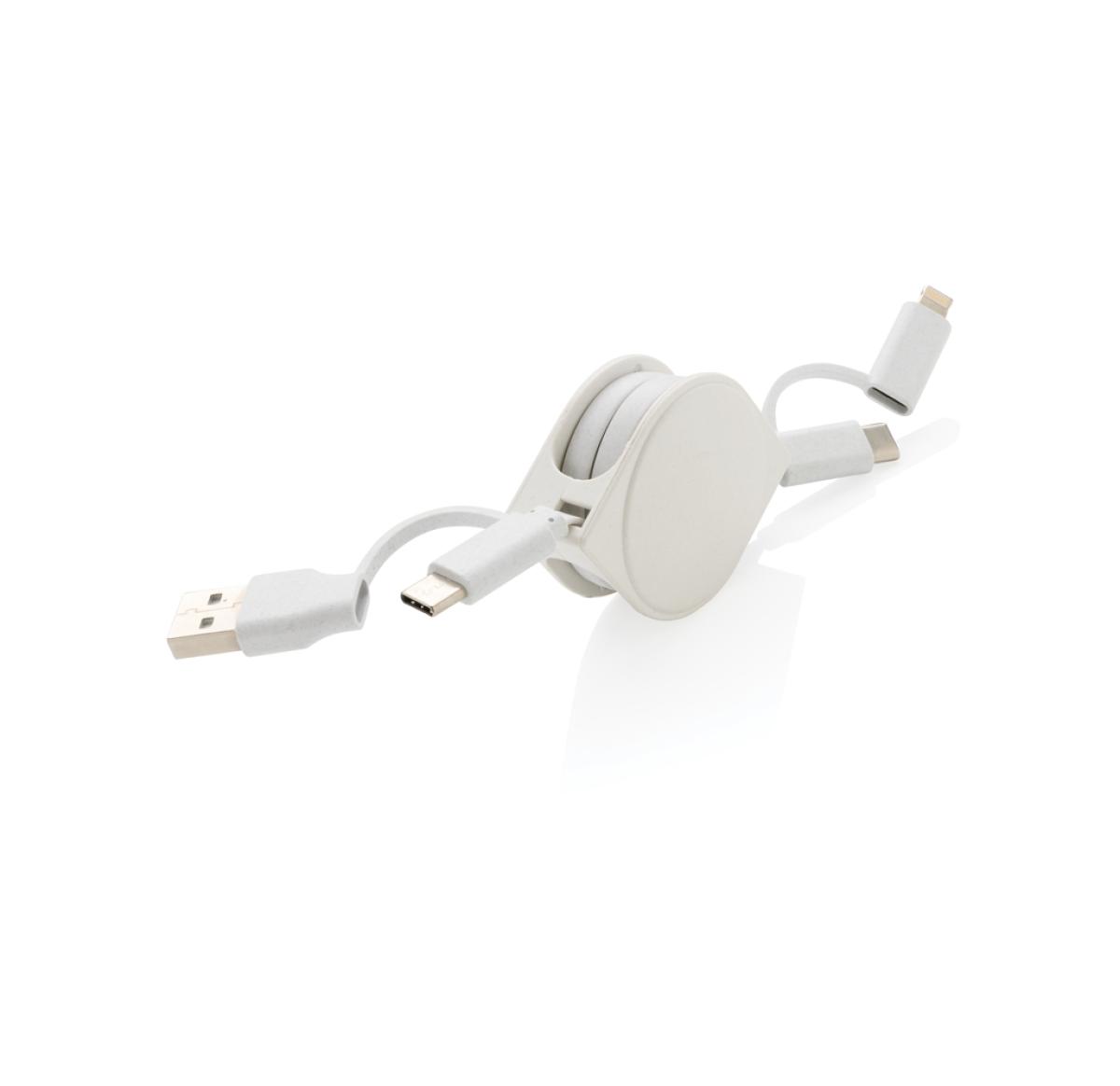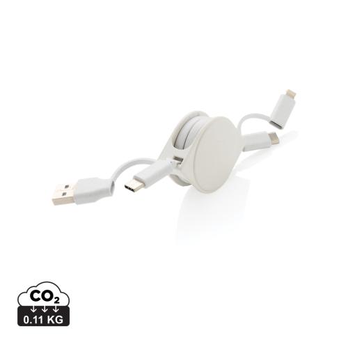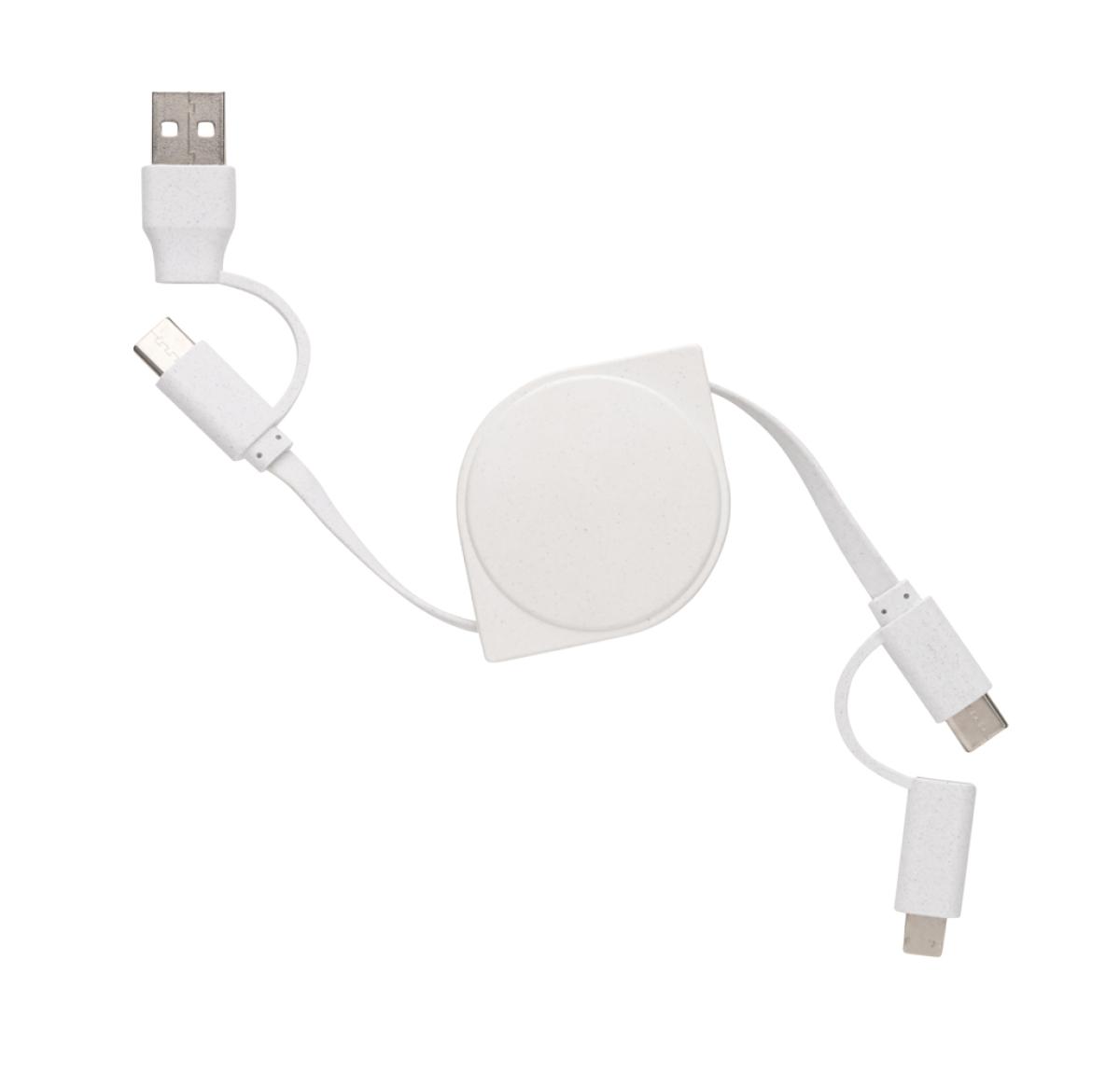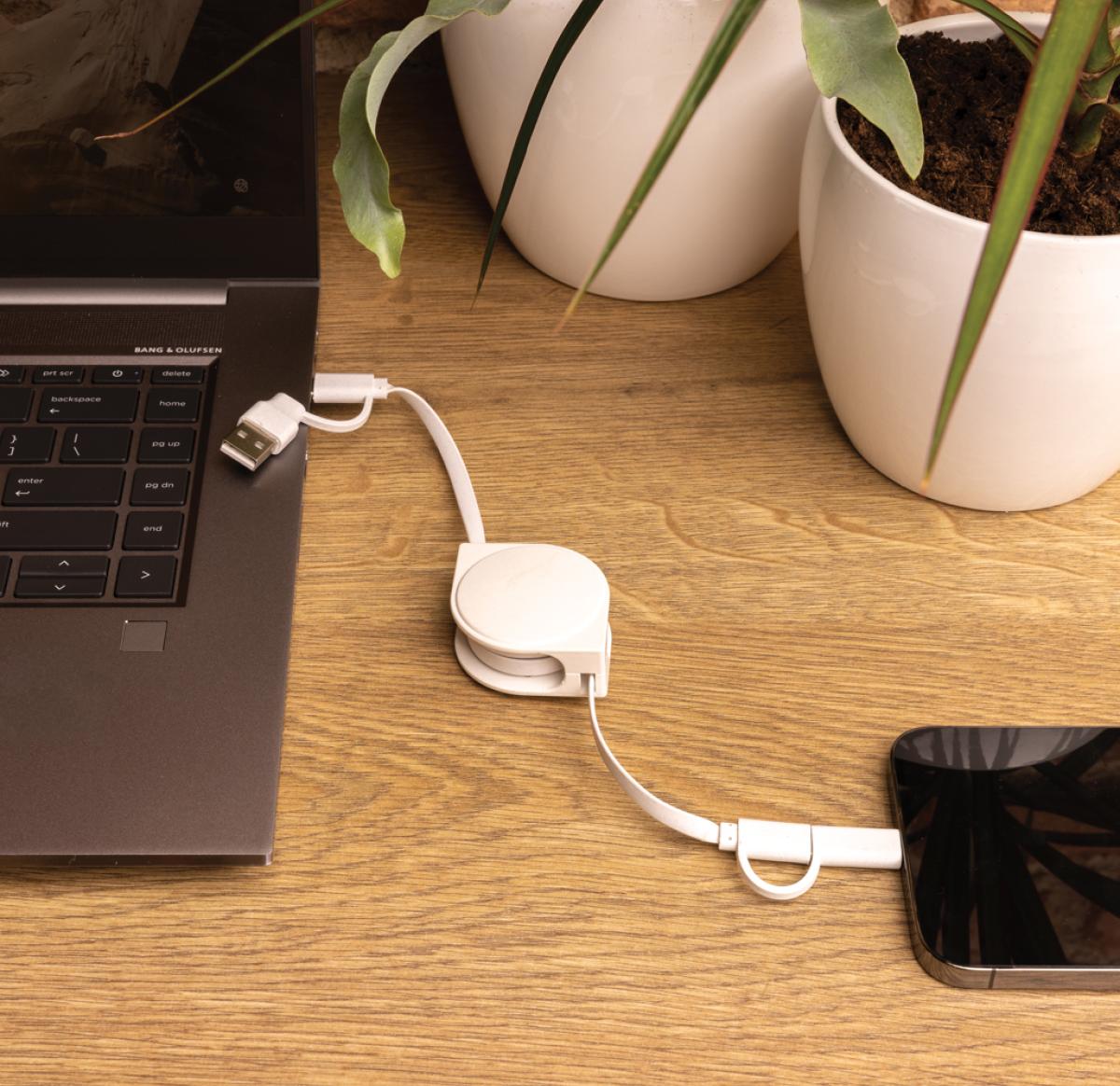 6-in-1 retractable cable where the case is made out of RCS certified recycled ABS plastic and the wire from recycled TPE. Total recycled content: 59% based on total item weight. RCS (Recycled Claim Standard) is a standard to verify the recycled content of a product throughout the whole supply chain. RCS is the standard that is used when a part of the item has been made from recycled materials. The cable has 5 different connectors: USB C in, USB A in, type C out, IOS out and micro USB out. This allows you to use the cable with type C output devices that are included in the newer generation of phones and macbook computers. The cable also has a USB A output input option so it can charge any device from any output source. Item is completely PVC free.