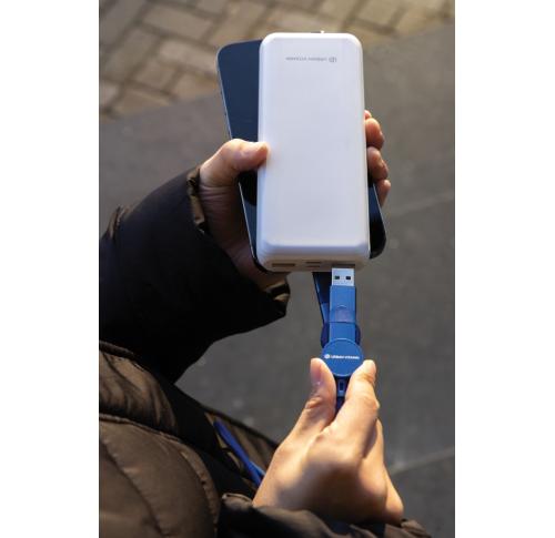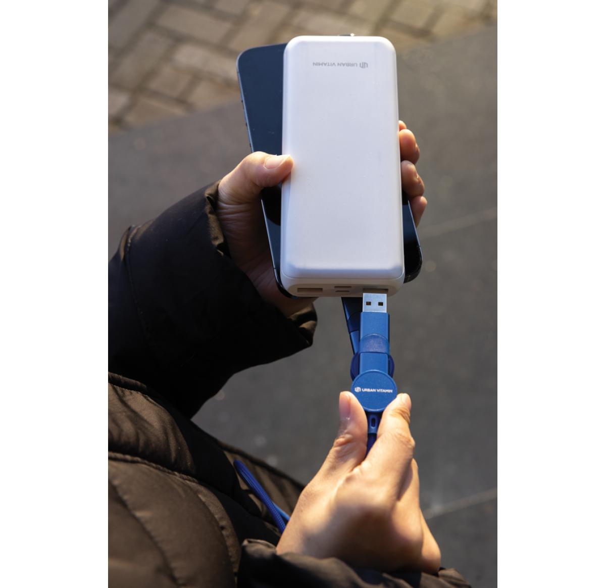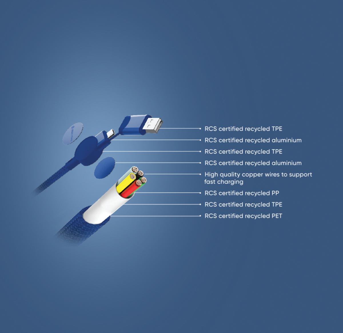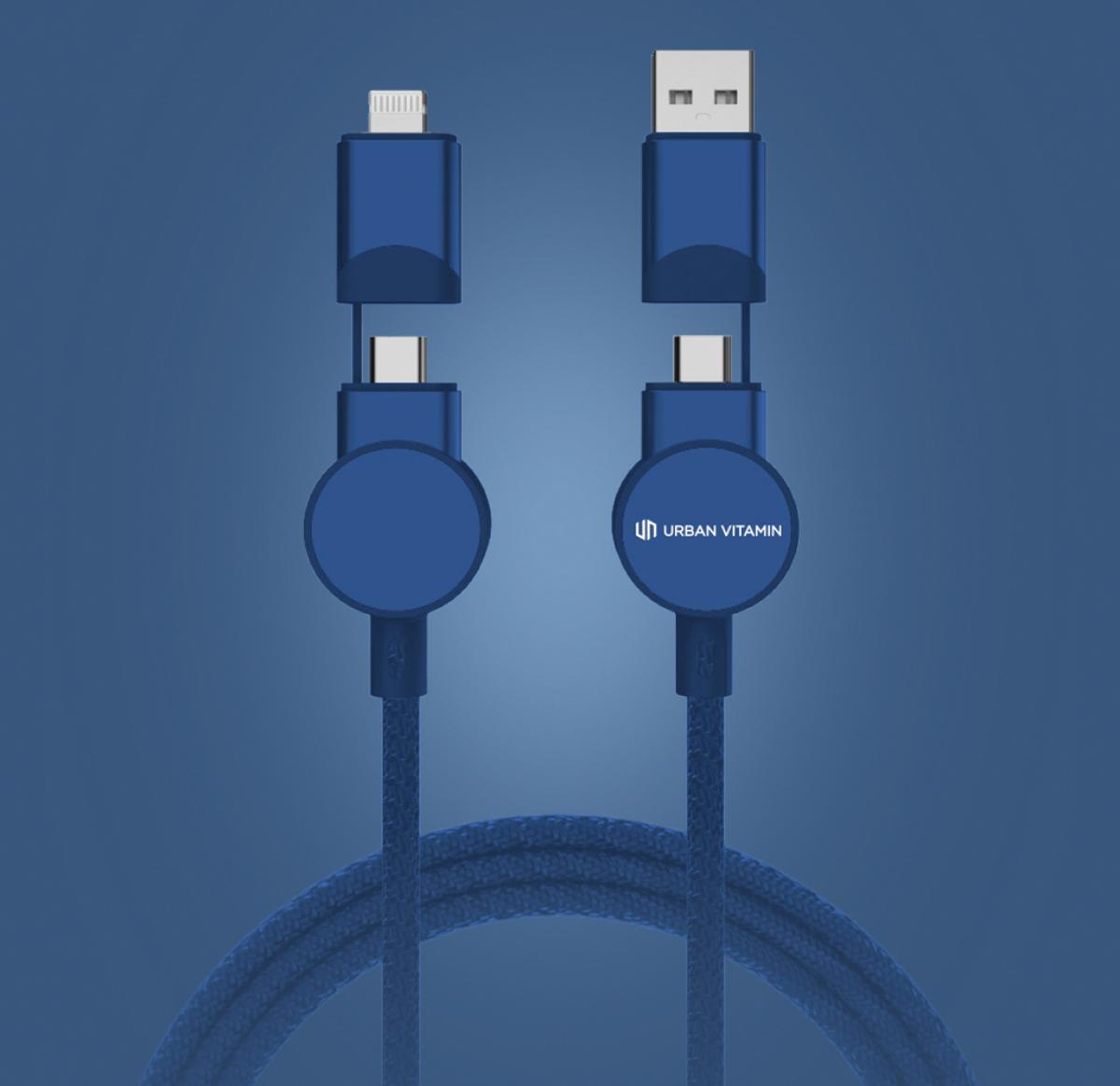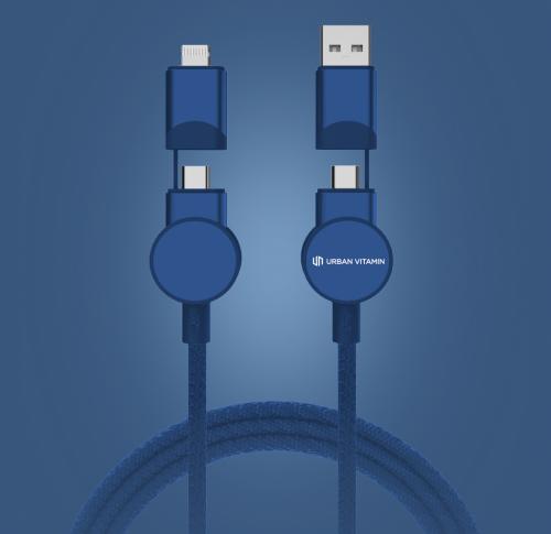 Always charge using the fastest charging speed possible with the Oakland fast charging cable. Made with certified recycled materials. The case is made out of 100% RCS certified recycled TPE plastic and the wire from 100% recycled TPE inner material and 100% recycled PET outer layer. RCS (Recycled Claim Standard) is a standard to verify the recycled content of a product throughout the whole supply chain. RCS is the standard that is used when a part of the item has been made from recycled materials. The 120 cm cable has 5 different connectors: USB C in, USB A in, type C out, IOS out and micro USB out. This also allows you to use the cable with type C output devices that are included in the newer generation of phones and macbook computers. The cable also has a USB A output input option so it can charge any device from any output source. Max current type C to lightning 18W. Max current type C to type C 45W. Urban Vitamin items are made without PVC and packed in plastic reduced packaging.