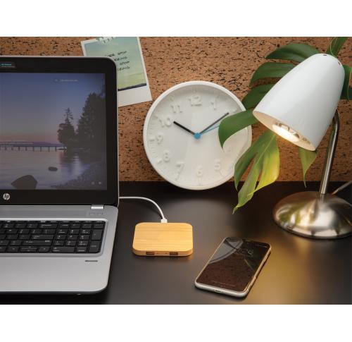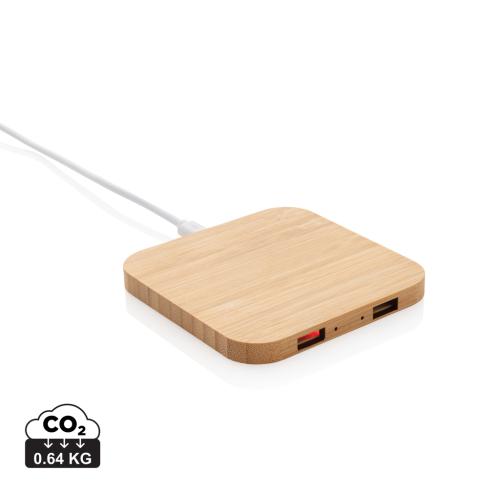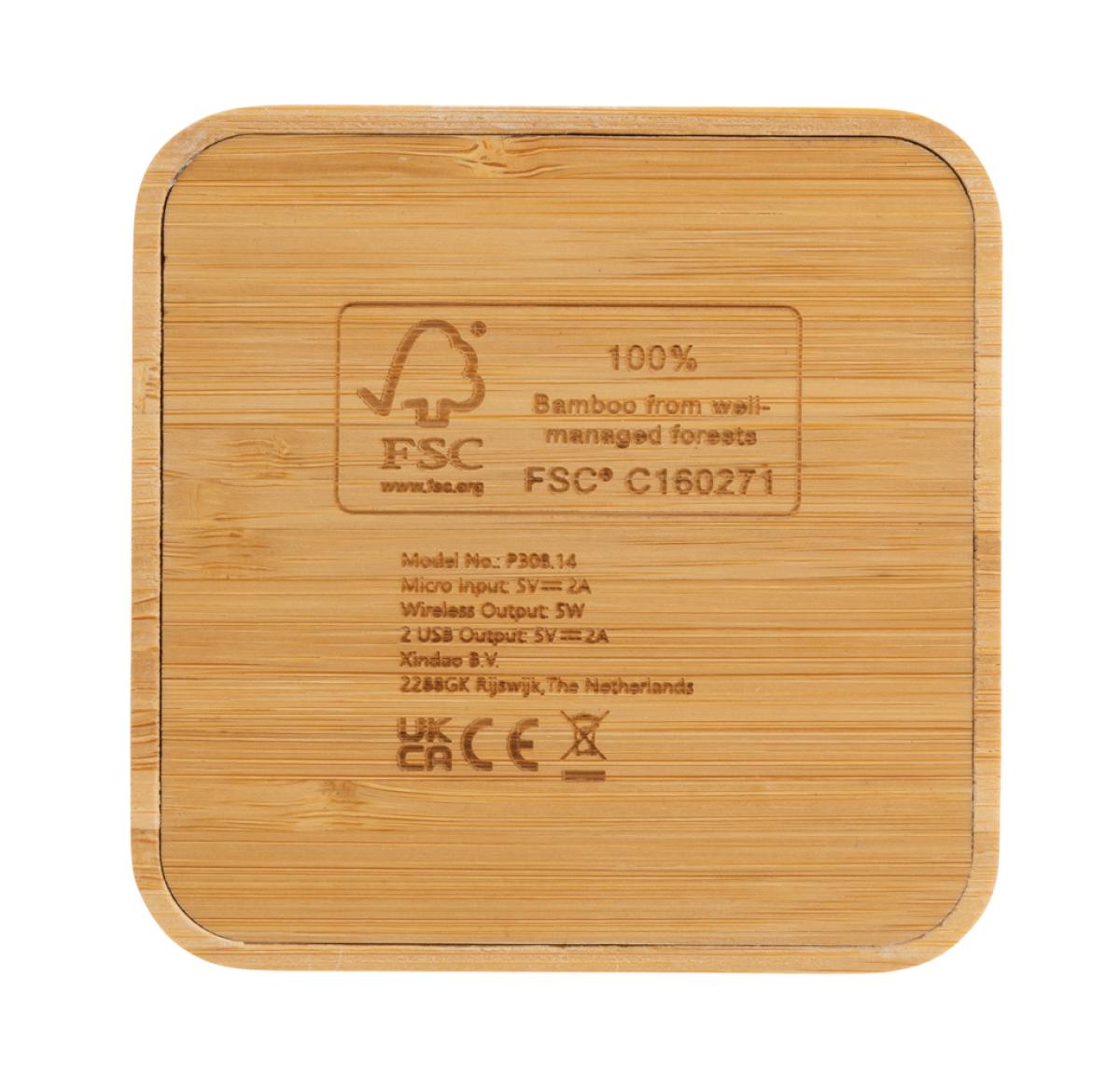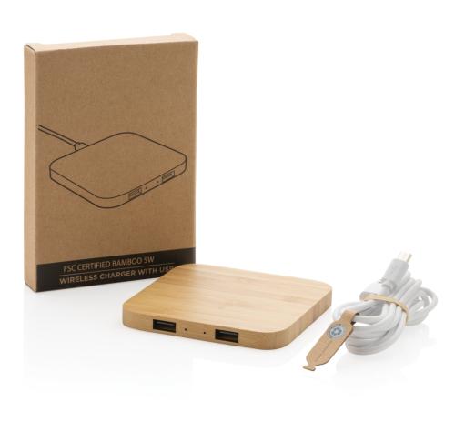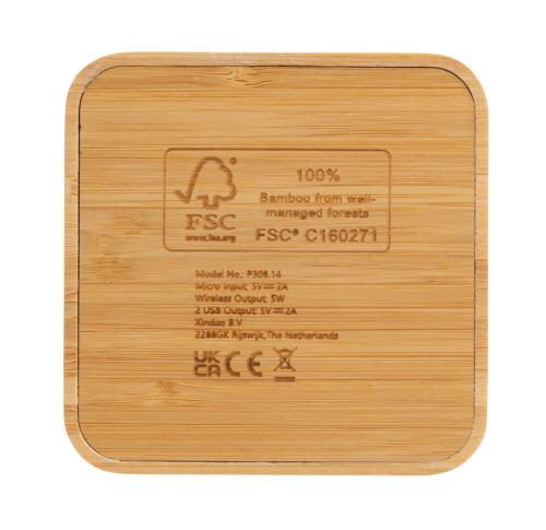5W wireless charger made from 100% FSC?? certified bamboo. With 150cm 100% RCS recycled TPE micro USB cable. Compatible with all QI enabled devices like Android latest generation, iPhone 8 and up. Input: 5V/2A; Wireless Output: 5V/1A - 5W.; Item and accessories 100% PVC free. Packed in FSC??mix packaging.