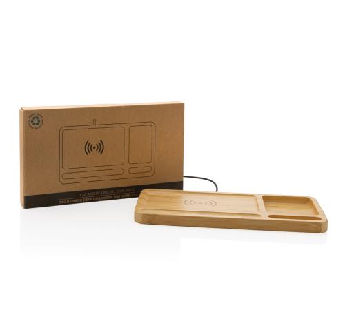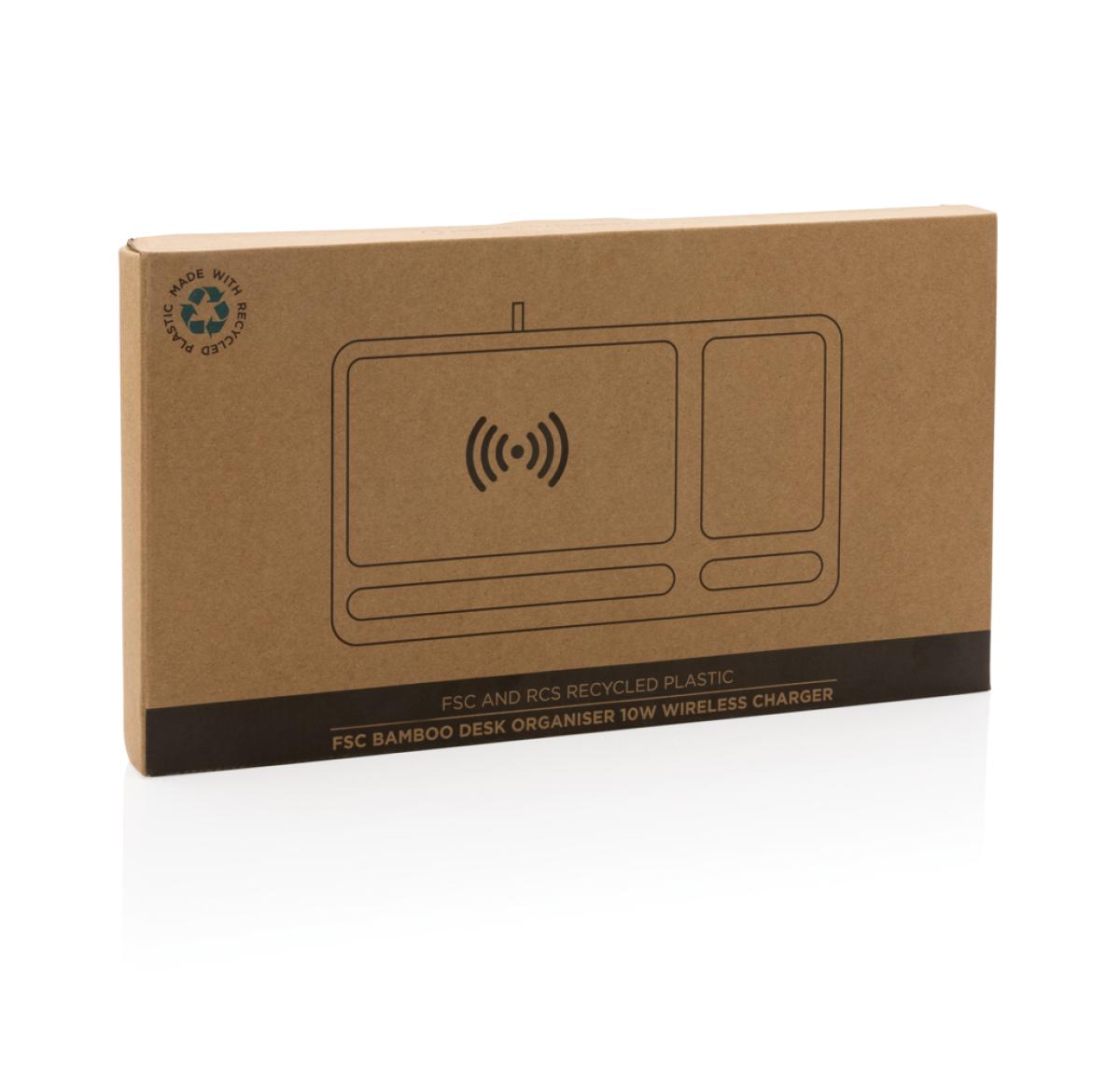 10W wireless fast charger with desk organiser made with RCS (Recycled Claim Standard) certified recycled ABS. Total recycled content: 5% based on total item weight (including bamboo base) The bamboo exterior of the organiser is fully made from FSC 100 bamboo. Including 120 cm type C charging cable made from RCS certified recycled TPE. Packed in FSC mix kraft box. Type-C Input 5V/2A; 9V/1.67A. Wireless output 5V/1A;9V/1.1A (10W)