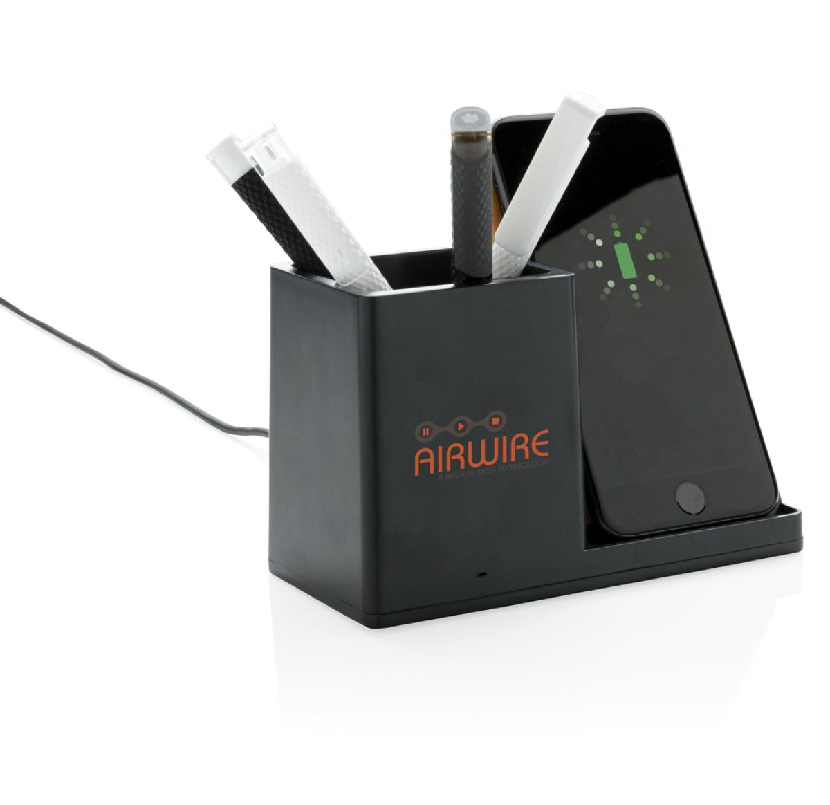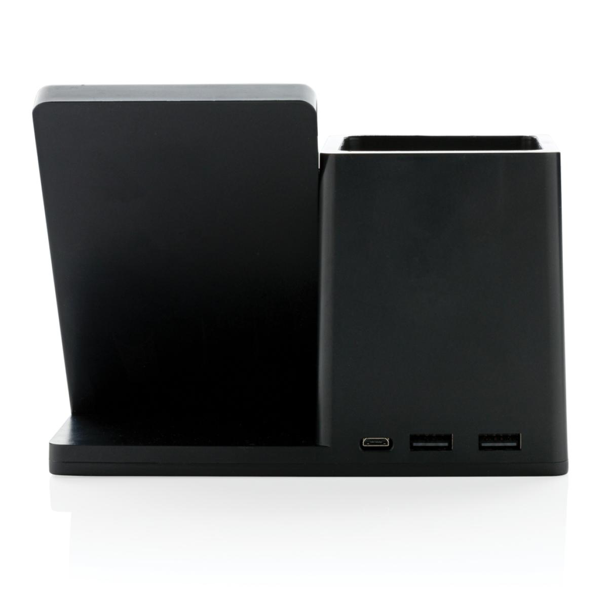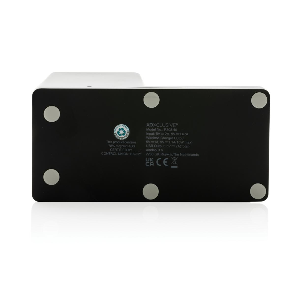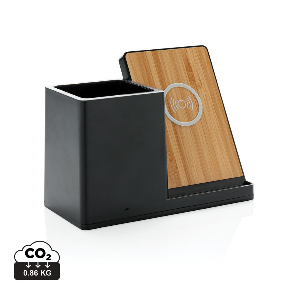 10W fast wireless charger with pen holder made with RCS (Recycled Claim Standard) certified recycled ABS. Total recycled content: 78% based on total item weight. RCS certification ensures a completely certified supply chain of the recycled materials. Bamboo wireless charging area made from FSC 100 bamboo. With two USB ports on the back to charge via cable. Wireless charging compatible with Android latest generations, iPhone 8 and up. Item and accessories PVC free. Including 120 cm type C charging cable made from RCS certified recycled TPE. Packed in FSC mix kraft box. Type-C Input 5V/2A; 9V/2A; Wireless output 5V/1A;9V/1.1A; (10W) Registered design??