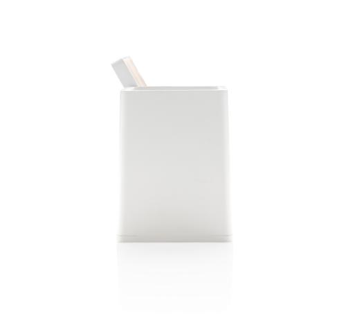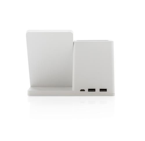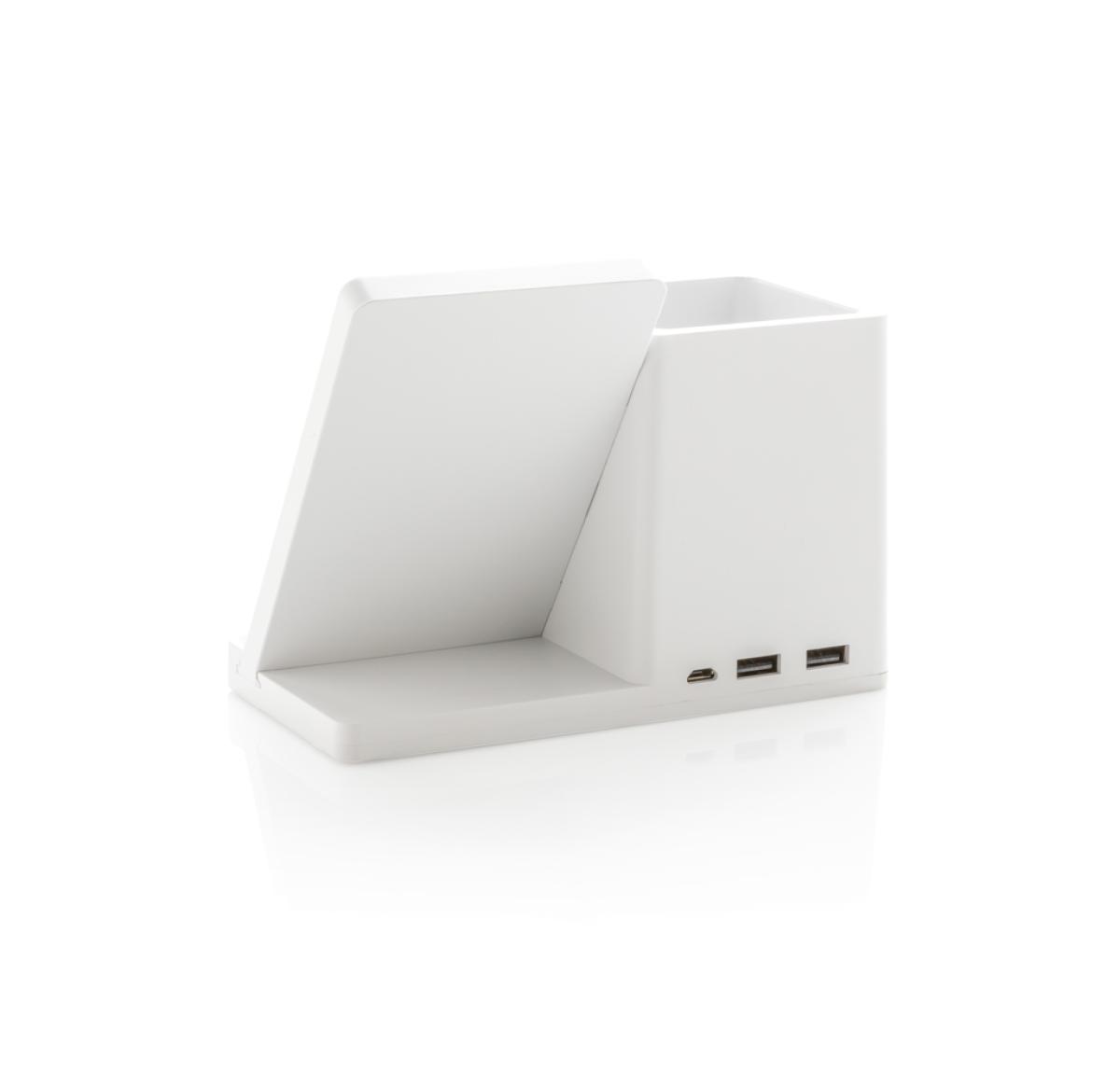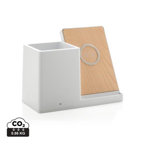 10W fast wireless charger with pen holder made with RCS (Recycled Claim Standard) certified recycled ABS. Total recycled content: 78% based on total item weight. RCS certification ensures a completely certified supply chain of the recycled materials. Bamboo wireless charging area made from FSC 100 bamboo. With two USB ports on the back to charge via cable. Wireless charging compatible with Android latest generations, iPhone 8 and up. Item and accessories PVC free. Including 120 cm type C charging cable made from RCS certified recycled TPE. Packed in FSC mix kraft box. Type-C Input 5V/2A; 9V/2A; Wireless output 5V/1A;9V/1.1A; (10W) Registered design??