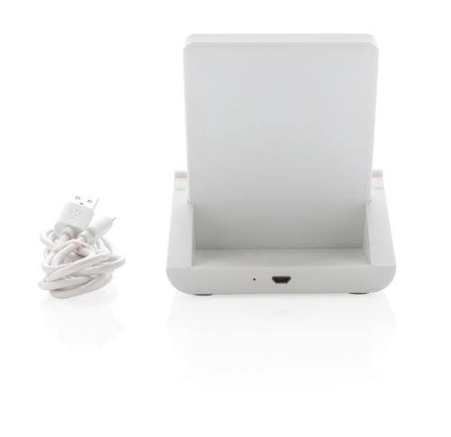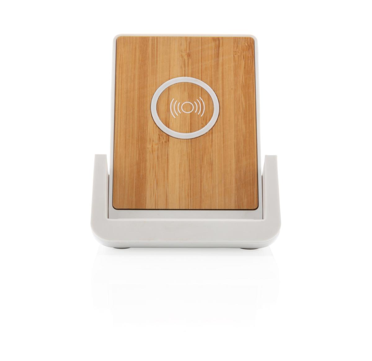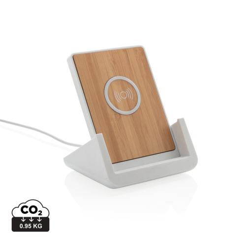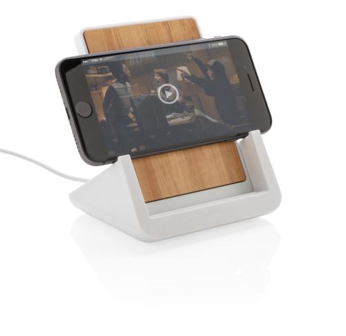 10W fast wireless charger made with RCS (Recycled Claim Standard) certified recycled ABS. Total recycled content: 47% based on total item weight. RCS certification ensures a completely certified supply chain of the recycled materials. Bamboo wireless charging area made from FSC 100 bamboo. With two USB ports on the back to charge via cable. The stand is designed to charge your phone both in the horizontal and vertical position. Making it perfect to watch videos or other content while charging. Wireless charging compatible with Android latest generations, iPhone 8 and up. Item and accessories PVC free. Including 120 cm type C charging cable made from RCS certified recycled TPE. Packed in FSC mix kraft box. Type-C Input 5V/2A; 9V/2A; Wireless output 5V/1A;9V/1.1A; (10W) Registered design??