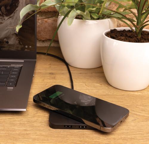 10W wireless fast charger with two USB ports made with RCS (Recycled Claim Standard) certified recycled ABS. Total recycled content: 57% based on total item weight. RCS certification ensures a completely certified supply chain of the recycled materials. Wireless charging compatible with Android latest generations, iPhone 8 and up. Item and accessories PVC free. Including 120 cm type C charging cable made from RCS certified recycled TPE. Packed in FSC mix kraft box. Type-C in; Input 5V/2A; 9V/1.67A. Wireless output 5V/1A;9V/1.1A (10W)