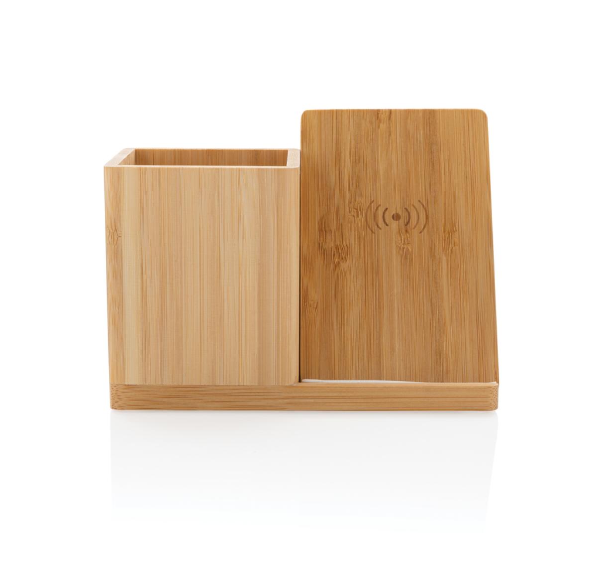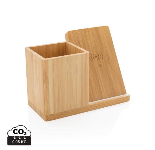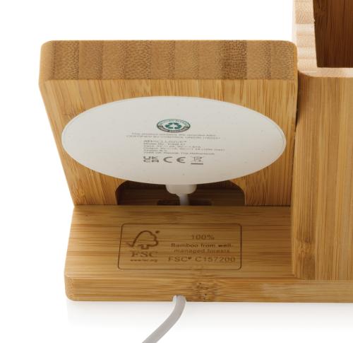 10W wireless fast charger with pen holder made with RCS (Recycled Claim Standard) certified recycled ABS. Total recycled content: 6% based on total item weight (including bamboo base) The bamboo exterior of the organiser is fully made from FSC 100 bamboo. Including 120 cm type C charging cable made from RCS certified recycled TPE. Packed in FSC mix kraft box. Type-C Input 5V/2A; 9V/1.67A. Wireless output 5V/1A;9V/1.1A (10W) Registered design??