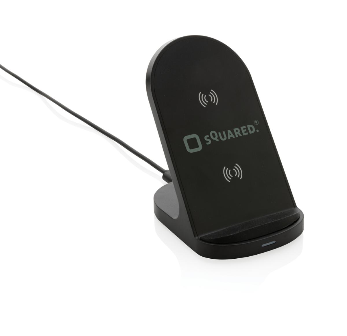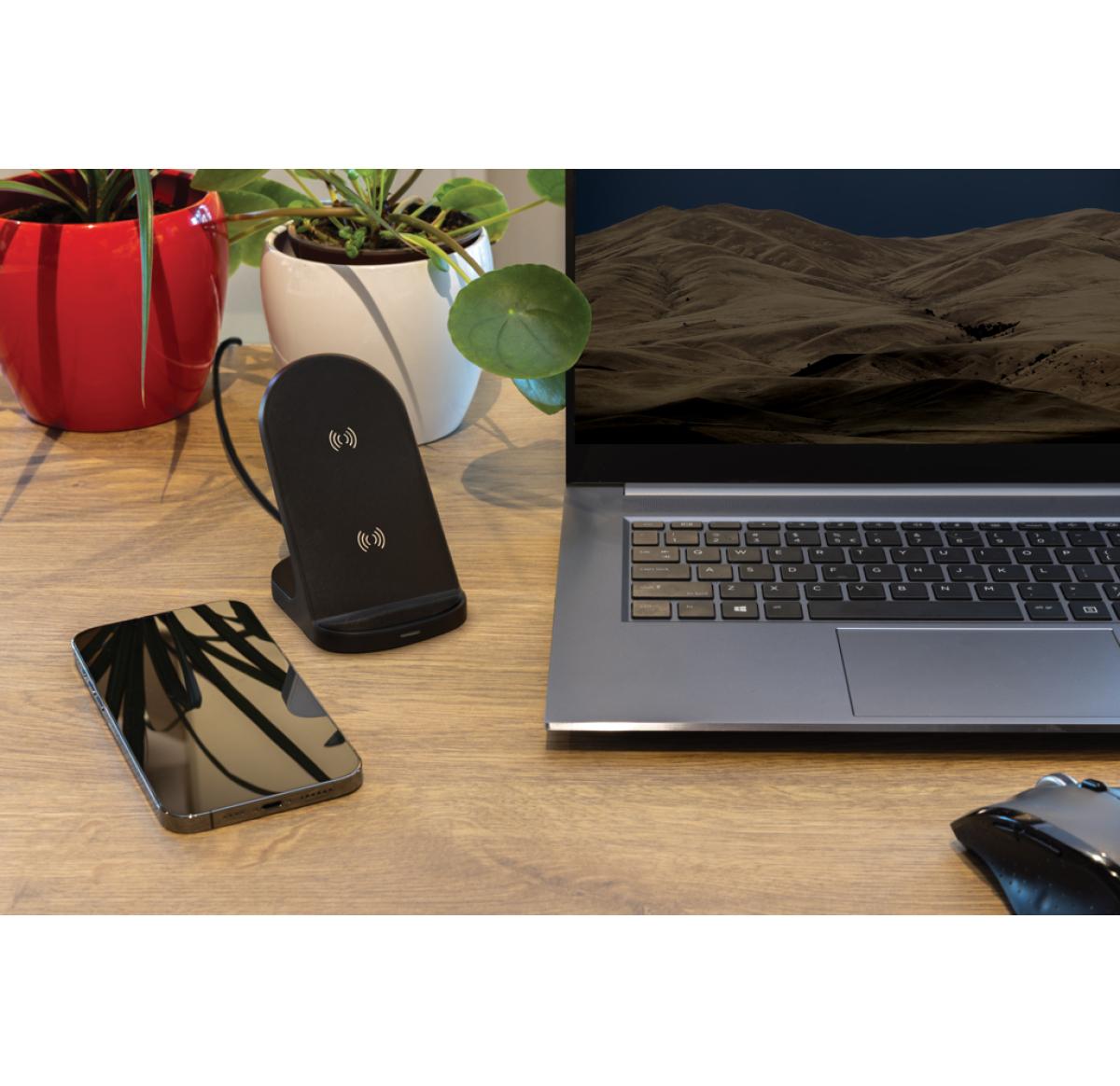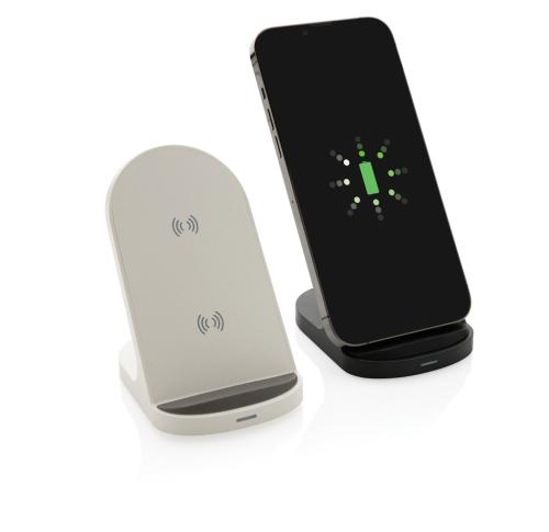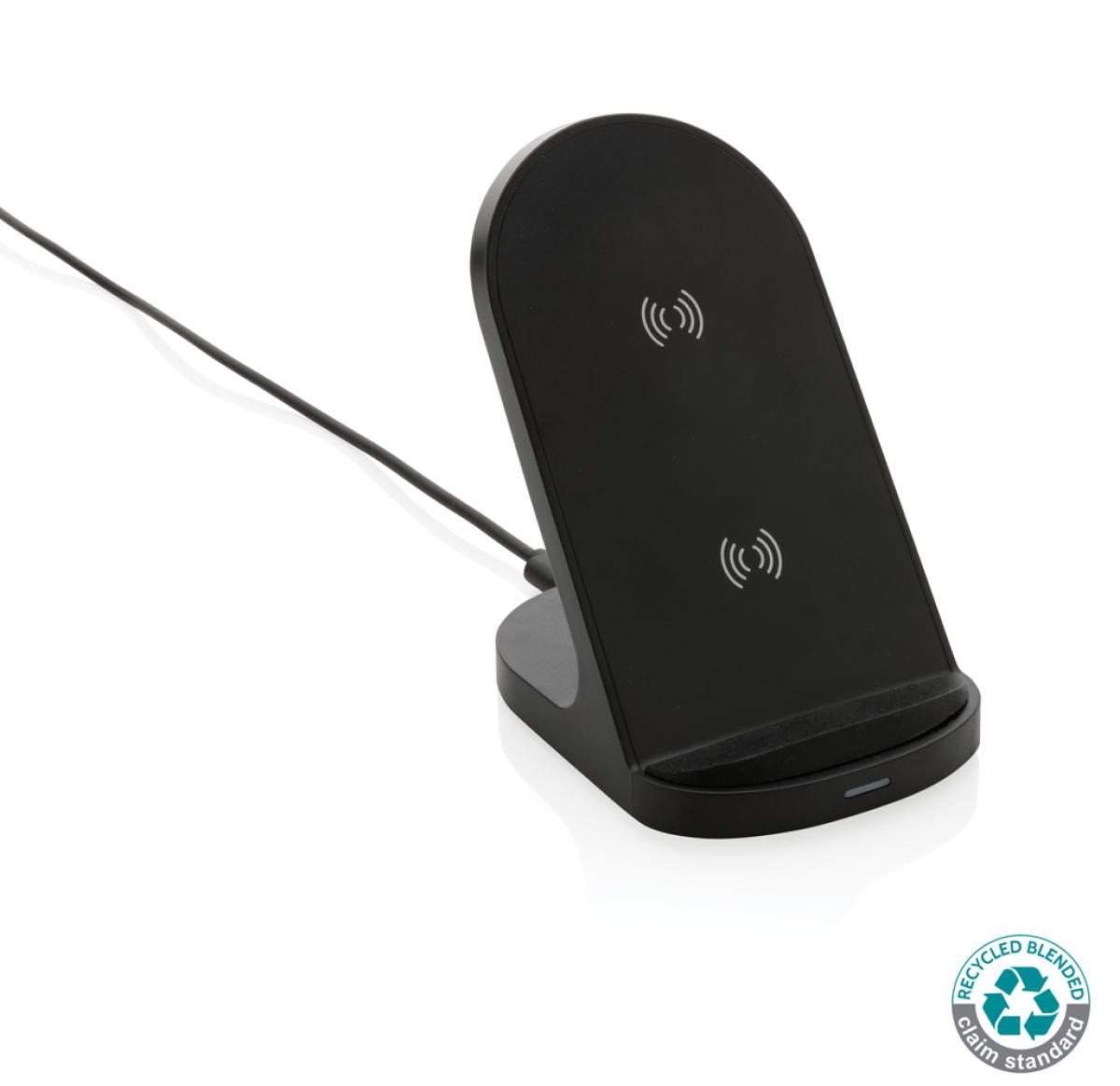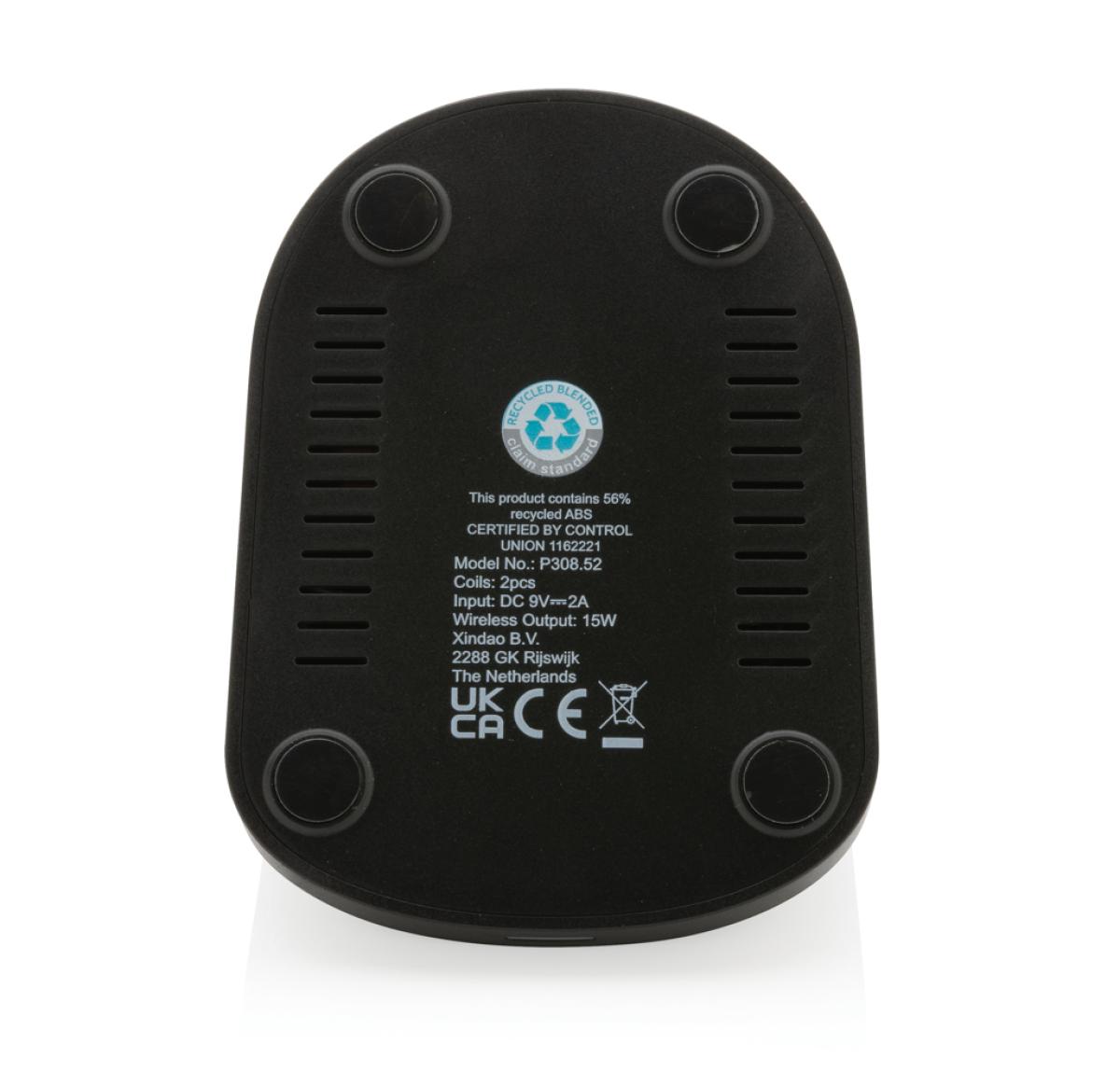 15W wireless fast charger stand with two integrated charging coils. The stand supports both horizontal as well as vertical charging. Made with RCS (Recycled Claim Standard) certified recycled materials. Total recycled content: 56% based on total item weight. RCS certification ensures a completely certified supply chain of the recycled materials. Including 150 cm PVC free recycled TPE material charging cable. ; Item and accessories 100% PVC free. Packed in FSC mix packaging. Wireless charging compatible with Android latest generations, iPhone 8 and up. Input: 12V/1.67A. Wireless Output: 9V/1.5A 15W.