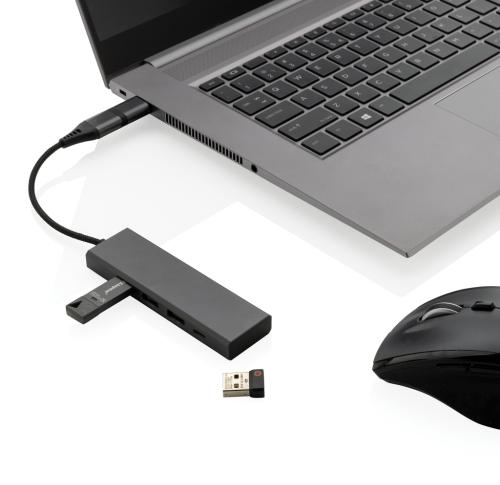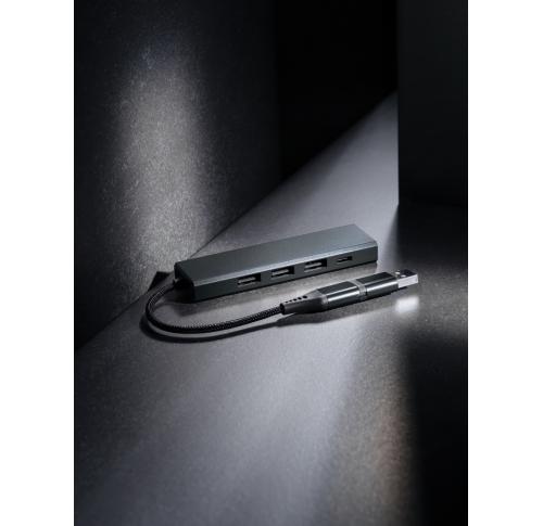 Aluminum USB hub made with RCS (Recycled Claim Standard) certified recycled aluminum, ABS, TPE and PET. With 3 USB A 2.0 ports and 1 type C port. The HUB has an integrated 10 cm cable made from recycled RCS certified TPE/PET material. Total recycled content: 75% based on total item weight. RCS certification ensures a completely certified supply chain of the recycled materials. With dual input connector so it is suitable for both type C and USB A computers. Aluminum does not lose its characteristics in the recycling process and can be recycled endlessly. Item and accessories 100% PVC free. Packed in FSC mix packaging.