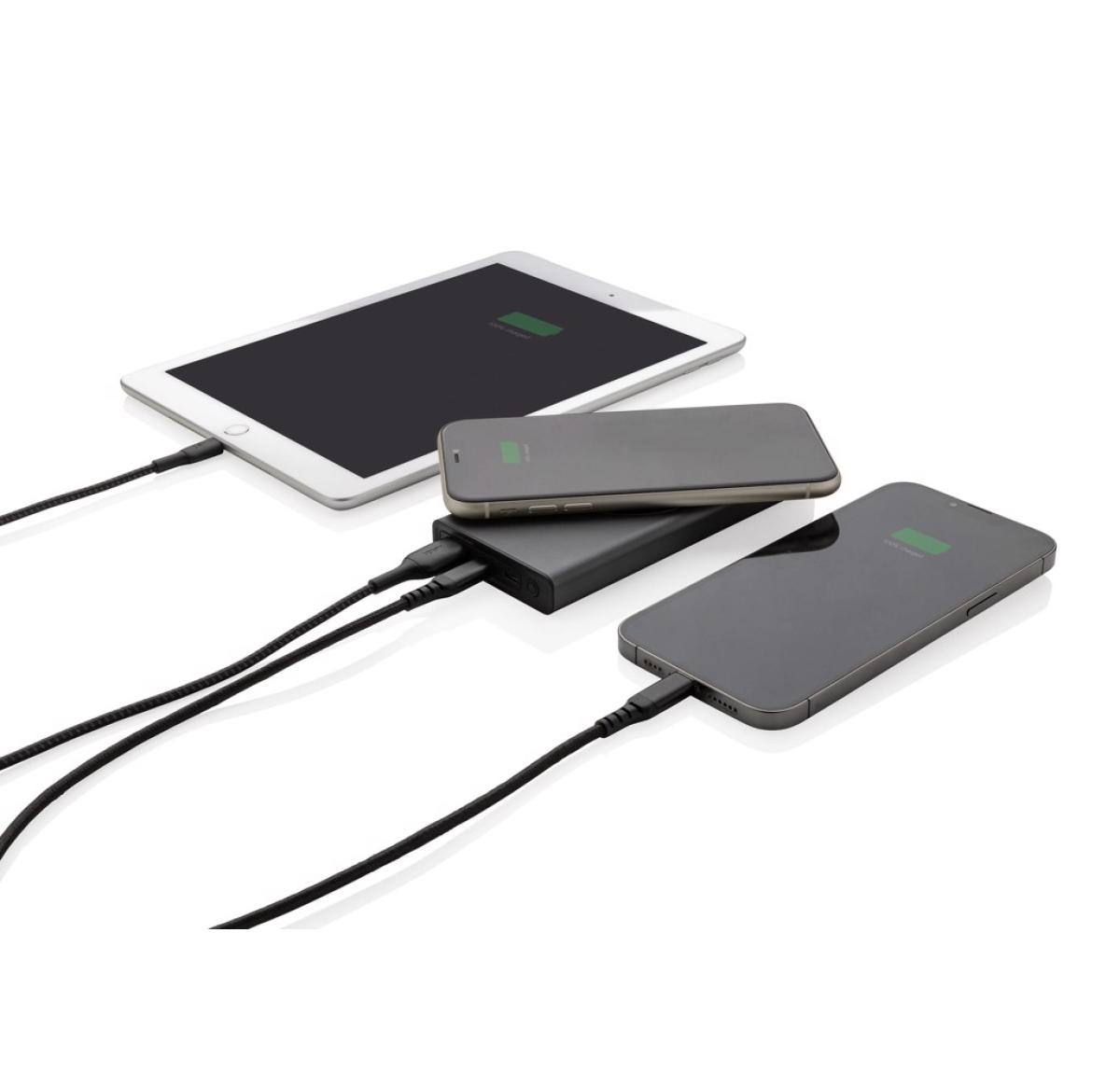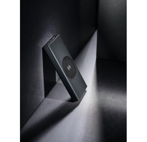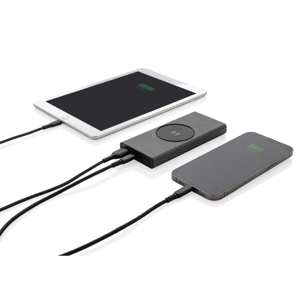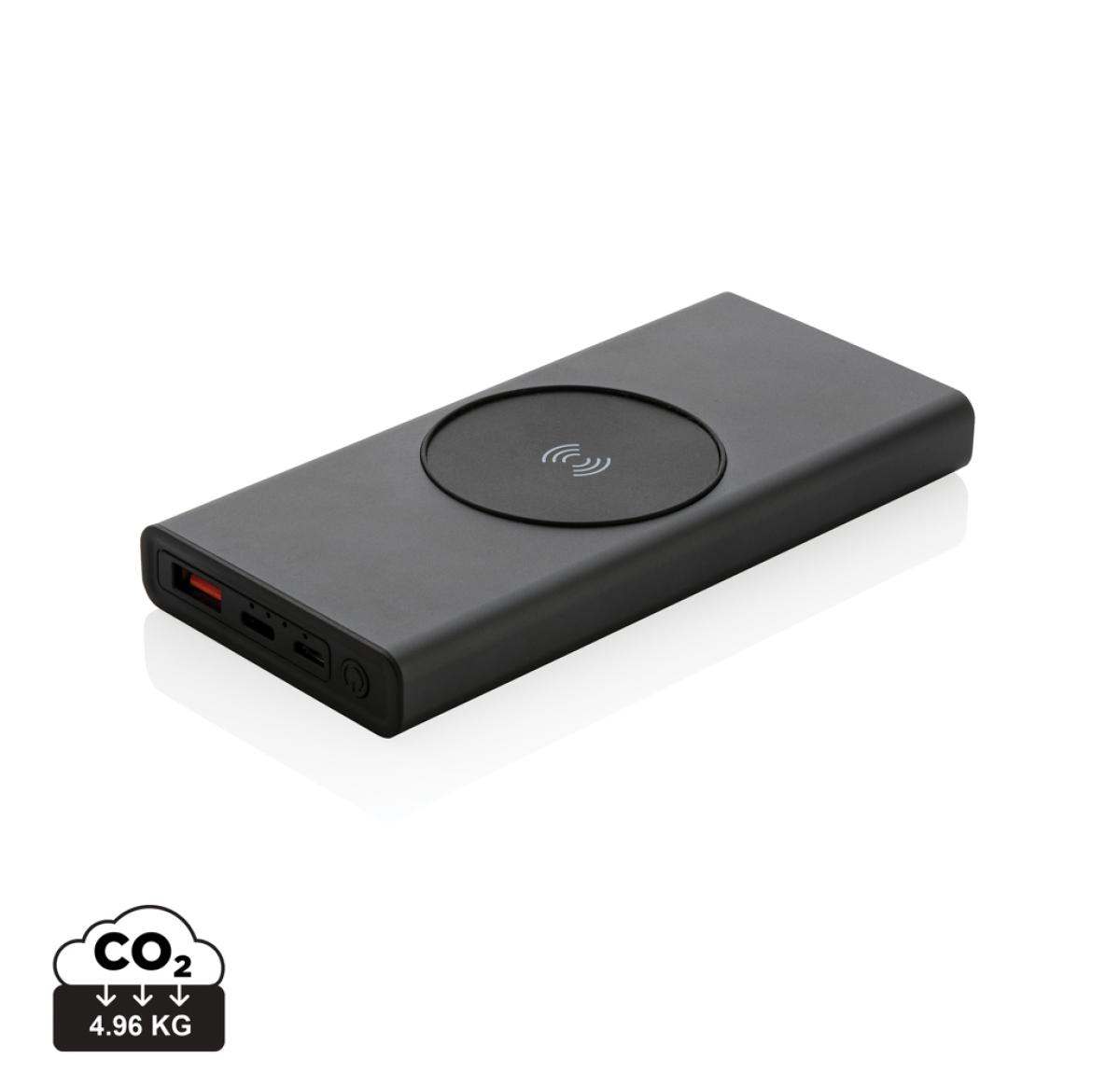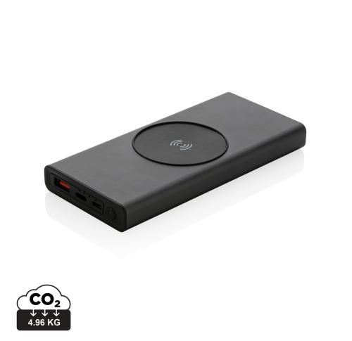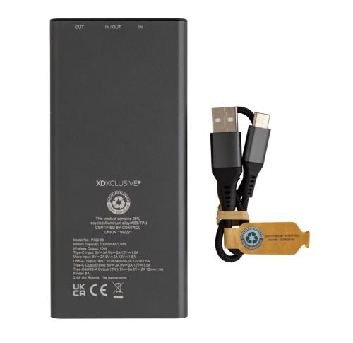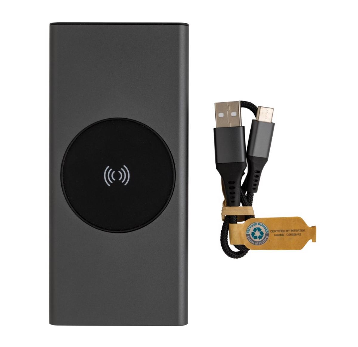 Ultra-fast charging powerbank made with RCS (Recycled Claim Standard) certified recycled aluminum and ABS. Total recycled content: 28% based on total item weight. RCS certification ensures a completely certified supply chain of the recycled materials. Aluminum does not lose its characteristics in the recycling process and can be recycled endlessly. The powerbank contains a long-lasting grade A 10.000 mAh lithium polymer battery. The C output port supports fast charging up to 18W and also fast re-charging within 3 hours. The wireless charger supports wireless charging up to 10W. The power indicators will indicate the remaining energy level so you always know when to re-charge. Item and accessories 100% PVC free. Including type C charging cable made from RCS certified recycled aluminum, TPE and PET. Packed in FSC?? mix packaging. USB output 5/3A, 9V/2A. 12V/1.5A. Type C output: 5V/3A, 9V/2A, 12V/1.5A. Type C input: 5V/3A, 9V/2A, 12V/1.5A. Micro USB input: 5V/2A, 9V/2A, 12V/1.5A.