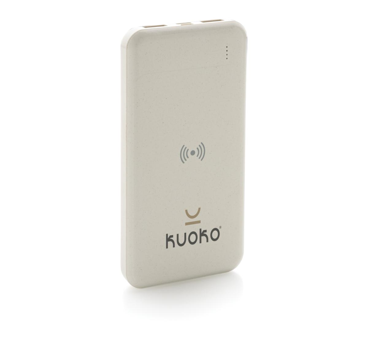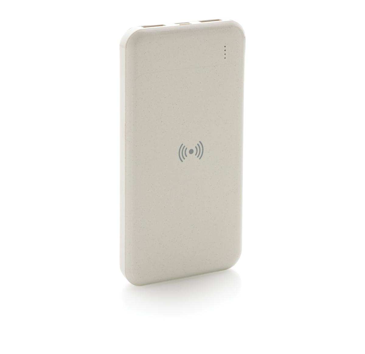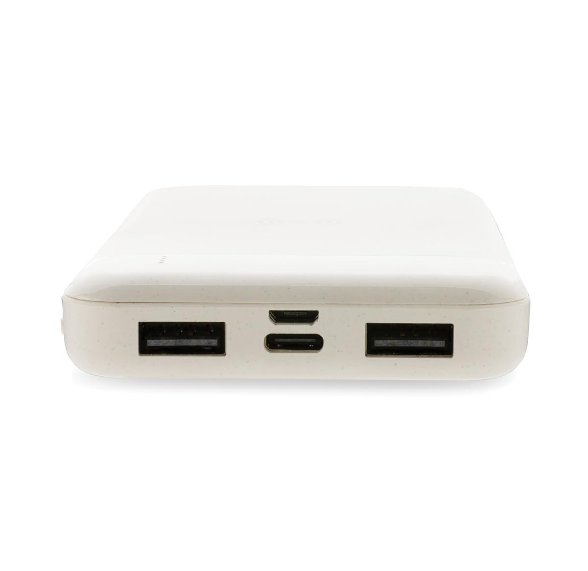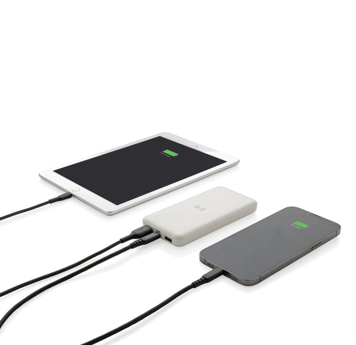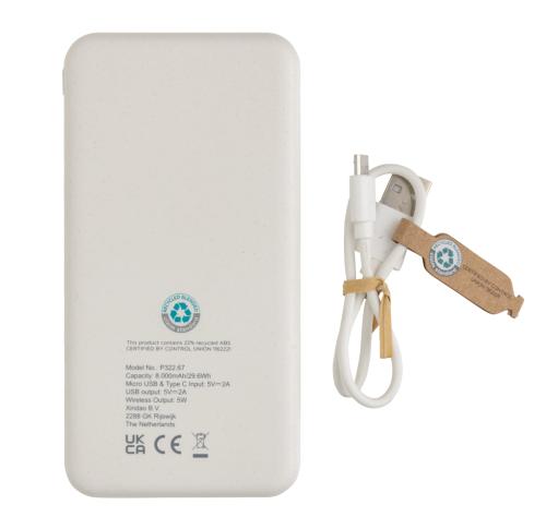 8.000 mAh powerbank with 5W wireless charger where the case is made out of RCS certified recycled ABS plastic. RCS (Recycled Claim Standard) is a standard to verify the recycled content of a product throughout the whole supply chain. Total recycled content: 22% based on total item weight. When fully charged the powerbank provides you with enough energy to re-charge your mobile phone up to four times. The powerbank contains a long lasting grade A 8.000 mAh lithium polymer battery. The power indicators will indicate the remaining energy level so you always know when to re-charge. Type-C input 5V/2A; Micro USB Input 5V/2A; Wireless Output 5W; 2x USB output 5V/2A; Item and accessories PVC free. Including PVC free recycled TPE material charging cable.