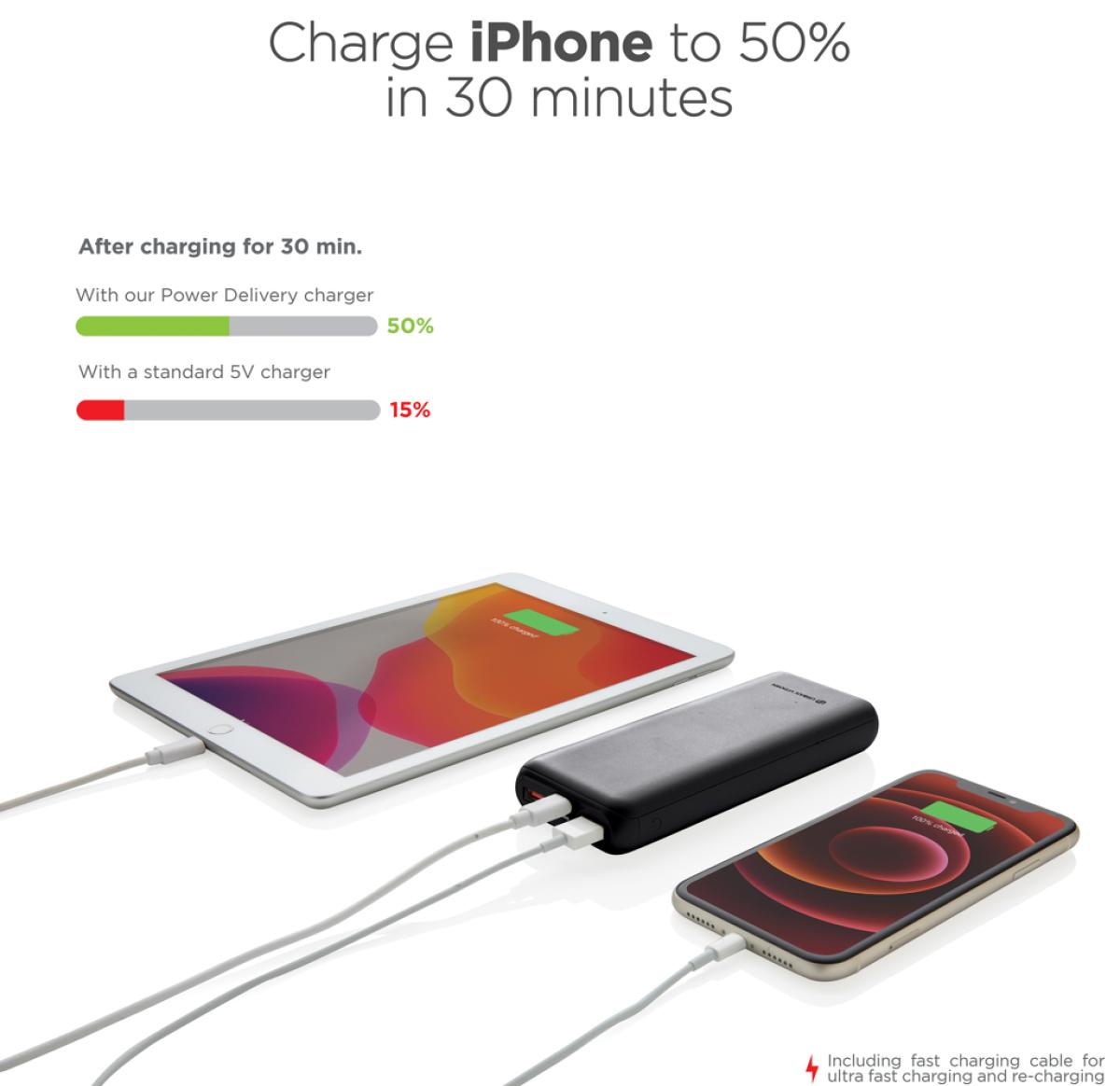 Charge your phone up to 5 times with this fast charging powerbank. Thanks to the ultra fast type C 18W PD port, the powerbank re-charges in record time. Charging your phone up to 50% takes only 30 minutes. Slow charging is something from the past. The powerbank contains a long lasting A-grade 20.000 mah battery to charge all your devices on your travels and adventures. The double USB A and type C port allow you to charge up to 3 devices at the same time. Urban Vitamin items are made without PVC and packed in plastic reduced packaging. Type-C Input: 5V/3A, 9V/2A; Micro USB Input: 5V/2A, 9V/2A; Type-C Output: 5V/3A, 9V/2A, 12V/1.5A; USB Output: 5V/2.4A, 9V/2A, 12V/1.5A.