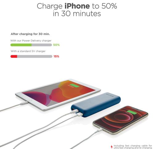 Charge your phone up to 5 times with this fast charging powerbank. Thanks to the ultra fast type C 18W PD port, the powerbank re-charges in record time. Charging your phone up to 50% takes only 30 minutes. Slow charging is something from the past. The powerbank contains a long lasting A-grade 20.000 mah battery to charge all your devices on your travels and adventures. The double USB A and type C port allow you to charge up to 3 devices at the same time. Urban Vitamin items are made without PVC and packed in plastic reduced packaging. Type-C Input: 5V/3A, 9V/2A; Micro USB Input: 5V/2A, 9V/2A; Type-C Output: 5V/3A, 9V/2A, 12V/1.5A; USB Output: 5V/2.4A, 9V/2A, 12V/1.5A.