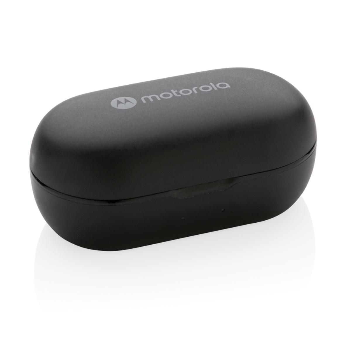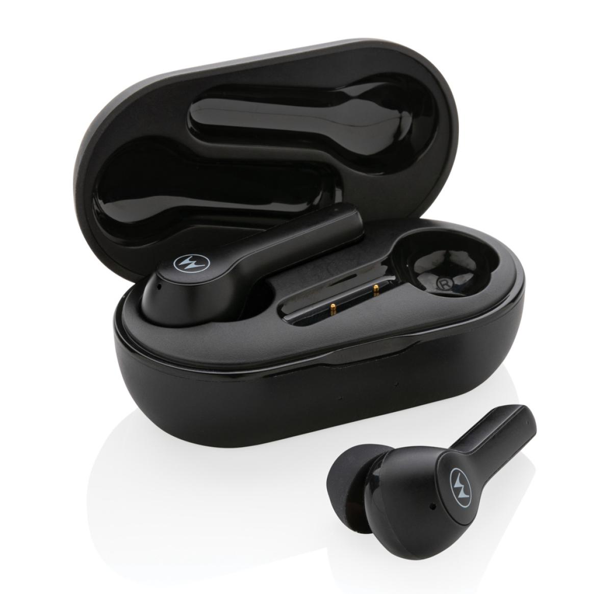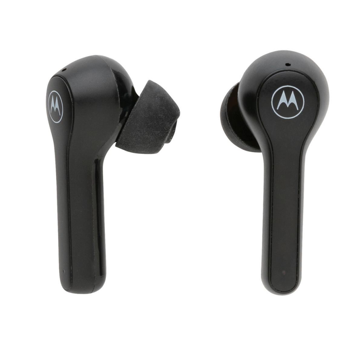 Motorola BT2.0 TWS. Ergonomic fit earphones. Designed for comfort and secure fit. With touch control. 6 hours playtime on the earbuds and 15hours in the case. Microphone for handsfree calls. With smart voice assistant. Siri and Google Assistant.