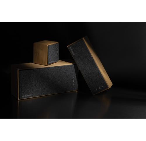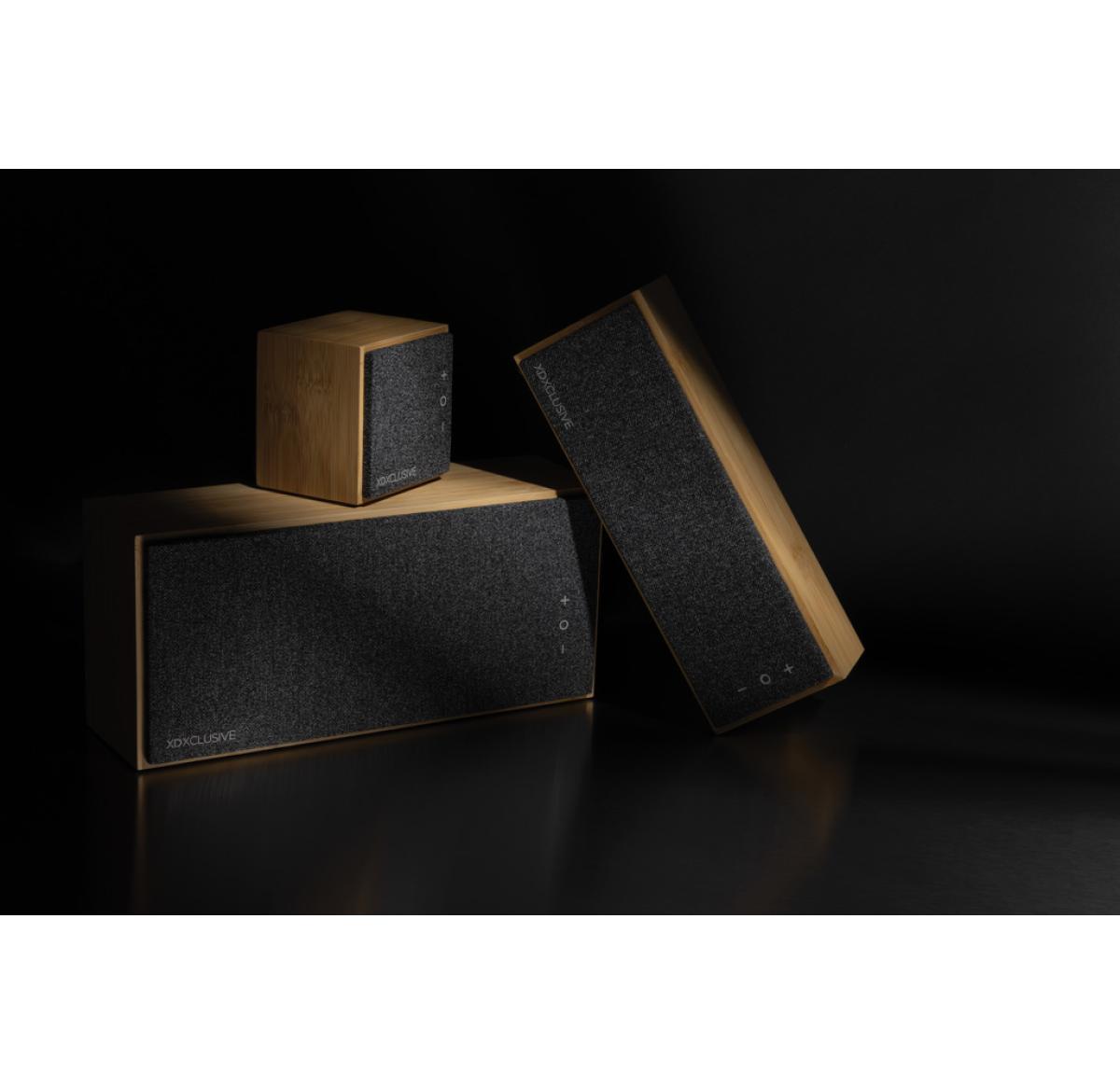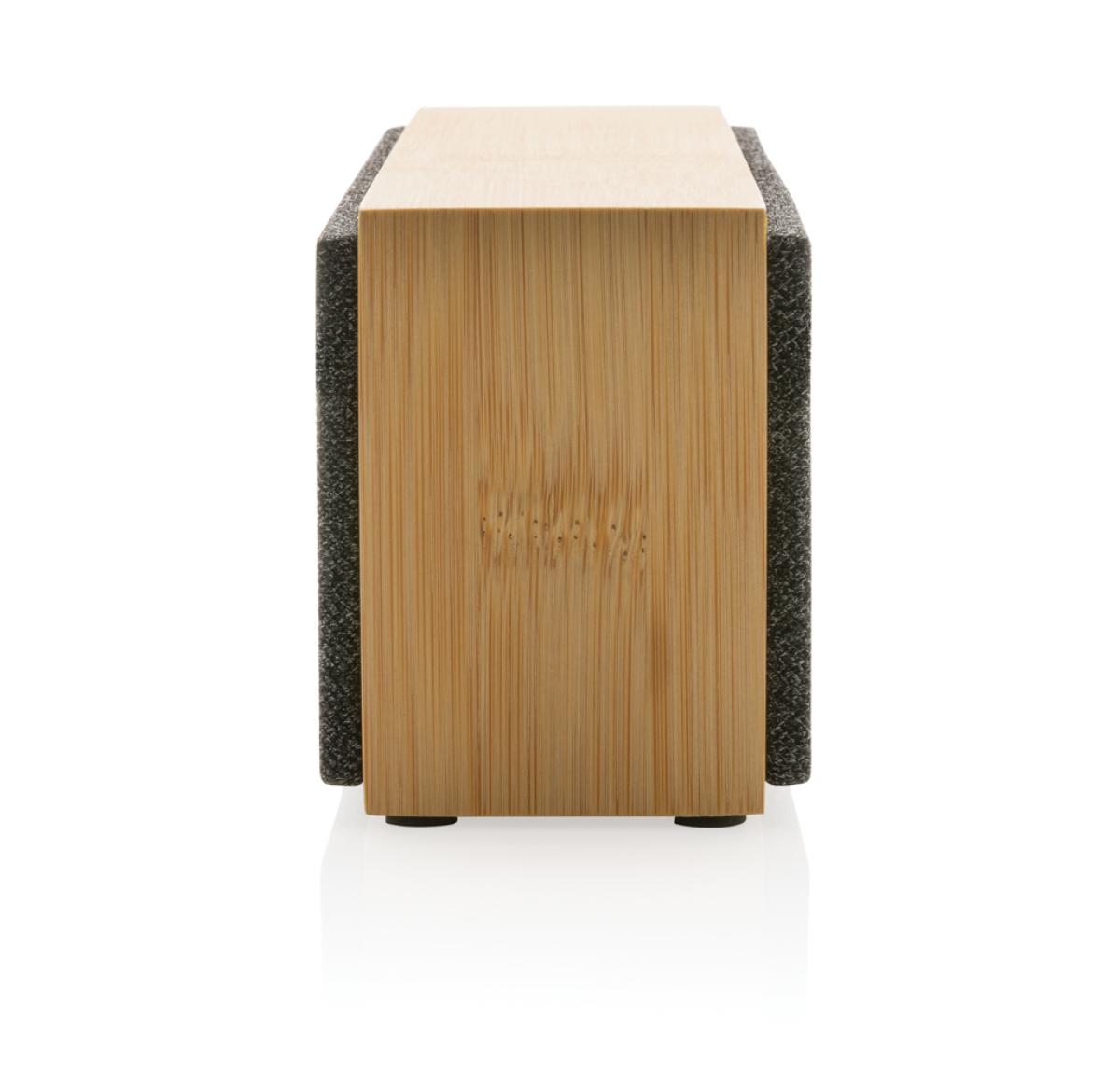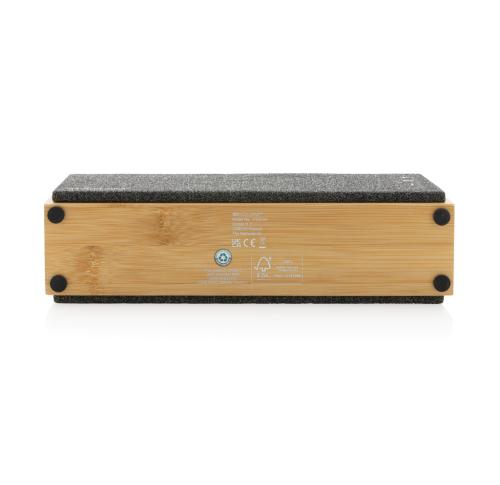 Luxury 10W speaker with clear sound and strong bass. The outer casing is made from FSC 100% certified bamboo. The plastic components are made with RCS (Recycled Claim Standard) certified recycled ABS. Total recycled content: 23 % based on total item weight. RCS certification ensures a completely certified supply chain of the recycled materials. The speaker comes with BT 5.1 for easy and smooth operation up to 10 metres and low power consumption. The 1200 mah battery allows a playtime up to 6 hours and can be fully re-charged in 2 hours. With pick up function and mic to answer (video) calls. Packed if FSC mix kraft box. Including RCS certified recycled TPE charging cable.