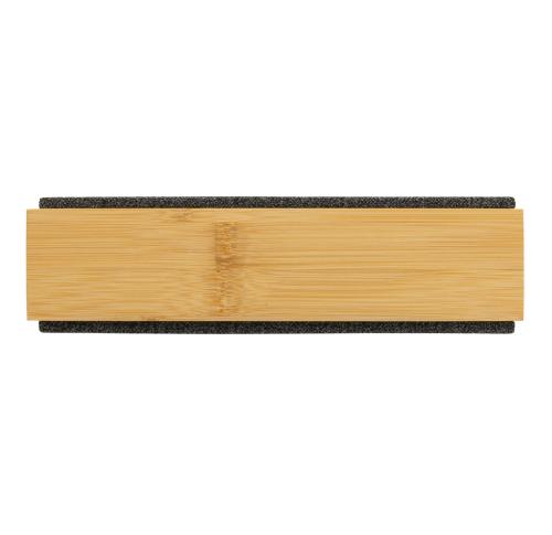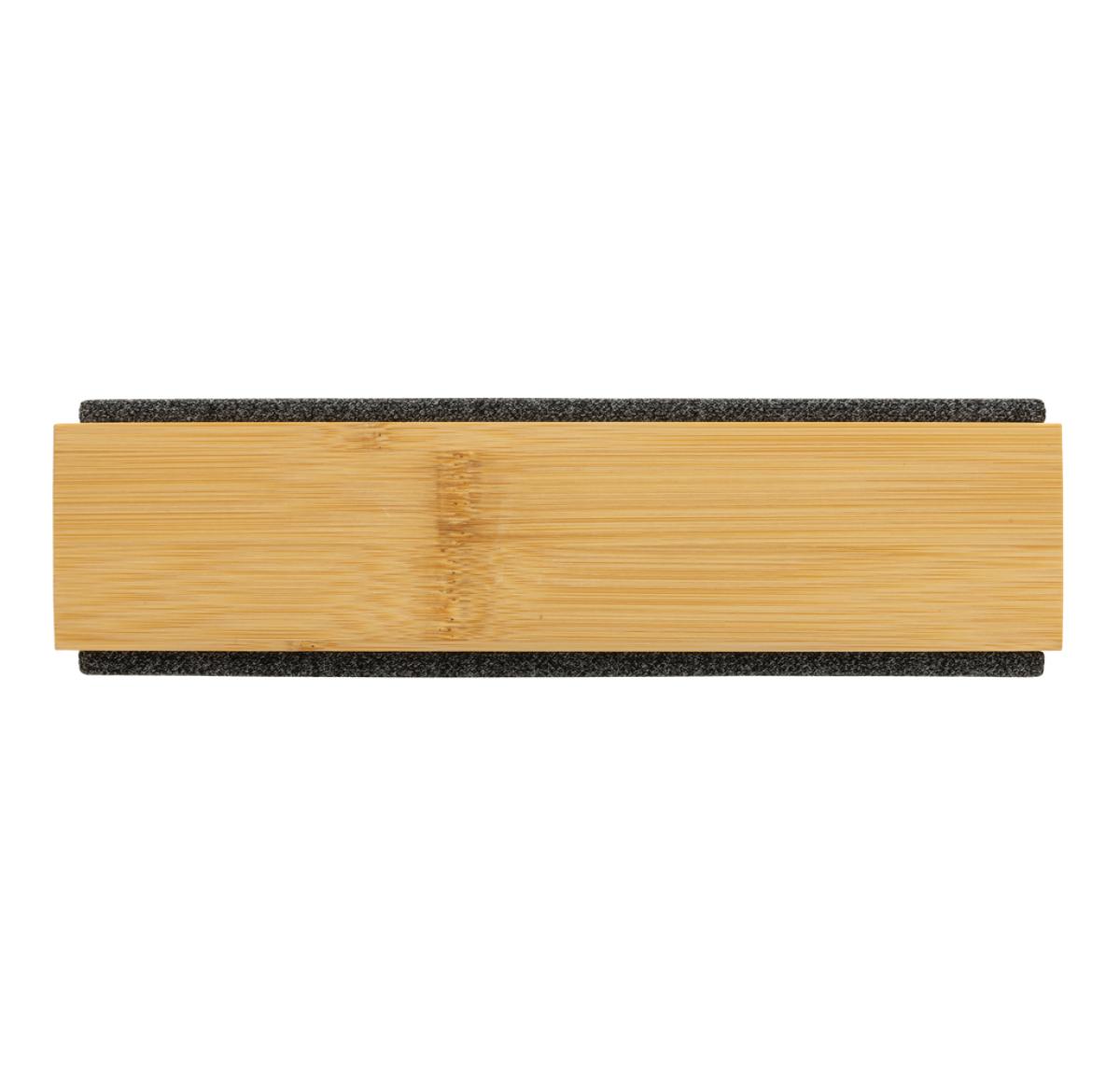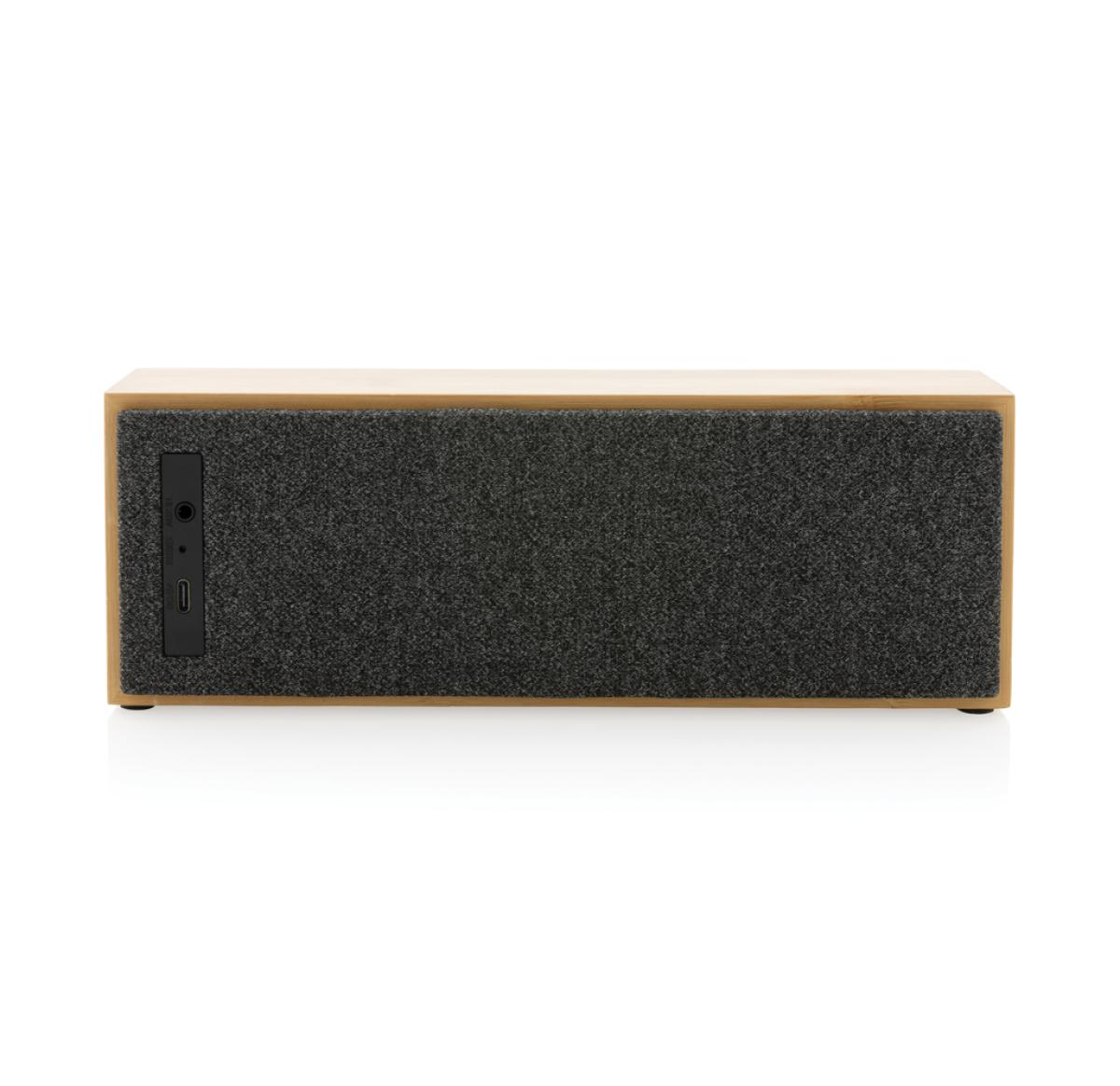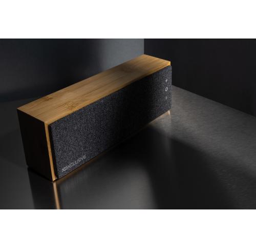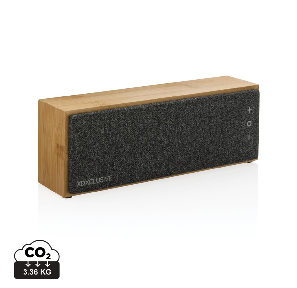 Luxury 10W speaker with clear sound and strong bass. The outer casing is made from FSC 100% certified bamboo. The plastic components are made with RCS (Recycled Claim Standard) certified recycled ABS. Total recycled content: 23 % based on total item weight. RCS certification ensures a completely certified supply chain of the recycled materials. The speaker comes with BT 5.1 for easy and smooth operation up to 10 metres and low power consumption. The 1200 mah battery allows a playtime up to 6 hours and can be fully re-charged in 2 hours. With pick up function and mic to answer (video) calls. Packed if FSC mix kraft box. Including RCS certified recycled TPE charging cable.