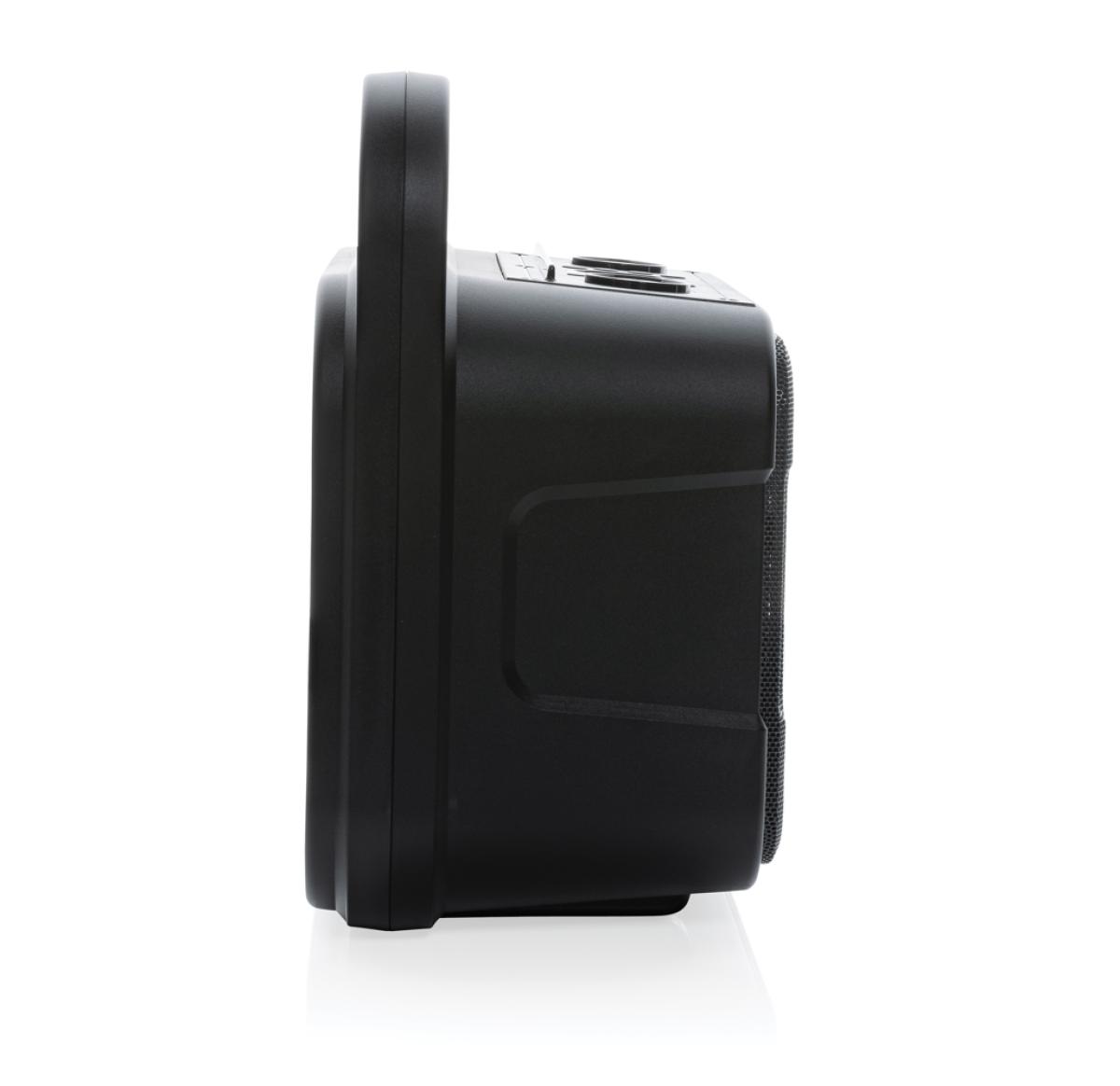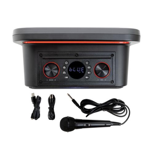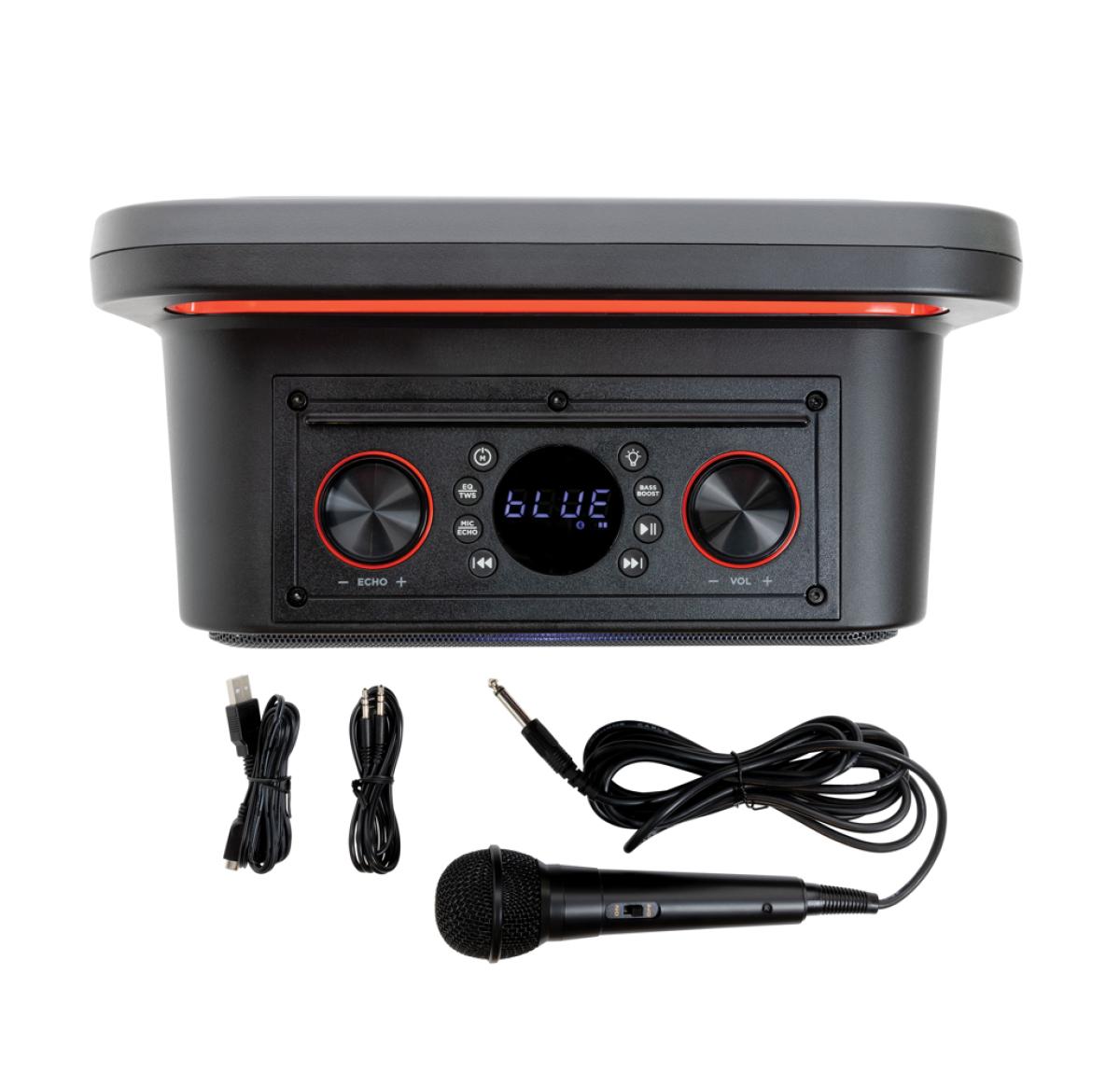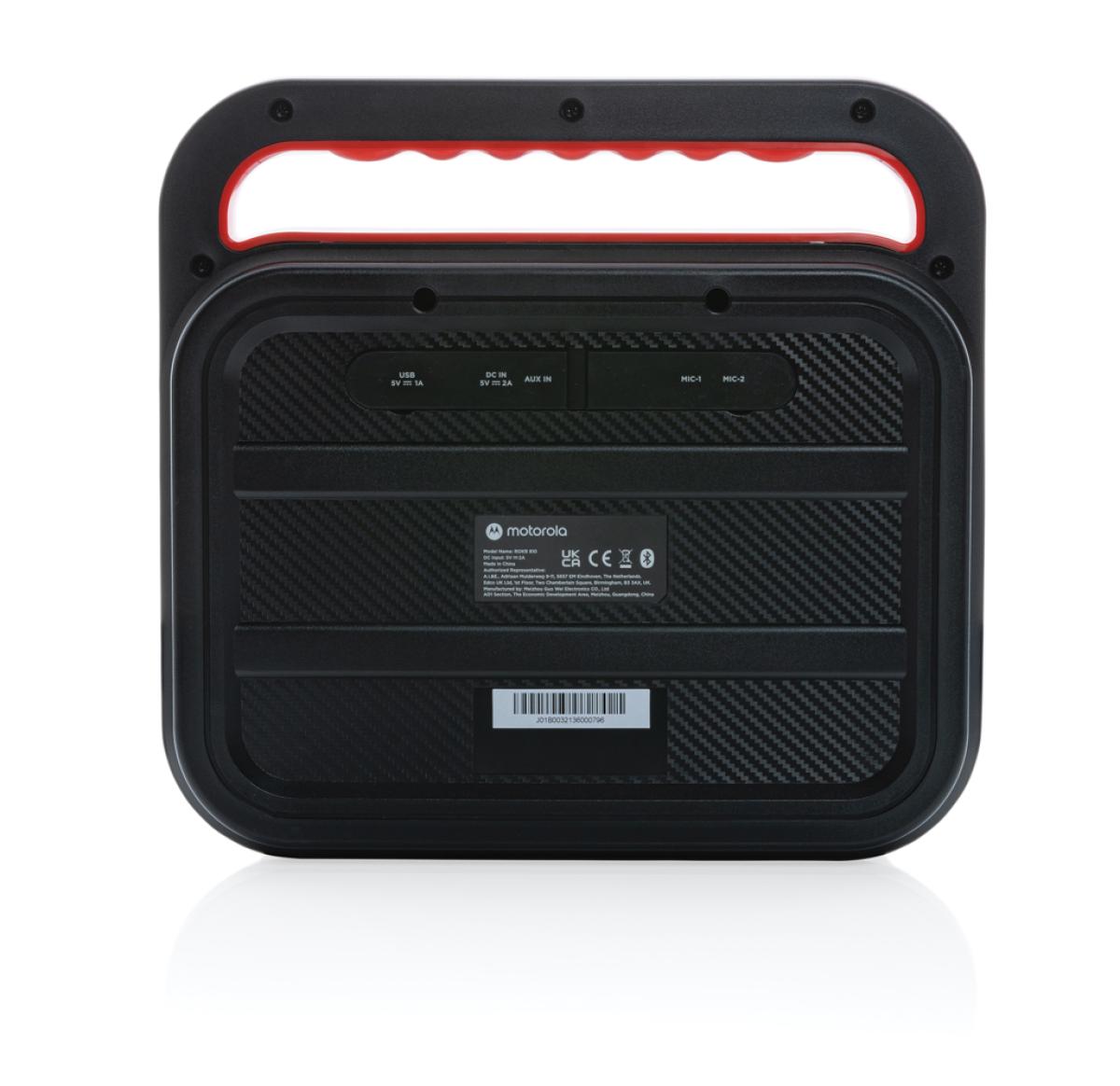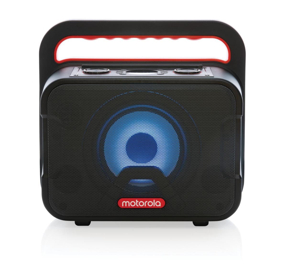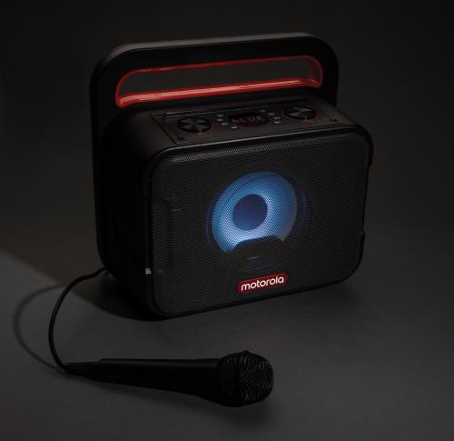 The Motorola Sound ROKR 810 speaker is completely wireless and has a Bluetooth 5.0 connection. You can also connect devices via the AUX input. Thanks to the integrated handle, you can easily take the box with you wherever you go. With its 40W speakers and built-in subwoofer, the ROKR 810 speaker delivers great sound and bass for a room-filling music experience.The Motorola Sound ROK R810 Wireless Box has up to 20 hours of play time. So that you and your party guests can enjoy the music and your karaoke skills for as long as possible. The Motorola Sound ROKR 810 wireless speaker has built-in LEDs in 6 different colours. When you play music through the box, the LED lights dance happily to the rhythm of the music. The Motorola Sound ROKR 810 comes with a real karaoke microphone that you can connect via the AUX input. Packed in Motorola Giftbox.