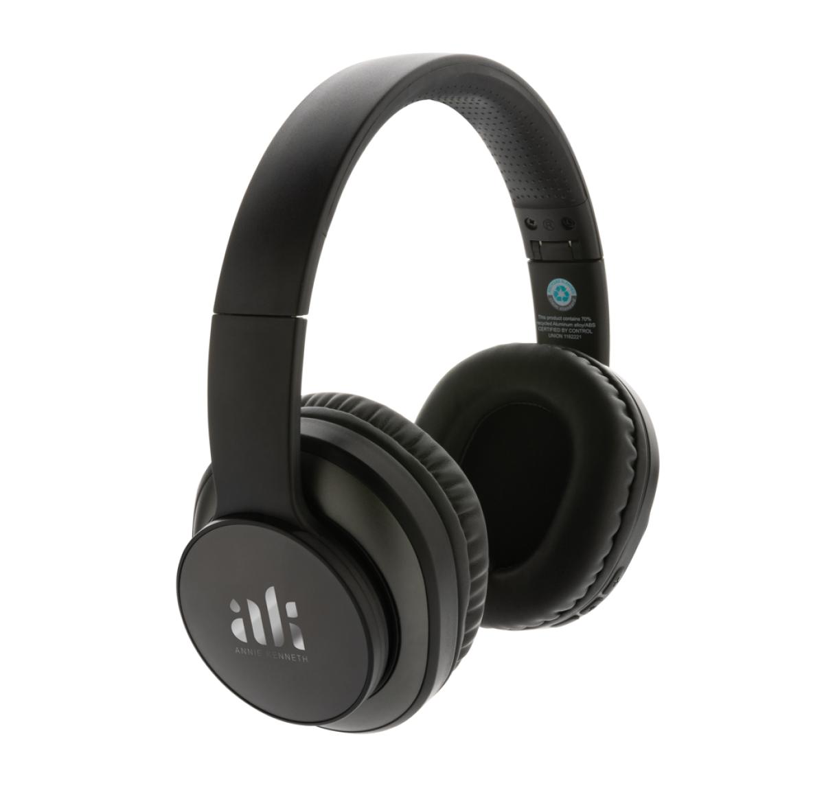 Foldable wireless headphone and strong bass. Made with RCS (Recycled Claim Standard) certified recycled aluminum and ABS. Total recycled content: 70% based on total item weight. RCS certification ensures a completely certified supply chain of the recycled materials. Aluminum does not lose its characteristics in the recycling process and can be recycled endlessly. Including recycled type C charging cable made from RCS certified recycled aluminum, TPE and PET. The 600 mah battery allows a playtime up to 15 hours and can be fully re-charged in 2 hours. With BT 5.3 for smooth connection up to 10 metres. Packed in FSC?? mix packaging. Item and accessories 100% PVC free.